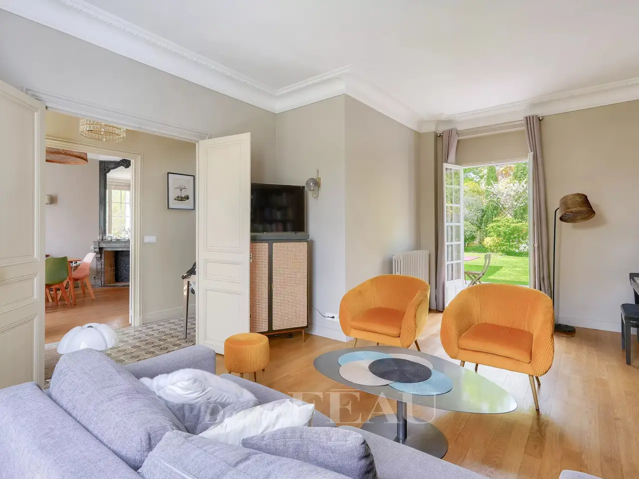 This delightful 1930’s millstone-built property located in a peaceful neighbourhood near the shops was renovated throughout in 2021 and is in very good condition. Set in a 369 sqm plot, it offers about 182 sqm of living space including a living/reception room with a fireplace opening onto the garden, a dining room and a kitchen. Upstairs are three spacious bedrooms, a bathroom and a shower room. The top floor comprises two further bedrooms (one particularly spacious), and a bathroom. On a basement with a garage, a utility/boiler room and a cellar. An ideal family home a short distance west of the capital.