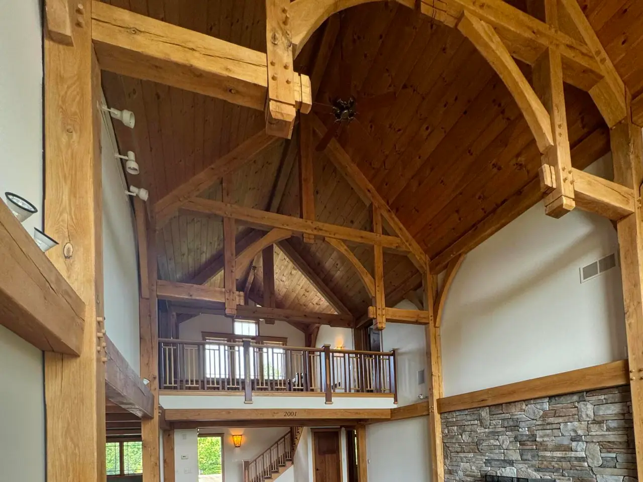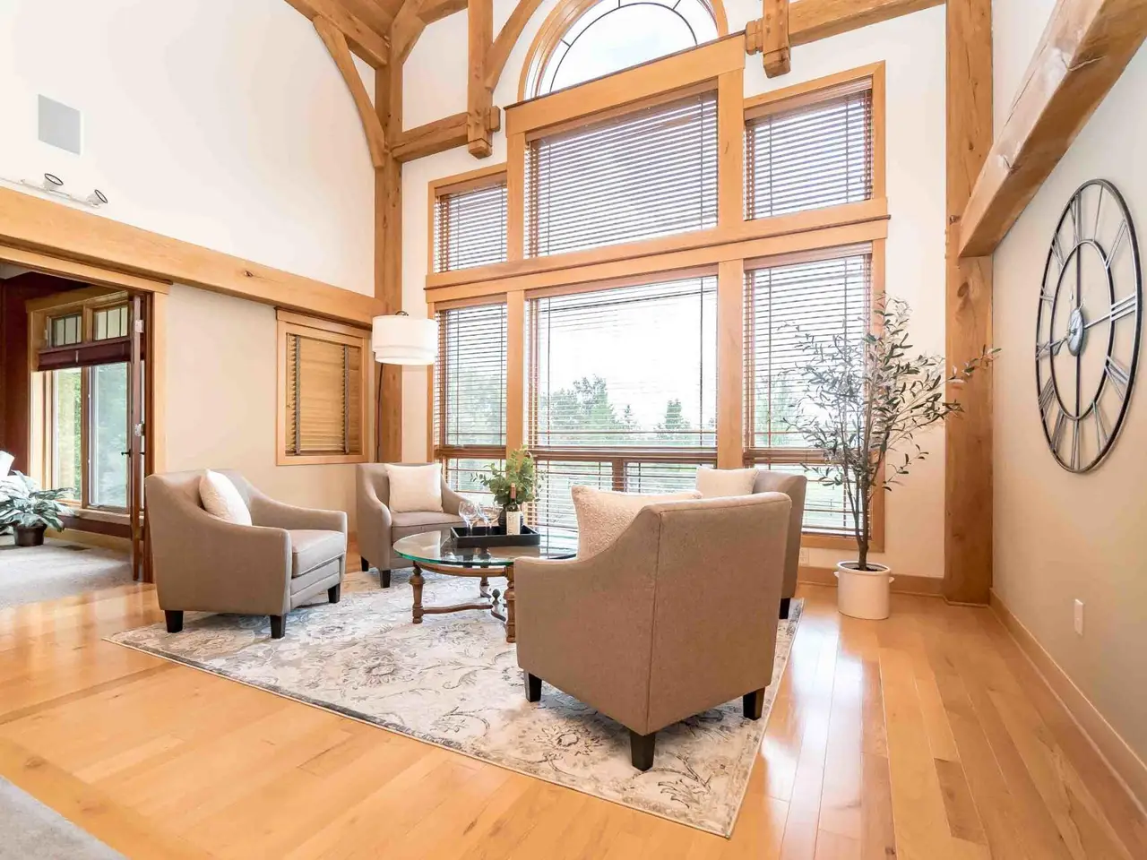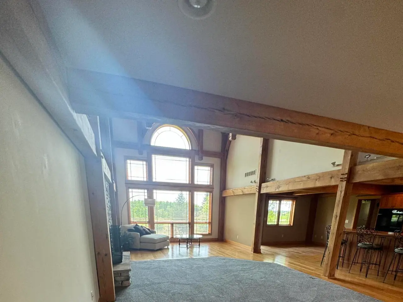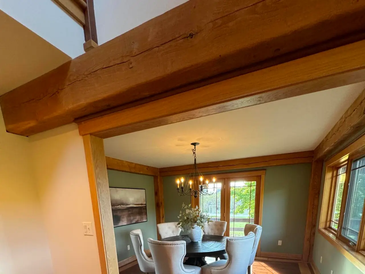 Nestled on a sprawling property, this stunning Timber-frame home offers elegance and modern comfort. With its signature architectural details, exposed beams, wide overhangs, and handcrafted woodwork, this residence exudes charm and craftsmanship. The expansive lot is a nature lover's paradise, offering privacy, lush landscaping, room for horses (or other animals) and plenty of space for outdoor living. Warm hardwood floors and large windows that flood the space with natural light. The gourmet open kitchen features a large center island, a cozy breakfast nook and a formal dining room. The spacious living areas, complete with a stone fireplace and coffered ceilings, create an inviting atmosphere for family gatherings. See new carpet installed! Scroll for updated pictures at the end.