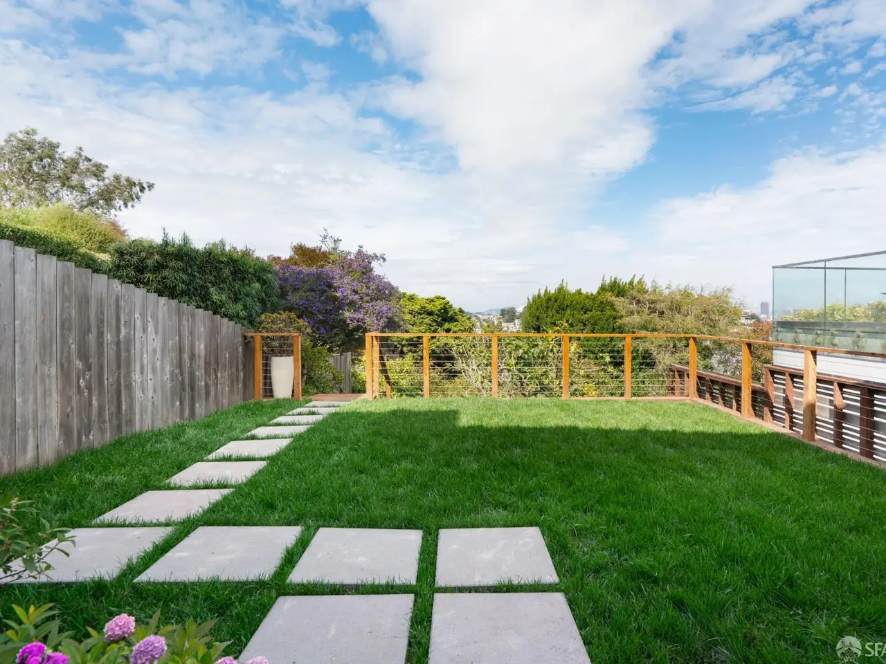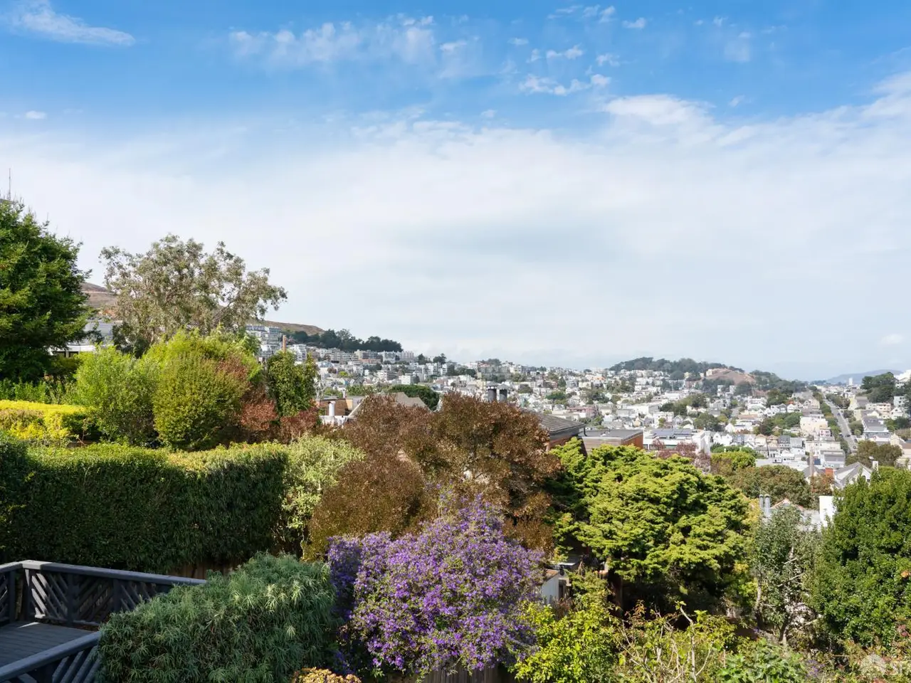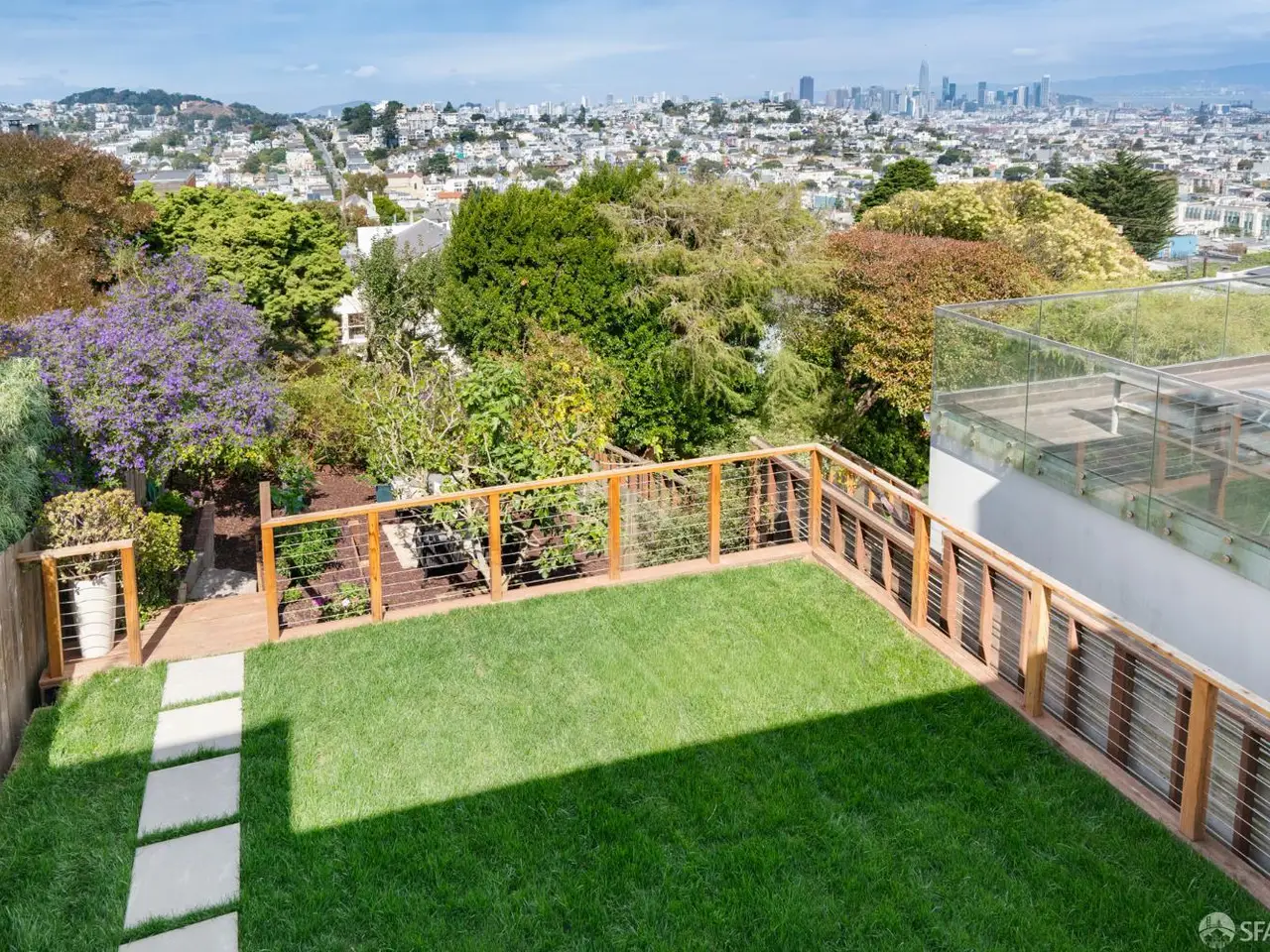 This impeccable mid-century home offers 2 bedrooms, 1 bathroom, a large bonus room and bath and breathtaking views. Set on an extra-deep lot in the Noe Valley hills, the home enjoys panoramic outlooks from Twin Peaks and the San Francisco skyline. Features include front and rear landscaped gardens, wide plank engineered wood floors, dual pane windows, custom lighting and nest thermostat. The main level features a spacious living room with a handsome wood-burning fireplace and a spacious dining area adjacent to a newly remodeled kitchen featuring new quartz counters, custom cabinets, tile backsplash, stainless gas range, hood, dishwasher and 4-door refrigerator. 2 well appointed bedrooms both with city views, and a full bathroom with tub and shower. Downstairs, an additional room and full bath provide flexible space for guests, office, or media. The deep landscaped walk-out rear garden, also with great views, includes a generous lawn, terraced beds, and mature fruit trees-perfect for entertaining or relaxing. Highlights include a one-car garage, laundry, and abundant storage. Close to shopping, dining, cafes and entertainment, access to public transit and freeways. Children and dog lovers and outdoor enthusiasts enjoy many outdoor areas, parks and dog parks