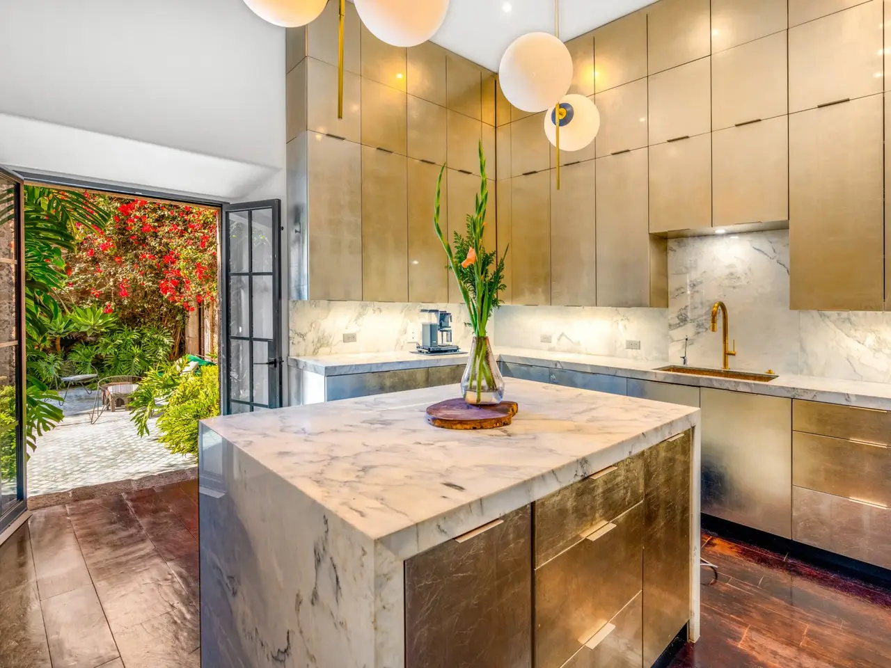 Expansive verdant courtyard with charming water feature