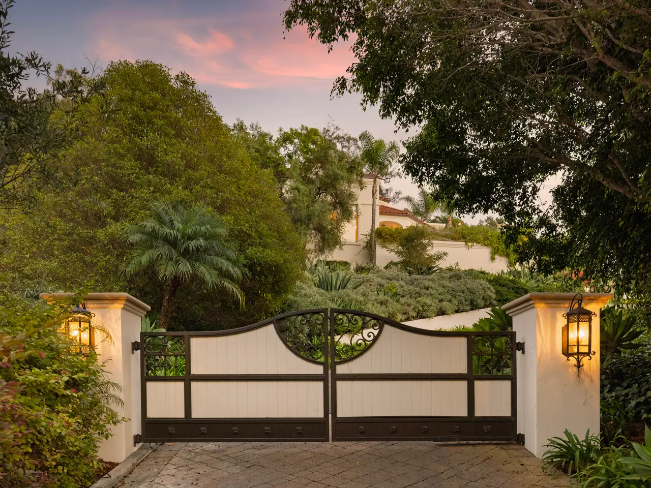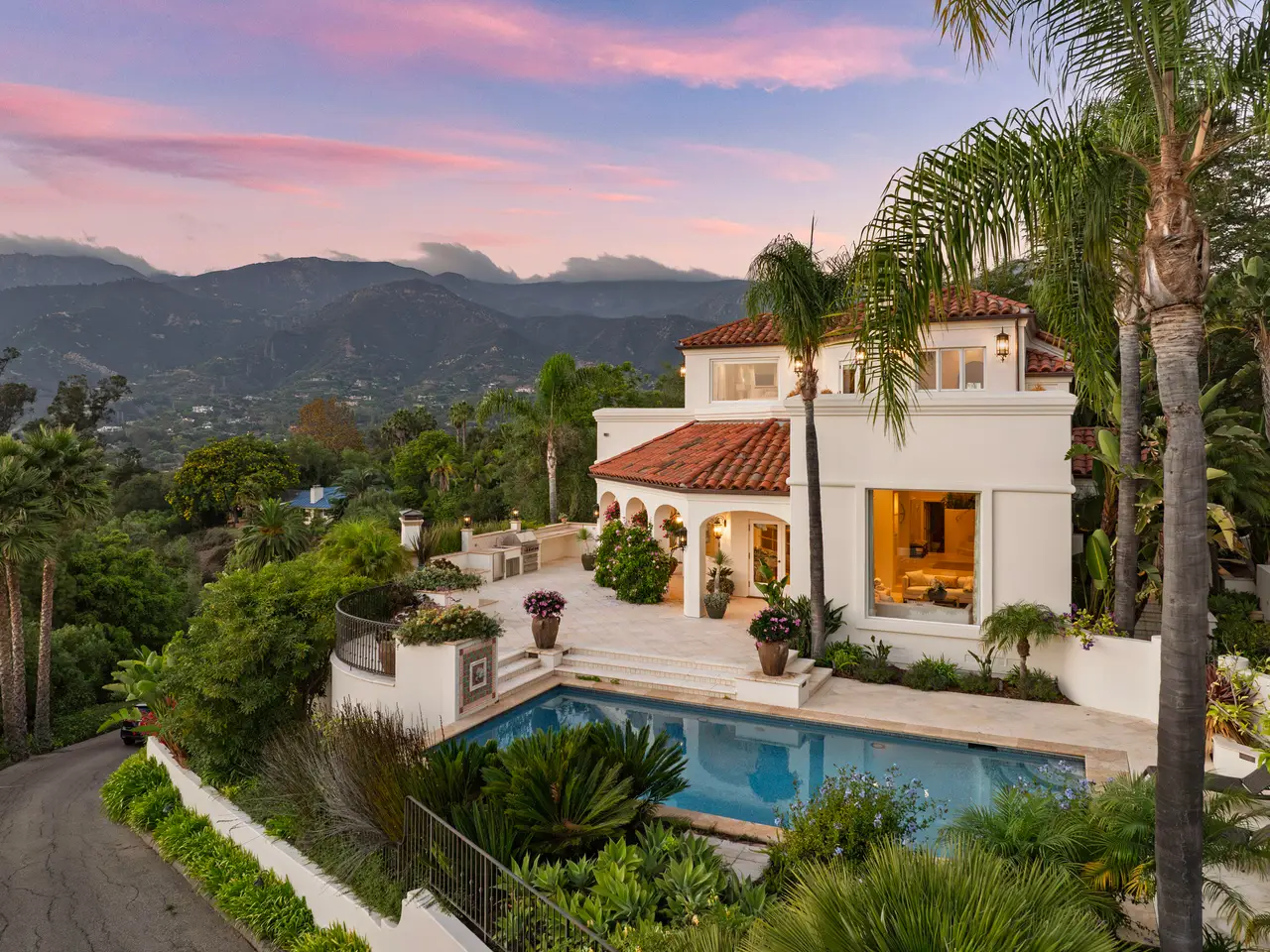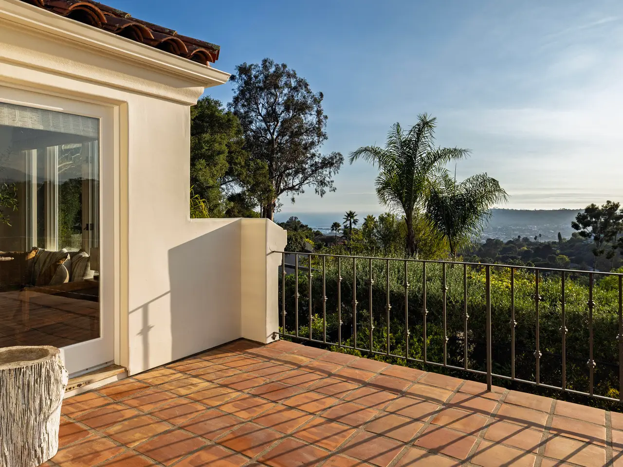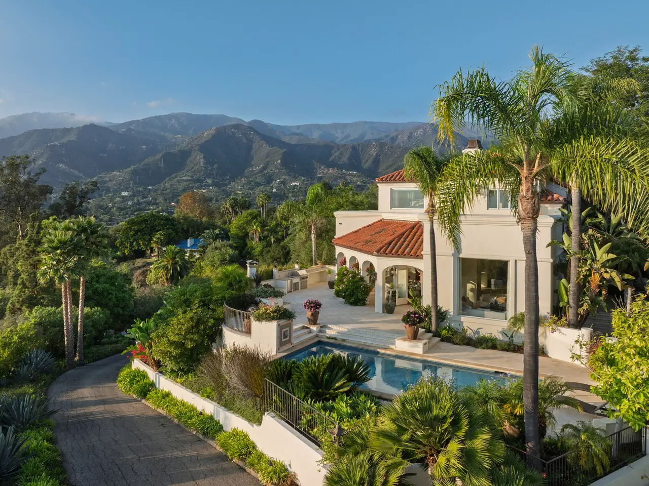 Behind private gates on Calle Elegante, a world of serenity and beauty unfolds on 1.7 lush acres. The moment you step inside, walls of glass reveal sweeping views of the ocean, islands, harbor, and mountains--reminders that this is no ordinary home, but a sanctuary elevated by nature itself. The story begins in the heart of the house, where soaring ceilings, stone floors, and a fireplace anchor the formal living room. Light pours in, filling the space with warmth, while the dining and family rooms blend seamlessly with the kitchen, creating an open, effortless flow for gatherings both large and small. Upstairs, the primary suite continues the story of retreat and renewal. With its own sitting room, private fireplace, and adjoining office, it's a place to wake slowly to the sunrise or wind down as the evening light paints the horizon. Two additional en-suite bedrooms carry the story further: one with doors that open directly to a secret garden hideaway, and the other framing the drama of the mountains. Step outside, and the home transforms into a private resort carved into the hillside. Inspired by the love of the Bacara Resort, the current owner designed the pool terrace to rival the luxury of a five-star retreat without ever leaving home. A sparkling pool shimmers in the sunlight, anchored by a covered patio with outdoor fireplace, a fully equipped outdoor kitchen, and multiple lounge areas. Here, mornings begin with quiet coffee overlooking the coastline, and evenings end with golden sunsets shared among friends. For visitors, a private guest suite above the garage offers decks, views, and independence a retreat within a retreat. Surrounding it all are lovely gardens, a koi pond, and mature trees that have grown into characters of their own, wrapping the home in shade, color, and year-round beauty.This is a home designed not just to live in, but to live well. Located in the sought-after Cold Spring School District, it blends elegance with comfort, privacy with welcome, and luxury with nature an everyday escape on Calle Elegante.