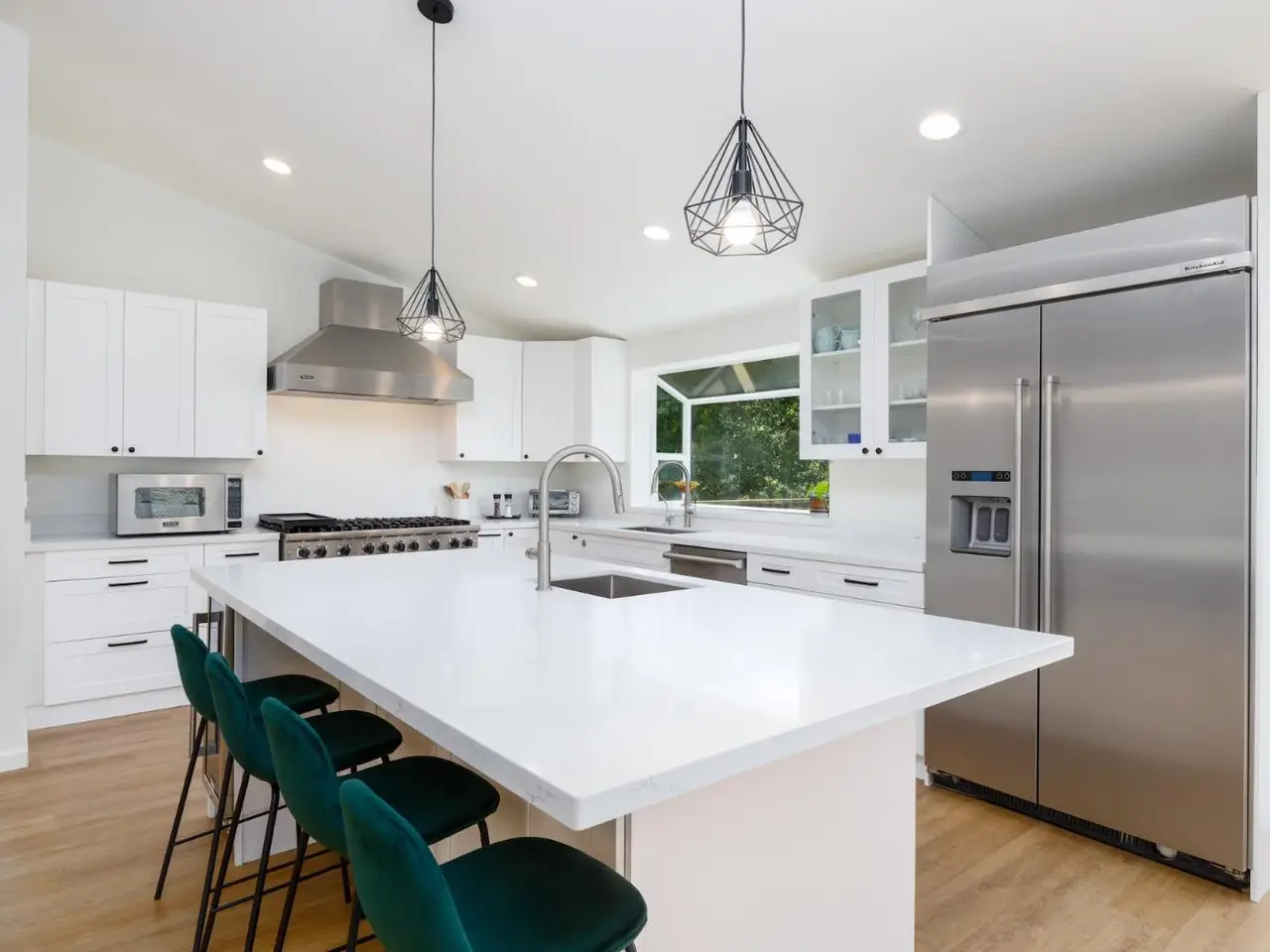 Redesigned kitchen with new cabinets, countertops, island, and wine fridge