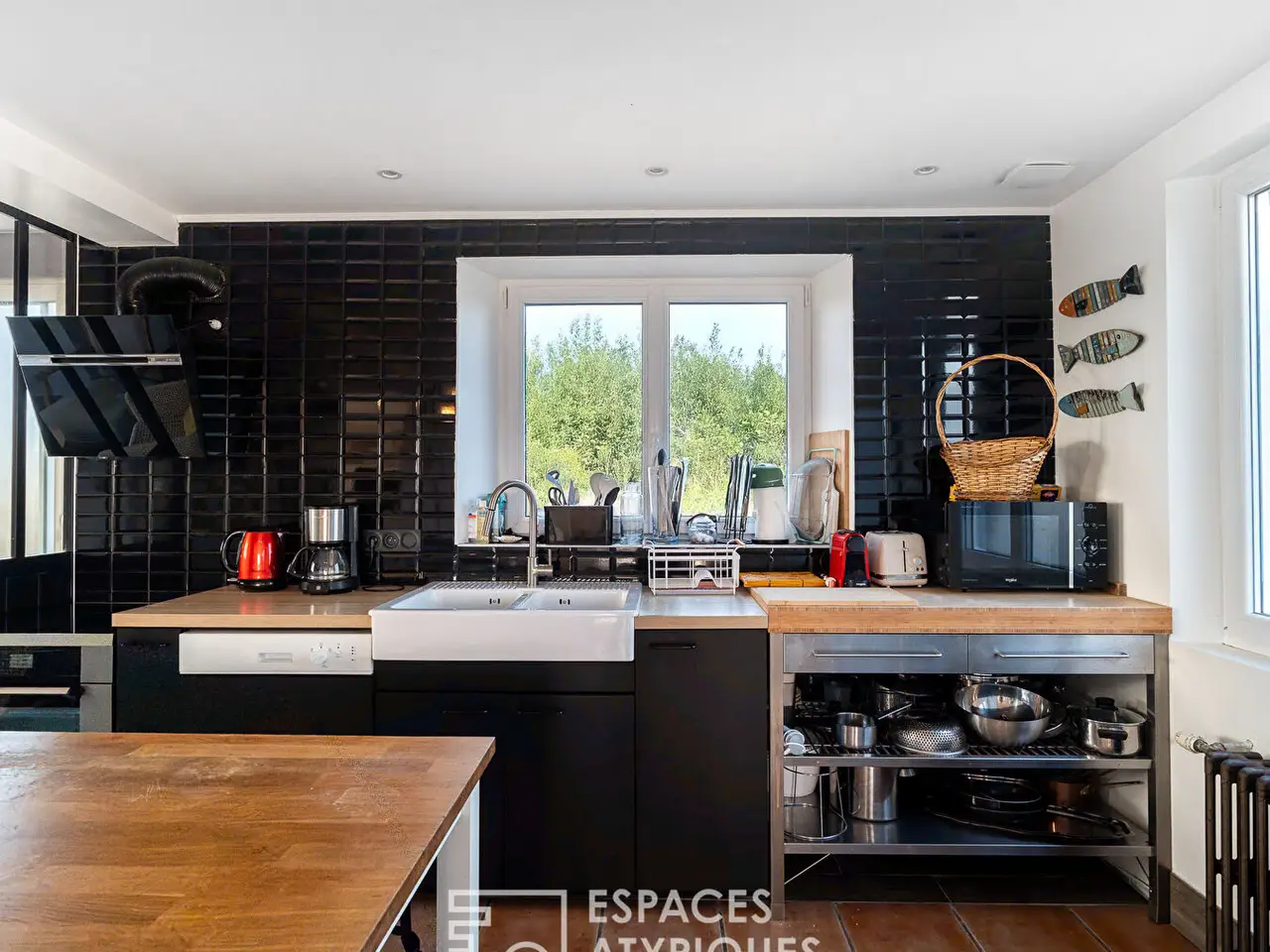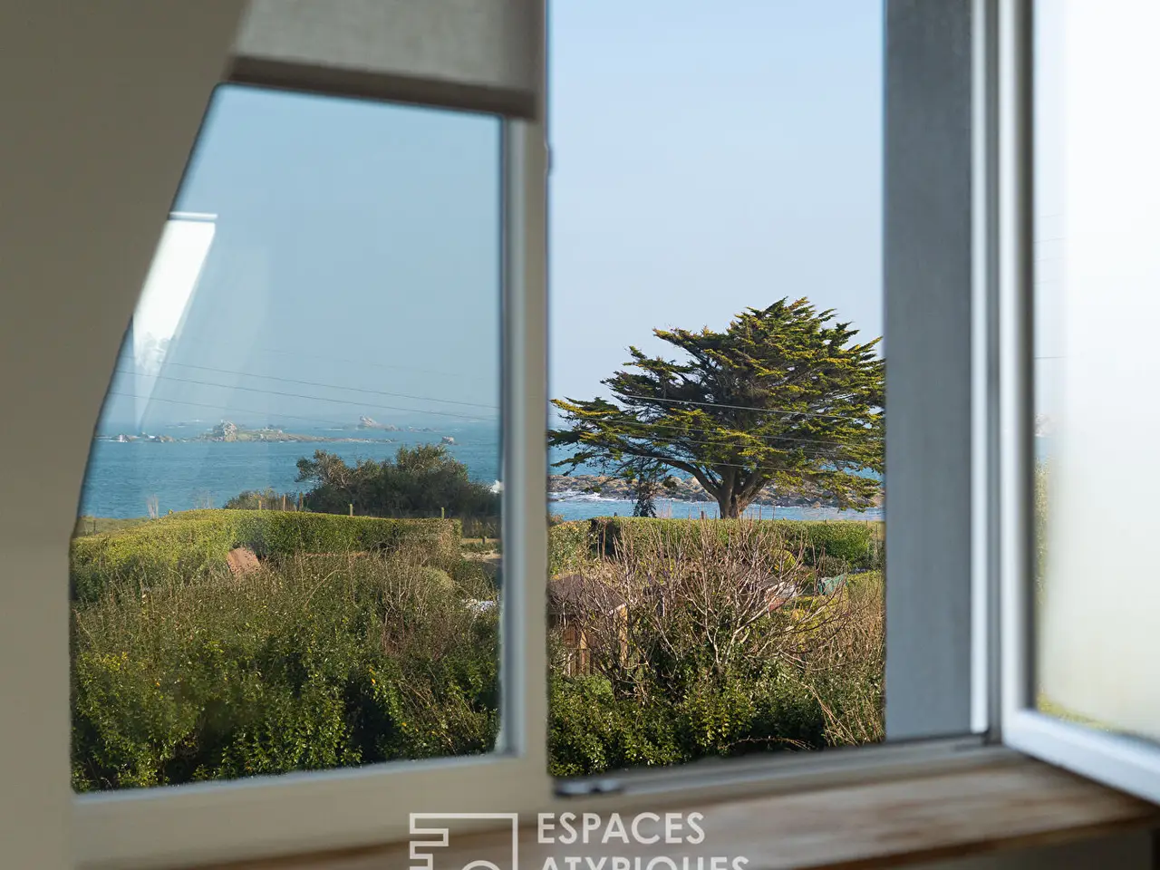 Between sky and sea, this characterful house stands facing the ocean, in a preserved green setting. The beaches stretch right in front of the house, with no roads to cross. Nestled at the end of a peaceful lane in Santec, the house benefits from a rare natural environment, where the elements blend softly and light. Completely redesigned and renovated, this typical 1970s building now combines the charm of assertive architecture with contemporary comfort. Built on a generous plot of nearly 2,400 sqm, in a non-submersible zone, it offers a luminous refuge, conducive to a salty lifestyle, between calm and the marine horizon. The heart of the house is organized around a vast living room, bathed in natural light thanks to its numerous openings onto nature and the horizon. Here, the atmospheres overlap perfectly: on one side, a cozy and intimate living room in soft tones, punctuated by graphic details and marine references; on the other, a warm and friendly dining room, largely open to the outside. The kitchen, completely redesigned, asserts a contemporary style with industrial accents: glossy black tile wall, wooden worktop, central island with storage and seating. The whole harmonizes elegantly around a porcelain stoneware and terracotta floor, which structures the different spaces while maintaining warmth and authenticity. Around this living room, wooden terraces surround the house, allowing you to enjoy the sun's rays as well as the sea spray, depending on the time and mood. Breakfast facing east, afternoon naps in the shade, salty aperitifs facing west: here, life flows to the rhythm of the sky and the sea. A graphic staircase, highlighted by patterned risers and a contemporary railing, marks the transition between the levels and extends the assertive style of this carefully redesigned house. The upper floor accommodates two luminous suites, designed as true cocoons, facing the ocean. The first opens onto a spacious bedroom with a direct view of the deep blue. The space, structured yet fluid, combines a sleeping area, desk, and reading chair in a soft and refined atmosphere. The bathroom, integrated into the bedroom, creates a cohesive and elegant whole, without interruption. A walk-in shower, contemporary double sink, simple lines, and natural finishes accompany the light from the sea, for a daily experience as comfortable as it is inspiring. The second suite unfolds a singular charm. Upon entering, the gaze is captivated by the dual sea view, East and West, offering a changing light, from sunrise to the last rays of dawn. The bathroom, with an elegant freestanding bathtub, integrated into the space, plays the card of comfort and elegance, without superfluous partition: a place designed to slow down, contemplate, and let oneself be carried away by the rhythm of the tides. After the upper floor dedicated to the suites bathed in light and sea views, the garden level reveals a more subdued atmosphere, imbued with calm. Like a refuge below, opening onto the garden, the garden level accommodates two bedrooms with a subdued atmosphere, designed to prolong moments of tranquility or welcome family and friends in complete independence. Each has direct access to the outdoors, for an indoor-outdoor life throughout the seasons. A separate shower room completes this level with functionality and elegance. A laundry room completes daily comfort. A large garden surrounds the house, ensuring peace and safety for children. Access to the beaches is on foot via the dune path, leading in particular to the nearby Billou beach: the family beach, lively and animated, where the amateur fishermen of Santec regularly put their boats in the water. For water sports enthusiasts, Dossen beach awaits you with its waves, popular with kitesurfers and surfers. It is a place where you can put down your suitcases to fully enjoy a daily life filled with sea air: swimming, water sports, walks on the GR 34 o