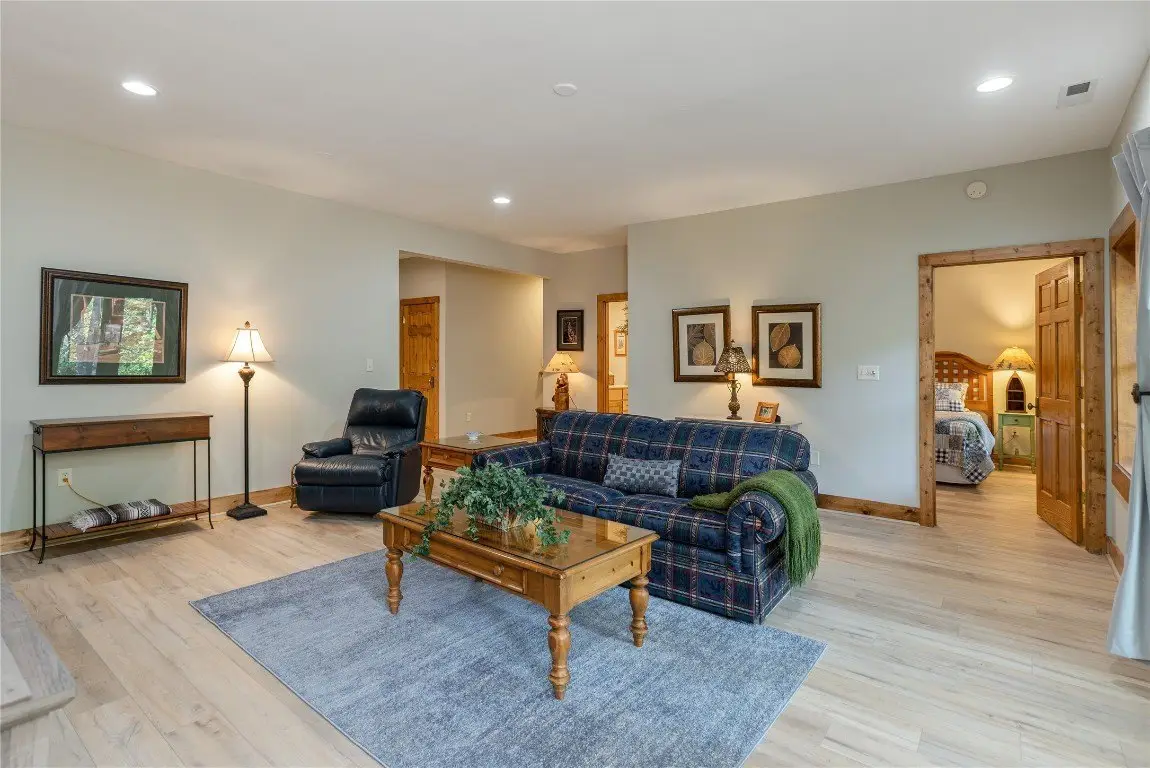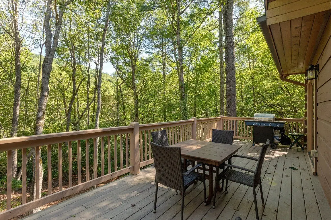 This impeccably maintained and move-in-ready cabin offers four bedrooms and three bathrooms, with one bedroom designed for flexible use as a guest room, office, or play space. Extensively renovated under current ownership, recent 2024–2025 updates include a 24 x 24 two-car garage, new HVAC, and a new roof. Adirondack rocking chairs on the front porch set the tone for this charming mountain retreat, which showcases log siding, a cathedral ceiling, and a stone wood-burning fireplace. The open floor plan creates a comfortable flow between the living and dining areas and the refreshed kitchen, which offers granite countertops, painted cabinetry with updated hardware, under-cabinet lighting, a built-in trash cabinet, electric range, dishwasher, and cookware. Two ensuite bedrooms are located on the main level, thoughtfully positioned on opposite sides of the living room for privacy. The lower level includes a queen ensuite bedroom, a living area, and a versatile flex room with bunk beds that can be used for guests, family, an office, or recreation space. Interior updates feature fresh paint, luxury vinyl plank flooring throughout, and updated bathrooms with granite vanity tops, sinks, faucets, hardware, Toto toilets, and in the primary suite, a custom closet and walk-in shower. The queen bedroom offers a sliding glass window treatment, updated bedding, and a TV, while the lower level provides additional living and entertaining space with direct patio access, a guest suite, a den, laundry, and an owner’s closet. 2024–2025 furnishings are available throughout the home, including recliners and a sofa, a dining table with a leaf and chairs, accent tables, and rugs in natural tones that complement the mountain setting. Additional upgrades include a whole-house dehumidifier, gutters, full exterior repaint, exterior lighting, asphalt driveway, and thoughtful landscaping with trimmed landscaping that enhances mountain views. Outdoor living areas include a rescreened porch, an open deck for grilling, a covered patio, and a level backyard. The property is conveniently located near Sapphire Valley Master Resort amenities, Lake Fairfield, dining options in both Sapphire and Cashiers, and is just an hour drive from Asheville airport. With extensive recent renovations, low-maintenance features, and flexible living spaces, this property offers an ideal mountain retreat for full-time residence, vacation use, rental income, or investment.