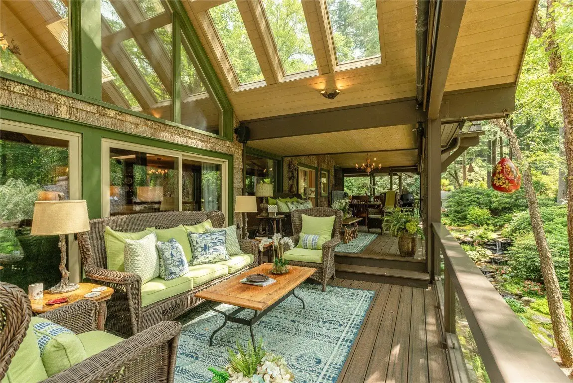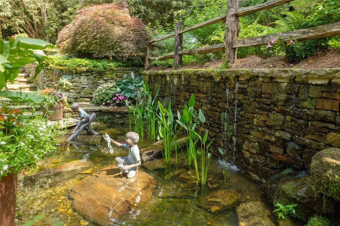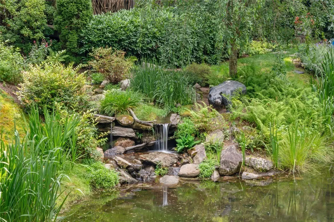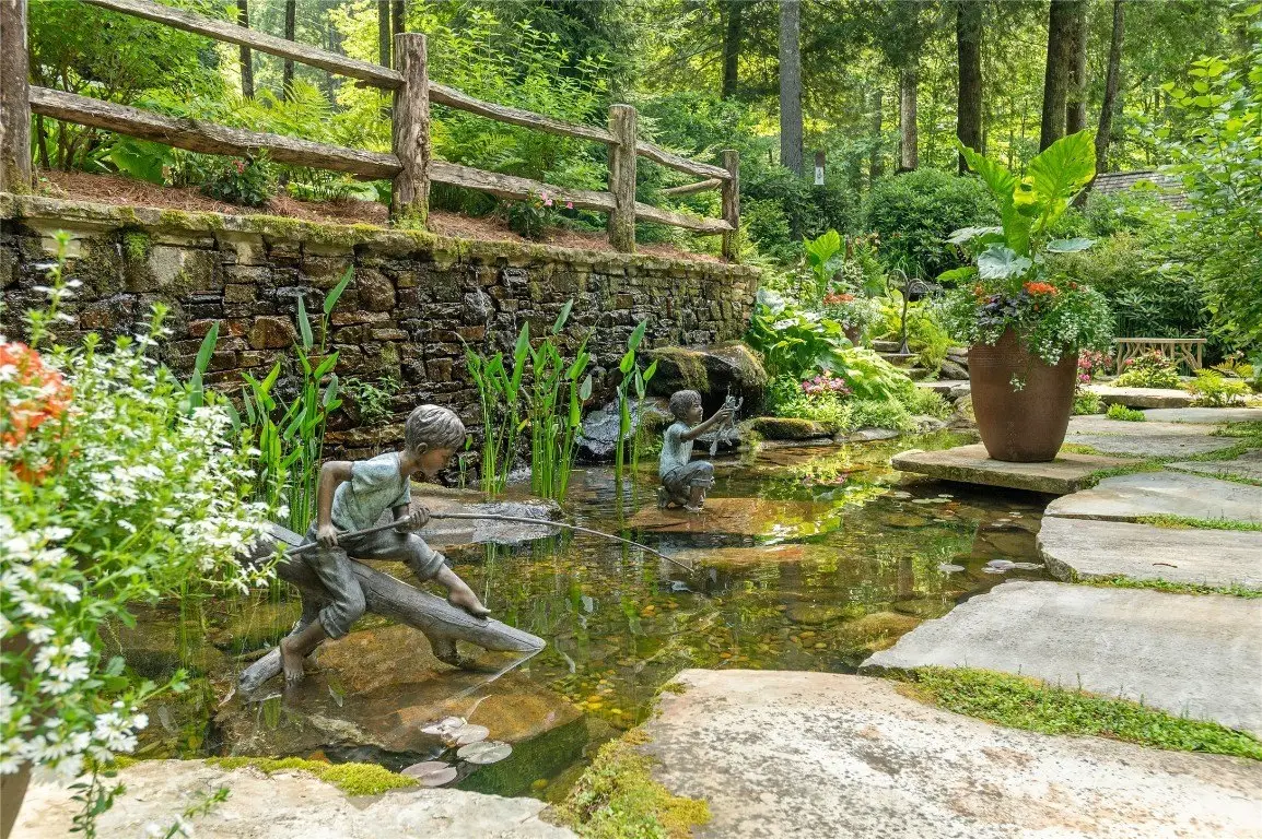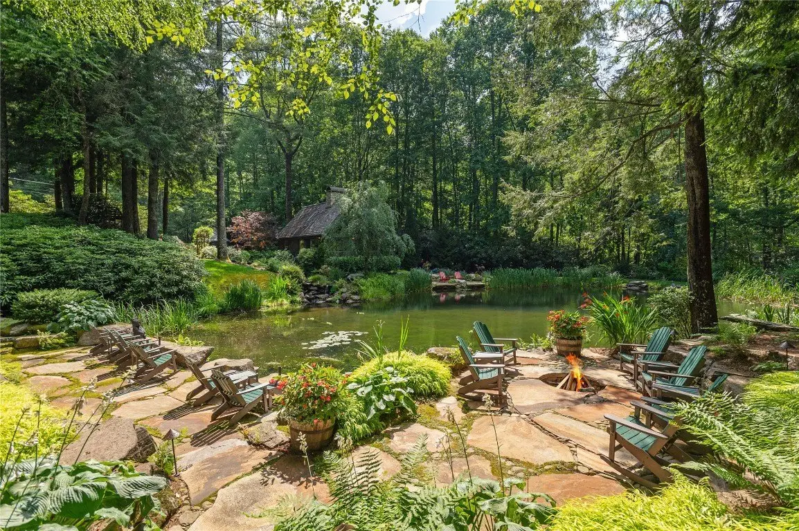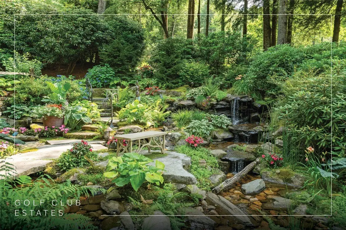 Welcome to Two Ponds -a distinguished estate offering serene sophistication on over 2.2 lush acres overlooking holes 15 and 16 of the esteemed Country Club of Sapphire Valley. This extraordinary compound embodies a harmonious blend of rustic elegance and contemporary comfort, artfully set amidst meticulously designed gardens, tranquil water features, and multiple cascading waterfalls that provide the soothing melody of flowing water. Enter through striking handcrafted steel doors into a home where every detail speaks to unparalleled craftsmanship and refined taste. Extensive remodeling has incorporated premium materials, effortlessly merging modern convenience with timeless charm. The inviting great room, featuring a grand stone fireplace and soaring ceilings, opens seamlessly to the expansive rear deck, complete with sleek glass railings that frame captivating panoramic views of the pristine landscape and reflective ponds below. At the heart of the home is a gourmet kitchen featuring top-of-the-line Viking appliances, custom cabinetry, and a generous island, perfectly positioned to host intimate gatherings or sophisticated al fresco dining under the stars. The primary and guest suites reside conveniently on the main level, each thoughtfully appointed with luxurious finishes, offering privacy and comfort. Descend to the lower level, where an expansive family room, additional guest accommodations, comfortable sitting areas, a dedicated wine storage space, and versatile bonus rooms offer ample space for guests to unwind. Just steps away, a charming guest cottage nestled between two serene ponds provides a tranquil retreat with a kitchenette, dining area, living room with fireplace, and a cozy loft. Two Ponds is adorned with exceptional details, earning prestigious accolades, including internationally recognized handcrafted bronze railings and an acclaimed bronze sundial. The gardens featured prominently on the Joy Garden Tour and PBS's Garden Smart series offer a breathtaking botanical experience. Positioned just a short golf cart ride from the exclusive Country Club of Sapphire Valley (membership by invitation), Two Ponds embodies refined mountain living, seamlessly blending luxury, tranquility, and natural beauty.