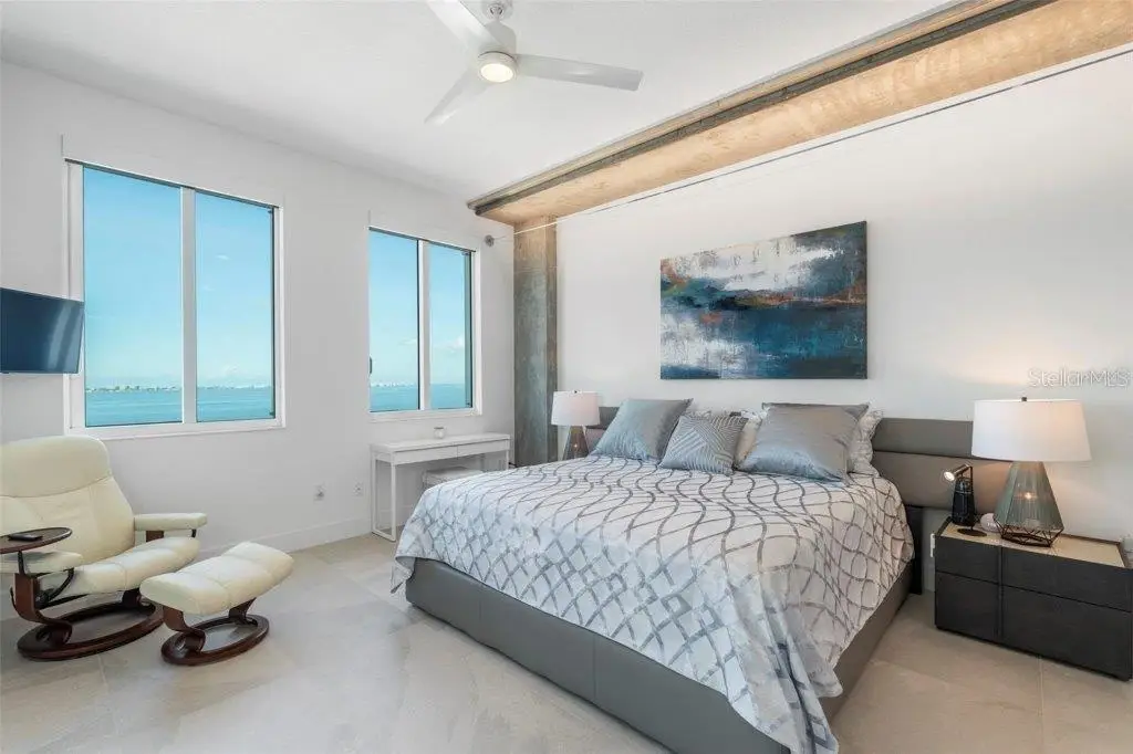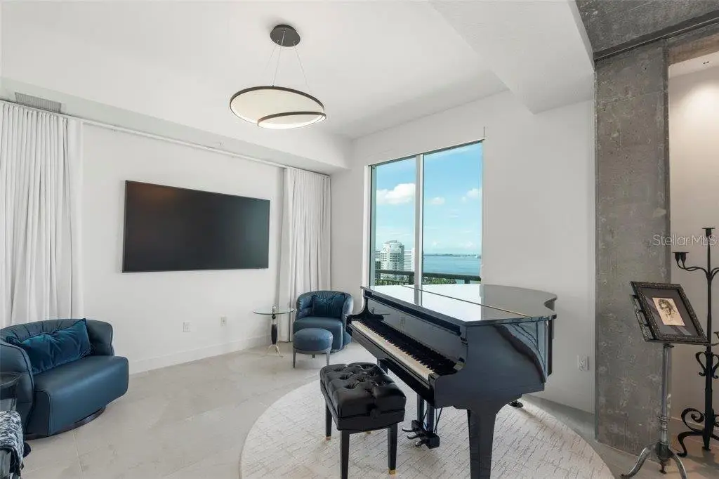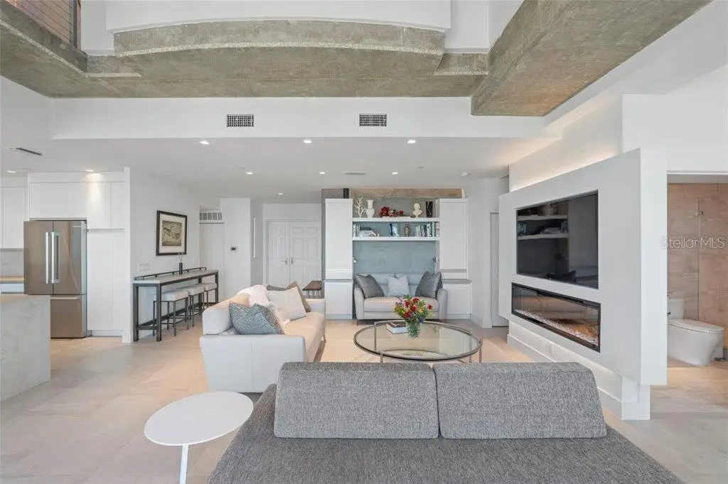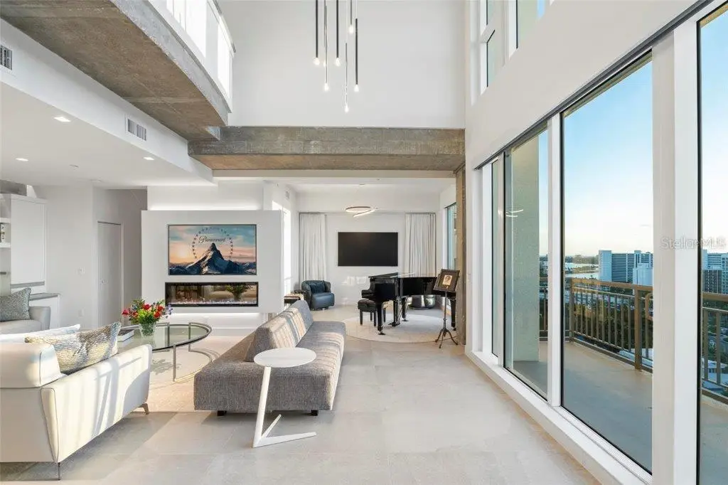 Perched high above Sarasota Bay with breathtaking bay views, this two-story luxury penthouse at Alinari feels like a private sanctuary in the sky where New York loft style meets the beauty and energy of Florida's most cultured coastal city. A perfect winter getaway or full-time home, this architectural masterpiece was completely redesigned and reimagined in 2020-2023 by leading architect Yehuda Inbar and custom builder Yoder Homes and fuses architectural drama with coastal ease. A soaring 20-foot atrium fills the open plan with natural light, framing dazzling and protected water views of the Bay, Bayfront Park and the Van Wezel Performing Arts Hall just across the street. Polished concrete, Caesarstone quartz, and fine Ceramiche D'Arte porcelain floors set a modern tone, softened by custom draperies and curated furnishings that invite lingering afternoons and golden sunsets. The 2500 square-foot, 2/3 bedroom, 3.5 bath floor plan features a chef's kitchen, statement staircase, and loft-style layout which recalls a Manhattan gallery, while the upper-level primary suite offers a serene retreat with spa-like bath. Smart-home features, cutting edge Integrity Sound audio system, Dimplex fireplace, electric shades, and turnkey interiors with premium furnishings from Clive Daniel, Natuzzi, Soft Square and Light Up Your Life complete a space made for effortless sophistication. Open the sliders to your private balcony and and savor gentle bay breezes while taking in the picturesque surroundings. Alinari's resort amenities elevate everyday living with a resort-length pool, heated spa, yoga and fitness studios, saunas, wine cellar, theater, social and billiards lounges, guest suites, 24/7concierge/security, and 2 spaces in the secure garage parking. Available separately, a private poolside cabana one of only ten adds an intimate escape with kitchenette and direct pool access, perfect for entertaining or quiet retreat. Set 16 feet above sea level in a protected X-flood zone and steps from the signature 53-acre Bayfront Park and Sarasota's vibrant dining arts, and cultural offerings, this penthouse embodies cultured coastal living at its most graceful, artful, uplifting, and one of a kind.