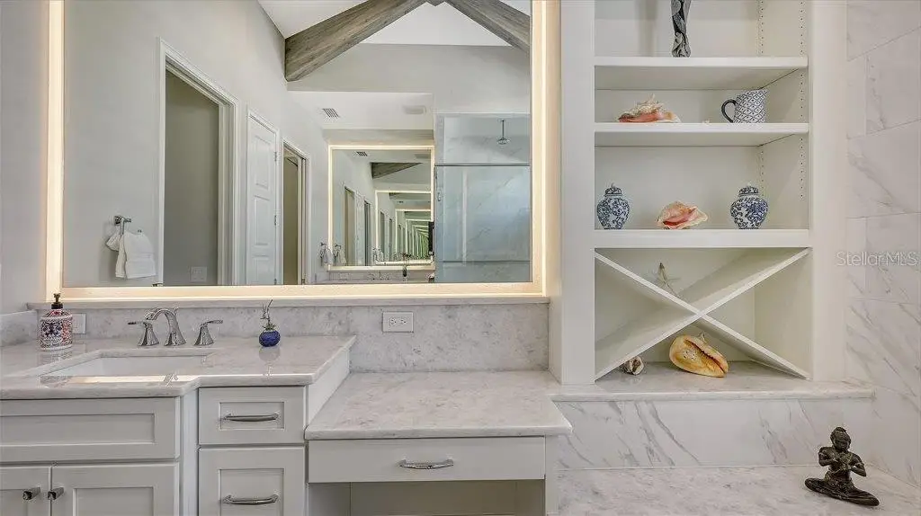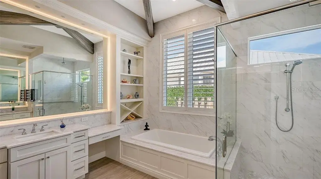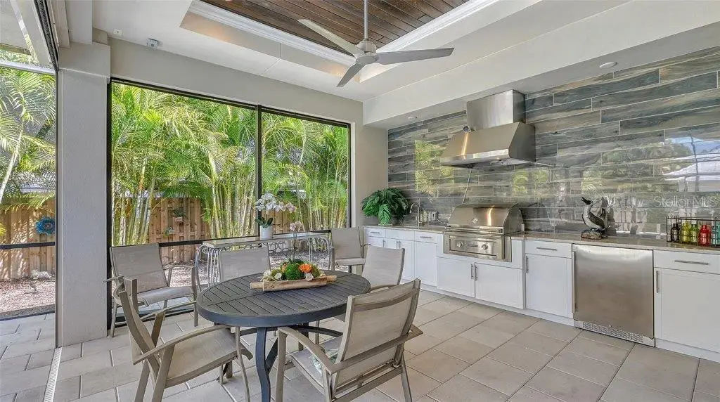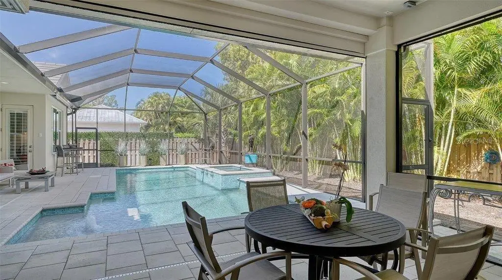 An exceptional single-story Allegra home in Sarasota's coveted West of Trail Flower Streets, perfectly positioned within the Southside School district and just steps from the charming Southside Village restaurants, shops, and Morton's Gourmet Market. This impeccably designed 3-bedroom + office + bonus room, 2.5-bathroom home epitomizes modern coastal living and showcases the esteemed Kristi Ann single story floor plan, offering a seamless blend of sophisticated design and everyday functionality, making it an ideal primary or seasonal residence. From the moment you step through the double doors, you'll be captivated by the open and inviting main living space. The soaring 18-foot ceiling and wall of expansive 10-foot pocketing sliders draw you towards the resort-like outdoor retreat, perfect for relaxing or entertaining. The living room is a true architectural masterpiece, featuring a dramatic floating tray ceiling with Halo-LED lighting and a focal wall complete with a remote-controlled electric fireplace. The chef's kitchen is as functional as it is stylish, equipped with stainless steel appliances, a 5-burner gas range, Quartz island and countertops, and a generous walk-in pantry. The dining area, both intimate and elegant, includes a built-in Quartz-topped buffet, creating a serene space for family meals or hosting guests. The primary suite offers a tranquil escape, with vaulted ceiling accented by charming wood beams. The spacious custom walk-in closet ensures ample storage, while the spa-like en-suite bathroom, featuring glass-enclosed shower and designer tile, is the perfect respite after a long day. Two additional large guest bedrooms, along with a well-appointed guest bathroom and powder room, offer comfort and privacy for family or visitors. This award-winning floorplan also boasts a dedicated office, versatile bonus room, laundry room, and a 2-car garage with added storage, meeting the needs of modern living. Step outside and discover an expansive lanai with a resort-style heated pool, spa, and impressive summer kitchen, all surrounded by lush landscaping and illuminated by custom lighting. The disappearing corner sliders seamlessly blend indoor and outdoor spaces, offering the quintessential Sarasota lifestyle. This home is packed with custom features, including designer lighting and built-ins, PGT impact windows, solid-core interior doors, and spray foam insulation for optimal energy efficiency. Recent upgrades include remote-controlled Kevlar shades for additional hurricane protection/storage for outside furnishings/sunshade, new AC unit with UV lights, 2023 mini split AC unit in the garage, and a whole-home in-duct air purifier, ensuring comfort and peace of mind. This impeccably crafted residence captures the essence of Southside Village living, offering a single-level floor plan that balances everyday comfort with refined style. Ideally positioned near Southside School, Sarasota Memorial Hospital, Downtown Sarasota, and Siesta Key Beach, it delivers the ultimate blend of location, luxury, and lifestyle. Built to the latest hurricane codes and outside the flood zone, the home provides peace of mind along with timeless design. Every detail has been thoughtfully curated, creating an exceptional opportunity for discerning buyers to experience the best of Sarasota living in a true single-story gem.