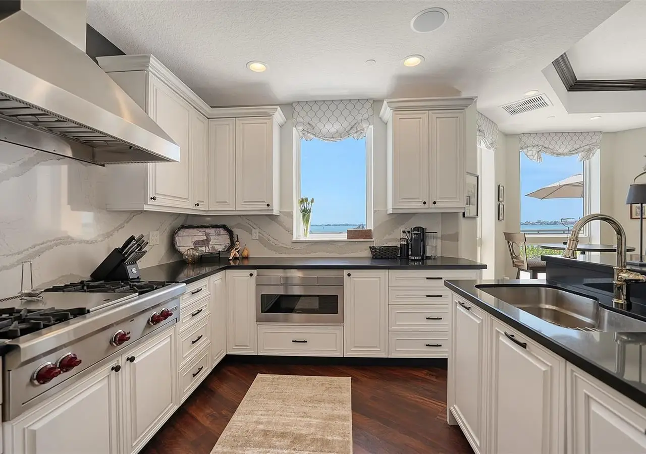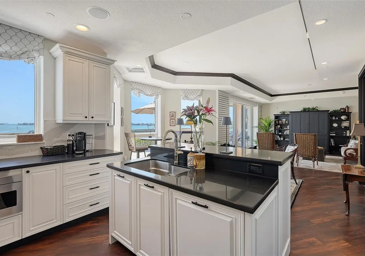Experience the epitome of elegance and timeless sophistication in this exquisitely appointed residence at the exclusive Grande Riviera, a breathtaking architectural gem nestled in the prestigious Golden Gate Point neighborhood. Meticulously maintained, this classic condominium offers panoramic views of Sarasota Bay and the sparkling downtown skyline, setting a new standard for luxury waterfront living. This residence boasts the largest terrace in Grande Riviera, approximately 2300 square feet, providing the ultimate setting for sunsets and entertaining friends and family. One of only 13 exclusive residences, this home offers an intimate and private lifestyle, with a private elevator entrance leading directly to the elegant foyer. Designed for both comfort and grandeur, the residence features arched walkways, rich crown molding, and expansive living spaces ideal for entertaining or quiet reflection. The heart of the home is a remodeled chef’s kitchen, outfitted with a large center island, solid wood cabinetry adorned with sleek black hardware, a quartz backsplash, granite countertops, and a Sub-Zero refrigerator and freezer, as well as a Wolf gas range and double wall oven. Deluxe Laundry room with custom cabinetry and workspace conveniently located near the kitchen. A wet bar with a Sub-Zero wine fridge seamlessly connects the open living space to the elegant dining and living areas, creating a perfect flow for gatherings. Step outside onto the largest private wraparound terrace in the building, where you’ll enjoy breathtaking, unobstructed views of the bay. This is truly one of the most distinguished outdoor living spaces in the complex. The owners’ suite is a serene retreat, featuring dual walk-in closets with custom built-ins, and a spa-like bathroom with marble floors, a dual quartz vanity, walk-in shower with dual showerheads, and a private water closet. The suite also offers direct access to the terrace, allowing for peaceful mornings with stunning bay views. The guest suite boasts a private terrace entry, en suite bath, and walk-in closet, while a versatile den with double glass doors can serve as an office, sitting room, or additional guest space. Additional features include a private, deeded two-car garage with storage, resort-style pool, rooftop terrace, boat docks, on-site management, and private secured access. This is a rare opportunity to own a distinguished waterfront home in one of Sarasota’s most coveted locations, a residence that masterfully blends classic design, modern comforts, and breathtaking surroundings.
