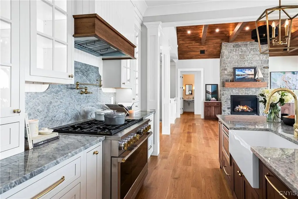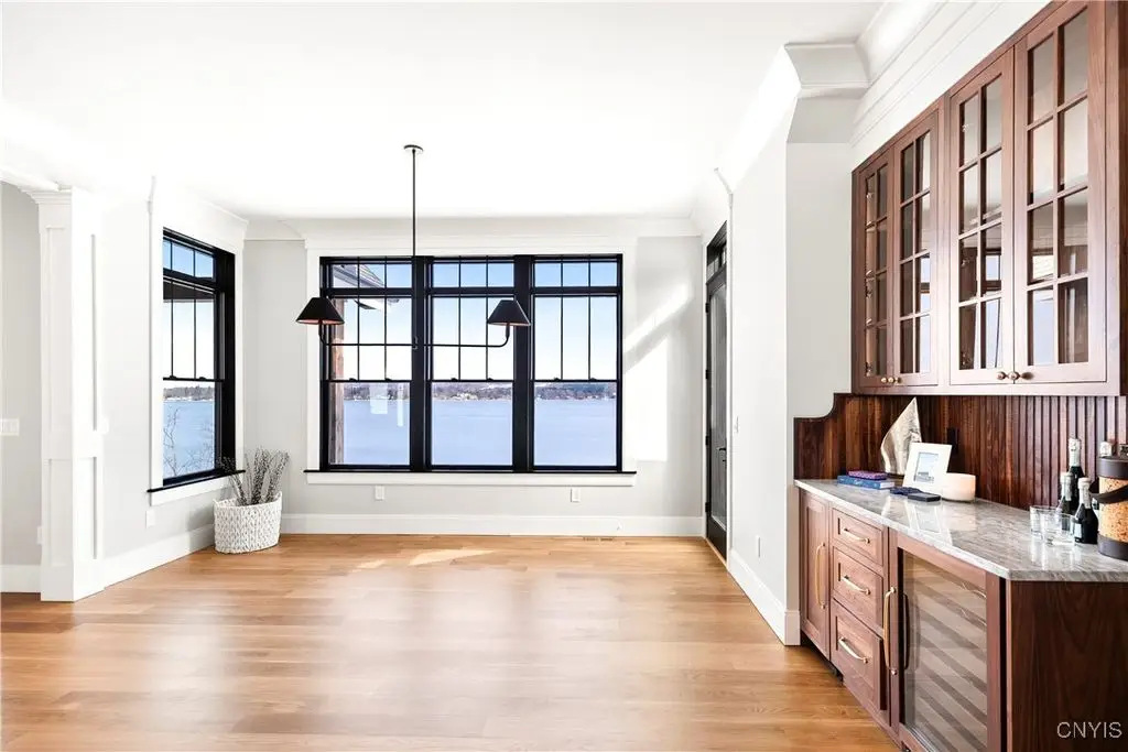 A stunning luxury lake house, custom-built just two miles from the village center, sits on 26.7 acres with 389 feet of exclusive private Skaneateles waterfront. This magnificent home features 5 bedrooms, 5 full baths, and 2 half baths. Upon entering, the grand vaulted ceilings immediately capture your attention, offering breathtaking views of the lake. The open floor plan effortlessly connects each room, showcasing water views, exquisite moldings and hardwood floors throughout. The first floor includes a private office with a built-in coffee station, a formal dining room, and a family room with a striking gas fireplace. Sliding doors lead to an expansive deck with glass railings that illuminate at night, creating a magical ambiance. The chef's kitchen is a culinary masterpiece, with custom cabinets, built-in refrigerator and freezer, a spacious island with marble countertops, and a commercial-grade stove with a custom wood hood vent. A butler's pantry with a second dishwasher and beverage drawers adds convenience for entertaining. The primary bedroom on the first floor features a private deck, a custom California walk-in closet, and a luxurious primary bath with double vanity, soaking tub, heated tile floors, a water closet, heated floors and glass surround shower. Another bedroom on the first level has its own en-suite bath. The second level includes a bedroom, loft area, and a full bath. The lower finished walkout level boasts a second family room with a stone fireplace, sliders to an oversized patio, a custom-made bar with glass backsplash and black walnut countertops, and an ice maker. Two additional bedrooms, two full baths, and a second laundry area complete this level. Outside, a two-level boathouse sits on 389 feet of waterfront, featuring a kitchen with a refrigerator, icemaker, and microwave. The main level offers a beautiful gathering area and a half bath. This brand new custom-built home by S & R Custom Homes is a luxurious private retreat that embodies the best in lakeside living. With its flawless design, top-of-the-line amenities, breathtaking views, and ultimate privacy, this home is truly a masterpiece and a once-in-a-lifetime opportunity.