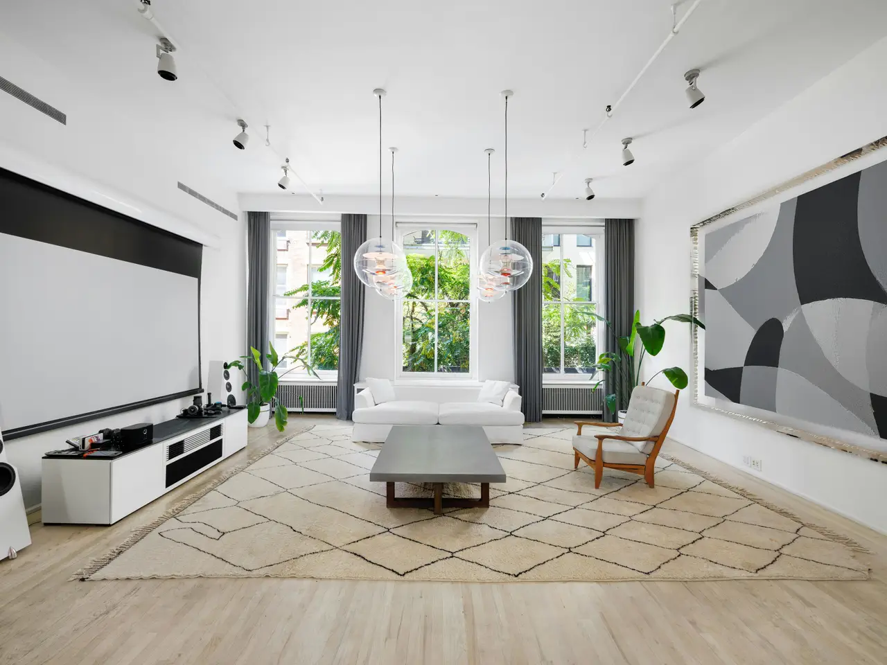 Located on the coveted cobblestone block of Greene Street in the heart of SoHo, this super cool and expansive over 3,700 square-foot loft condominium offers a rare combination of striking design, natural light, and flexible living. With soaring 13-foot ceilings and oversized windows facing both East and West, this full-floor home provides fabulous space for both grand entertaining and everyday comfort. The open-concept living area is anchored by an oversized chef's kitchen featuring a six-burner Viking range with griddle, two Miele ovens, a built-in coffee maker, and two sinks. Whether preparing a casual meal or hosting a dinner party for 40 people, the kitchen offers both style and practicality, with generous storage and an adjacent wet bar that includes two wine refrigerators, an ice maker, and additional cabinet space. Beyond the kitchen, the grand and flexible living space has tranquil treetop views from huge and architecturally significant windows. Off of the foyer is a thoughtfully designed library area that provides an ideal space for either work or relaxation. There is even a bonus room currently outfitted as a gym, offering endless possibilities for personal use. The oversized primary bedroom features floor-to-ceiling windows and a massive walk-in closet. The en-suite primary bath feels like a spa retreat, with dual vanities, a wet room with a soaking tub and dual shower heads, and a Japanese electric toilet. The bright and airy second bedroom faces onto Greene Street and has custom built-in storage and an en-suite bathroom. A dedicated laundry room with a sink adds convenience, while the apartment is outfitted with a Nest system for central AC and overhead lighting throughout. With keyed entry directly into the apartment, this loft combines the best of privacy and convenience, nestled in a boutique building with low monthly common charges. Enjoy the best of Soho, with world-class dining, boutique shopping, and vibrant culture just steps from your door. The apartment is also within easy reach of major subway and bus lines.