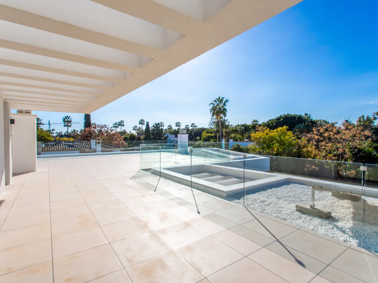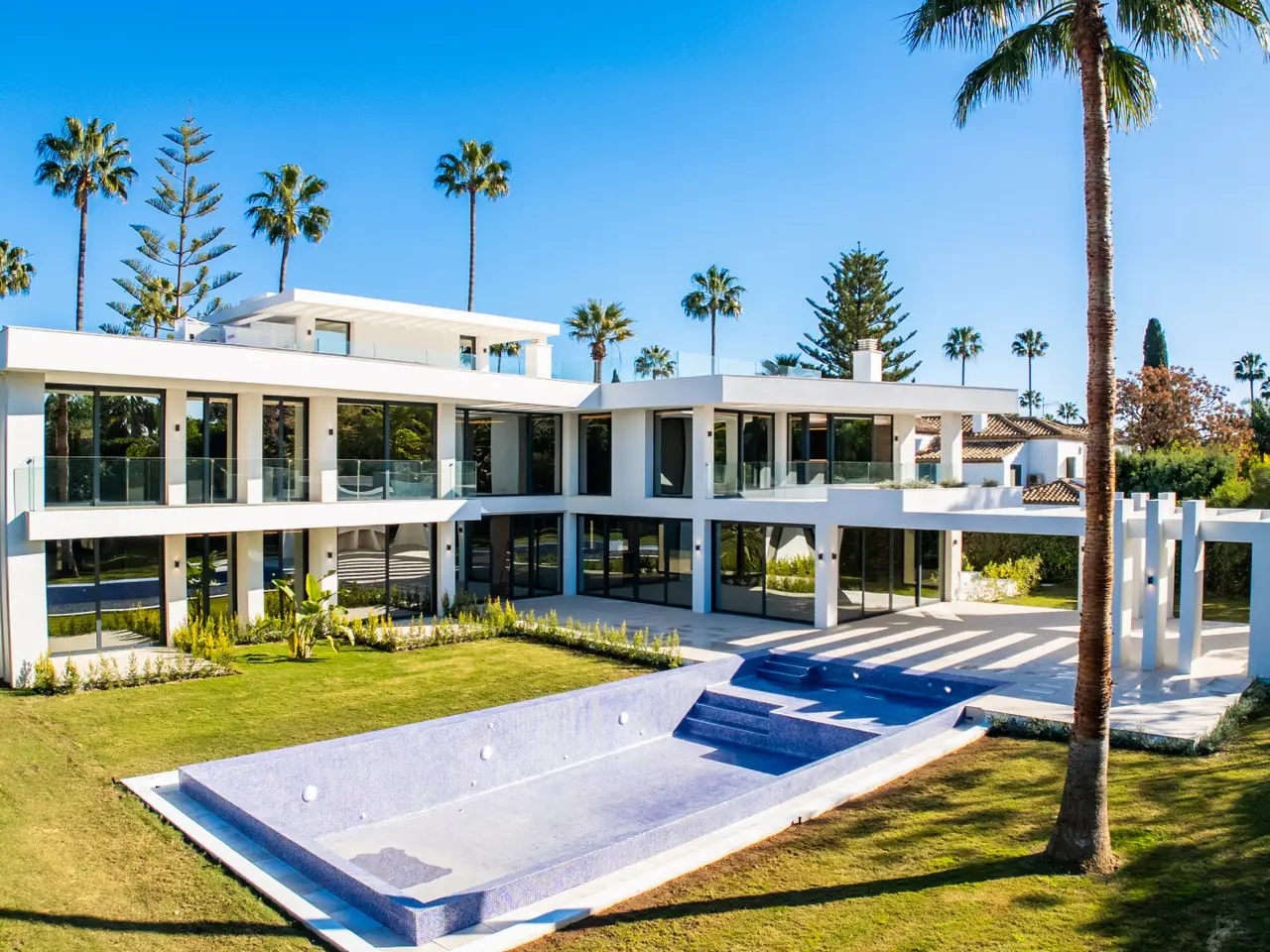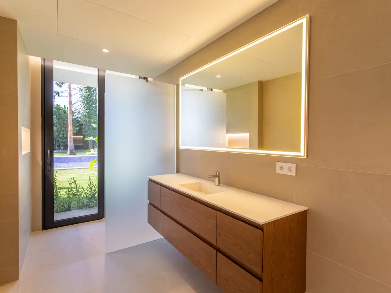 Located on a plot of over 2,000 square meters in one of the most exclusive areas of Sotogrande Costa, this magnificent villa combines modern and elegant style with its vertical lines and sober colors. The house is surrounded by large windows, maximizing natural light and energy efficiency. It features 5 bedrooms, 5 bathrooms, and 2 guest toilets. The ground floor consists of a beautiful entrance hall that separates the two bedrooms, both with ensuite bathrooms, from the spacious living-dining area with an open kitchen and a fantastic island. There is also a guest toilet and an elevator connecting all floors. From the living room, you can access the garden through a lovely terrace with pergolas, perfect for enjoying unforgettable moments under the moonlight with a drink or al fresco dining, taking advantage of the excellent climate of the area. Next to this terrace, there is a 14x6m infinity pool with LED lighting, offering both a swimming area and a relaxation area with sun loungers. The pool also has pre-installation for heating, so you can enjoy a swim after a long day of work. On the first floor, you will find an impressive master bedroom with an ensuite bathroom, a dressing room, and a private sitting area. The master bedroom also has access to a covered porch with stunning views. On the other side of the first floor, there are two more bedrooms, both with ensuite bathrooms. On the next floor, there is an uncovered terrace of 150 square meters. Can you imagine it? Finally, the basement offers endless possibilities. In addition to a covered garage of almost 50 square meters, a laundry room, and a toilet, there is a spacious open area of 149 square meters that can be used as a playroom for children, additional bedrooms, a gym, a wine cellar, a spa, or a magnificent home cinema! As for the quality of the materials, this spectacular villa is equipped with a reinforced door and energy-efficient VRF air conditioning system, as well as ventilation systems with heat recovery for increased comfort and energy savings. It also has underfloor heating and an aerothermal system. The villa is pre-installed for solar panels and an electric car charging point. The kitchen is furnished and equipped by Modulnova, with appliances from the Gaggenau brand. This is the perfect villa in the perfect location. Call us to arrange a viewing!