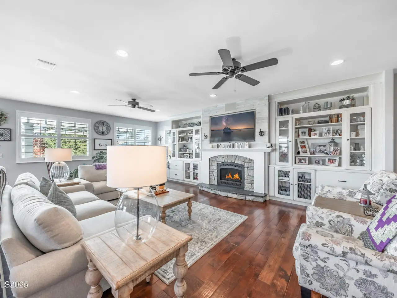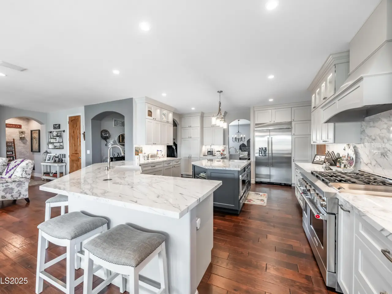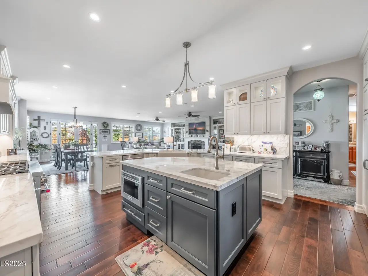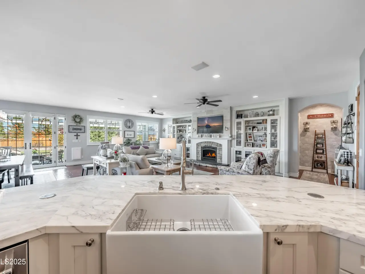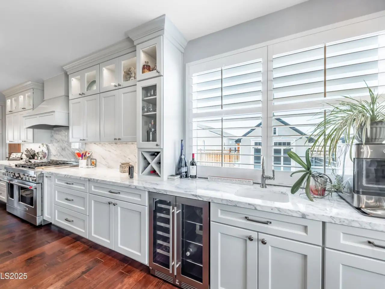 Morning light streams through the windows, casting a golden glow across the wood floors. You step into the expanded great room, coffee in hand, and take in the open, airy feel — sunlight pouring in from every direction, bouncing off the soft tones of the stone fireplace and the built- ins beside it. It is a warm and welcoming space that lets you know you're home. In the heart of it all, the newly remodeled kitchen is a true showstopper. Marble counters and backsplash sparkle beneath the light. The 48" range with double oven hums quietly, ready for breakfast pancakes or a dinner party feast. Stainless steel appliances, a prep sink, custom island, beverage fridge, and bar sink make the space as functional as it is beautiful. The cabinet drawer glides open smoothly, and the roll-out trays make finding what you need effortless. As afternoon arrives, the French doors swing open to the backyard, blurring the line between indoors and out. The paver patio and pergola offer the perfect spot for lunch in the shade, while laughter drifts from the pool area beyond the gated entry. For the outdoor enthusiast, there's room for everything — RV parking, a two-car shop ready for projects or storing your side by side. Evening brings a new kind of energy. The great room glows in the soft light of the setting sun, windows framing a peaceful view. Friends and family fill the open floor plan. Whether it's a formal dinner in the dining room or a cozy meal by the kitchen, this is where entertaining and connection collide. As the night winds down, retreat to your primary suite. The spa-like bath invites you to unwind with a soak in the garden tub, a rinse in the walk-in shower, or a moment at the dual sinks. A waltz into the walk-in closet feels like your own private dressing room. Custom built-ins line the walls — drawers, shelves, and clever storage nooks for shoes, bags, and accessories — keeping every piece in its place. For those working from home, the dedicated office offers the best of practicality with built-ins for organization and display. Even routine tasks feel lighter here — the laundry room features beautiful hard-surface counters, a sink, and plenty of custom cabinetry to keep everything neatly tucked away. This home truly checks every box — and then some. So if you are looking for the ultimate "this place has everything" kind of home, this is it!
