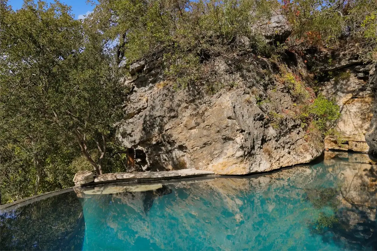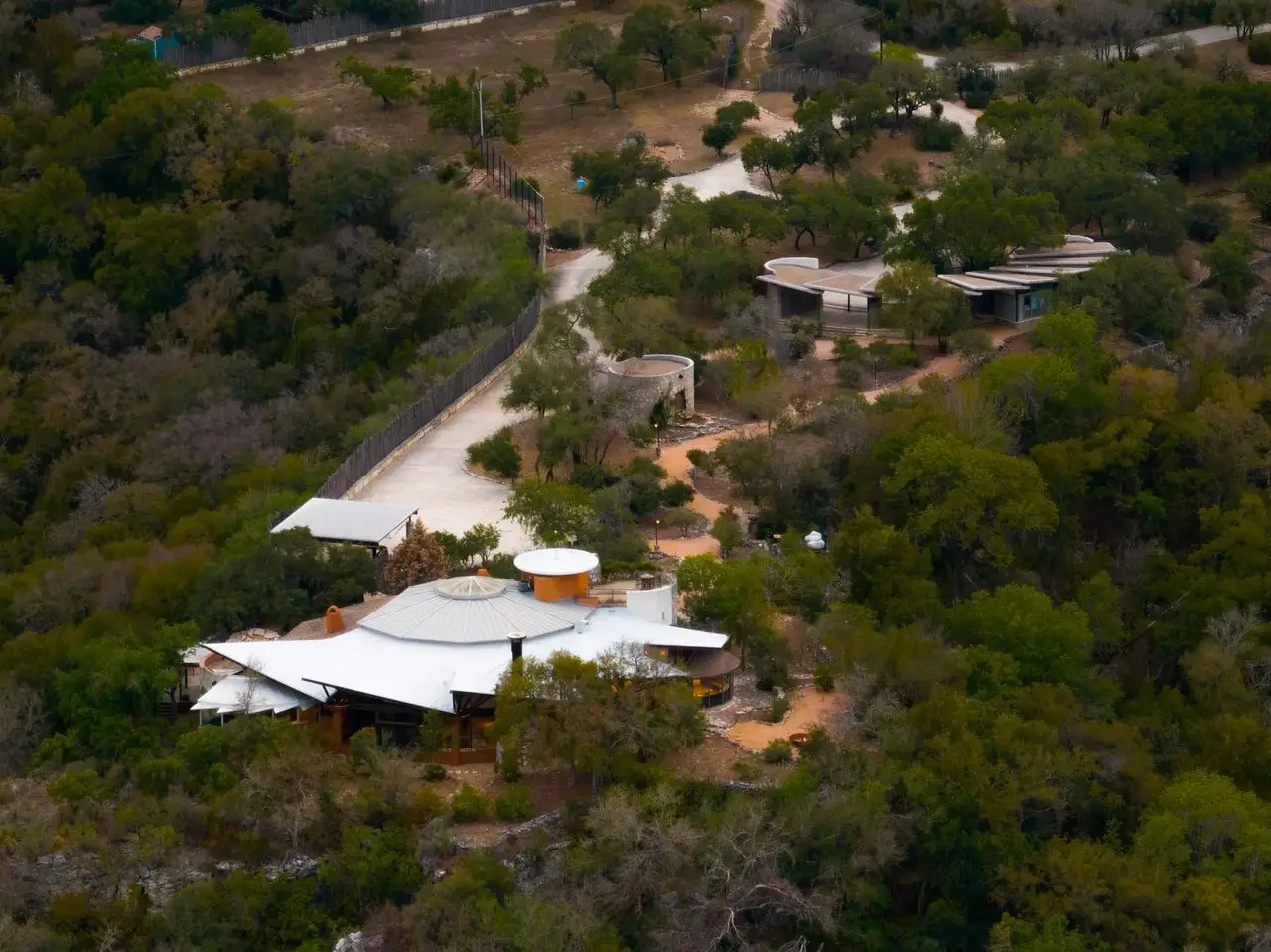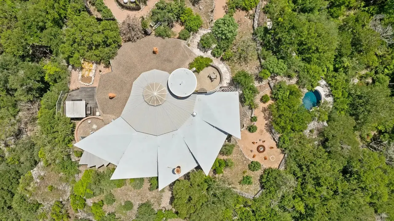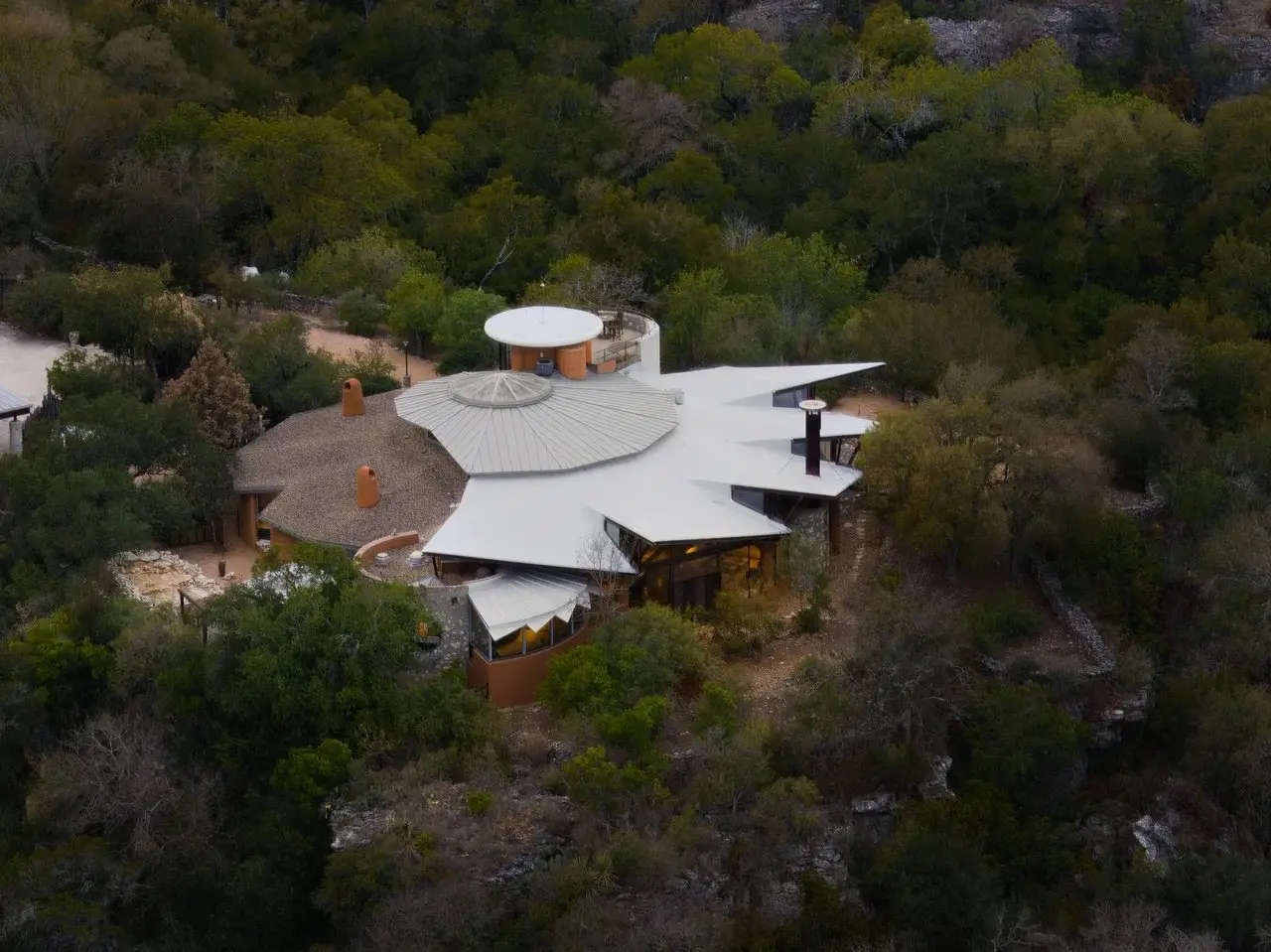 Architecturally Significant Compound in Spicewood | Once-in-a-Lifetime Retreat in Spicewood Once in a lifetime chance to own this culturally and architecturally significant home in the Hill Country, designed by John Covert Watson, an intern of Frank Lloyd Wright’s. Set on 30 stunning acres in Spicewood, The Retreat at Lick Creek Lodge is a one-of-a-kind compound offering the architecture lover the opportunity to be surrounded both by exquisite design and natural beauty. Defined by its hyperbolic parabola roof which resembles a splayed deck of cards, this home is striking inside and out. The roof creates a semi-circular motif that is repeated throughout the house, from the entry rotunda to the arching wall of glass that spans the living room and looks out to the tangle of nature enveloping the home. Interiors Celebrating Local Materials | Memorable Entertaining and Private Hideaways The interior is a celebration of the Texas Hill Country, making use of locally harvested cedar and nearby-quarried desert masonry contrasted with concrete, steel and glass. Cork floors plus rich oak and maple cabinetry add warmth and richness. An extraordinary entertaining space, the living room arches around a limestone fireplace and looks out over the rolling hills; it has hosted galas and concerts when not serving as a private retreat. The floorplan offers many unique hideaways, from a secret-door-accessed office to a serene meditation room. Roam 30 Acres with a Grotto Pool | Miles of Views with Resort Amenities The 30-acre property is set on a cliff over the Pedernales river and overlooks steep ravines and miles of green hills. Step down the hillside to the grotto pool, half-hidden in a rocky crevasse, where you can swim as if you were on a desert island. The ultra-private compound includes a large guest house and office at the front of the property; you will wend your way along gravel paths and native landscaping to reach the main house. Just 40 minutes from Austin, this property offers multiple uses, from a close-in family retreat to executive escape or small resort rental. Regardless, this property will continue to fascinate, inspire and restore its owners for years to come.