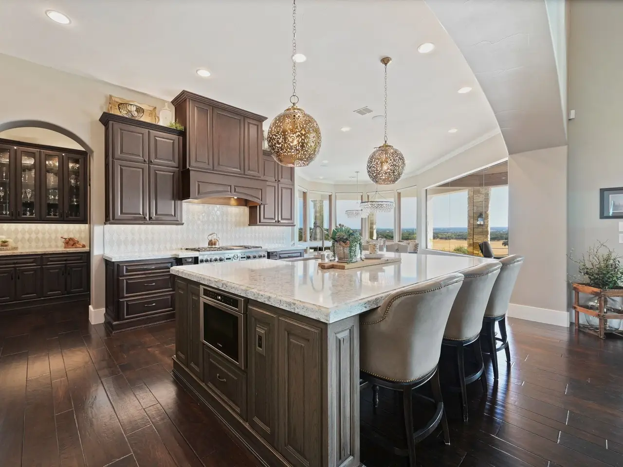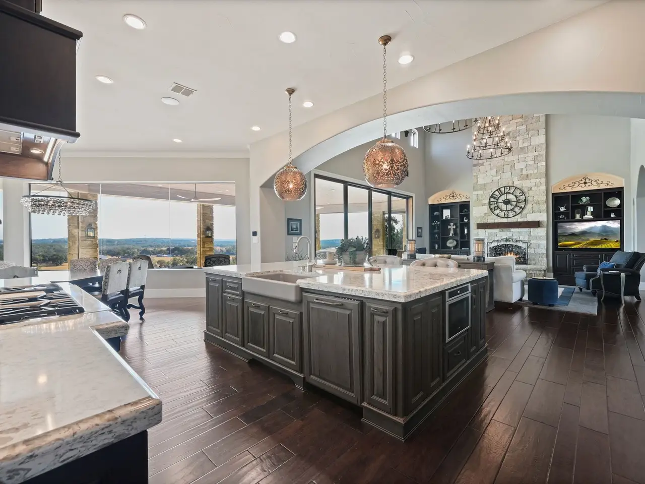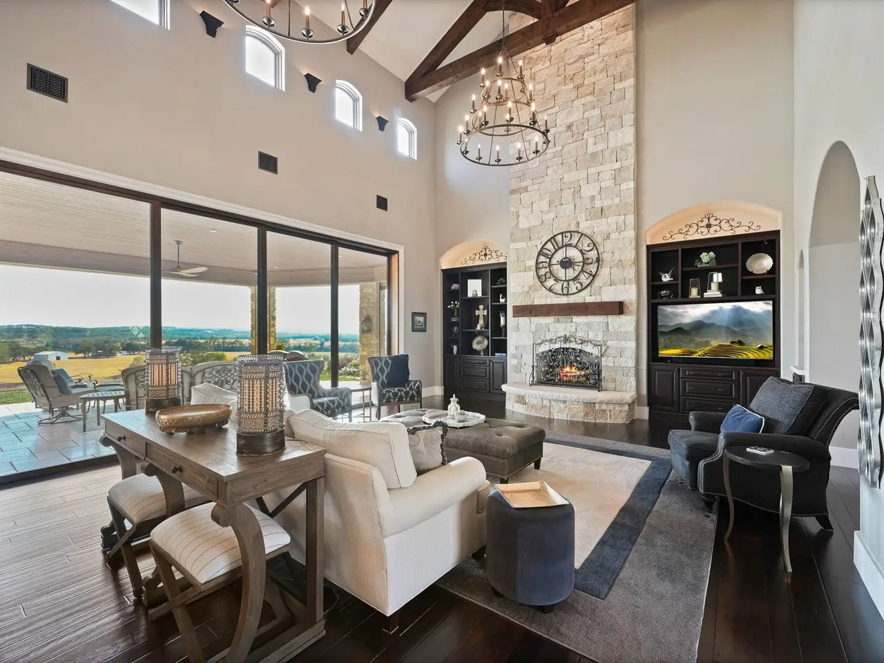 Stunning custom-built luxury home by G. Morris Homes in the heart of the Texas Hill Country. This one-of-a-kind property offers panoramic views of the Guadalupe River & surrounding hills, the perfect setting for quiet, luxury, Hill Country living. Located in the prestigious Mystic Shores community, this home combines privacy, elegance, & convenience, with easy access to San Antonio, Austin, New Braunfels, & Houston, making it ideal for both a full-time residence or a Hill Country getaway. This thoughtfully designed estate offers privacy, comfort, and elegance, with multiple gathering areas, and stunning views from every room. Enjoy a glass from your 400-bottle climate-controlled wine room as you dine overlooking the river. The outdoor living spaces are equally impressive, featuring a covered patio with electric shades, a pavilion with heated floors, fireplace, air conditioning, and an infinity-edge pool, hot tub, and waterfall for year-round relaxation. For car enthusiasts, theres room for up to 8 vehicles across multiple garages. Smart home features include security cameras throughout, all controlled from your phone or tablet. Designed with ADA accessibility, the home includes an elevator, ramps, wide hallways, and accessible showers. A private guest house provides a full kitchen, living area, laundry, bedroom, and bath, ideal for guests or in-home care. Built with efficiency and durability in mind, the property features insulated walls and ceilings, Aprilaire systems, a four-step water filtration and UV treatment system, cistern-fed irrigation, and a commercial Kohler generator for backup power. Enjoy the peaceful surroundings, where deer and native birds are part of everyday life, and a private switchback trail leads to your own serene meadow. Conveniently located near San Antonio, Austin, New Braunfels, and Houston, this property offers the best of Hill Country living, luxury, privacy, and views that will take your breath away. These views are worth the visit.