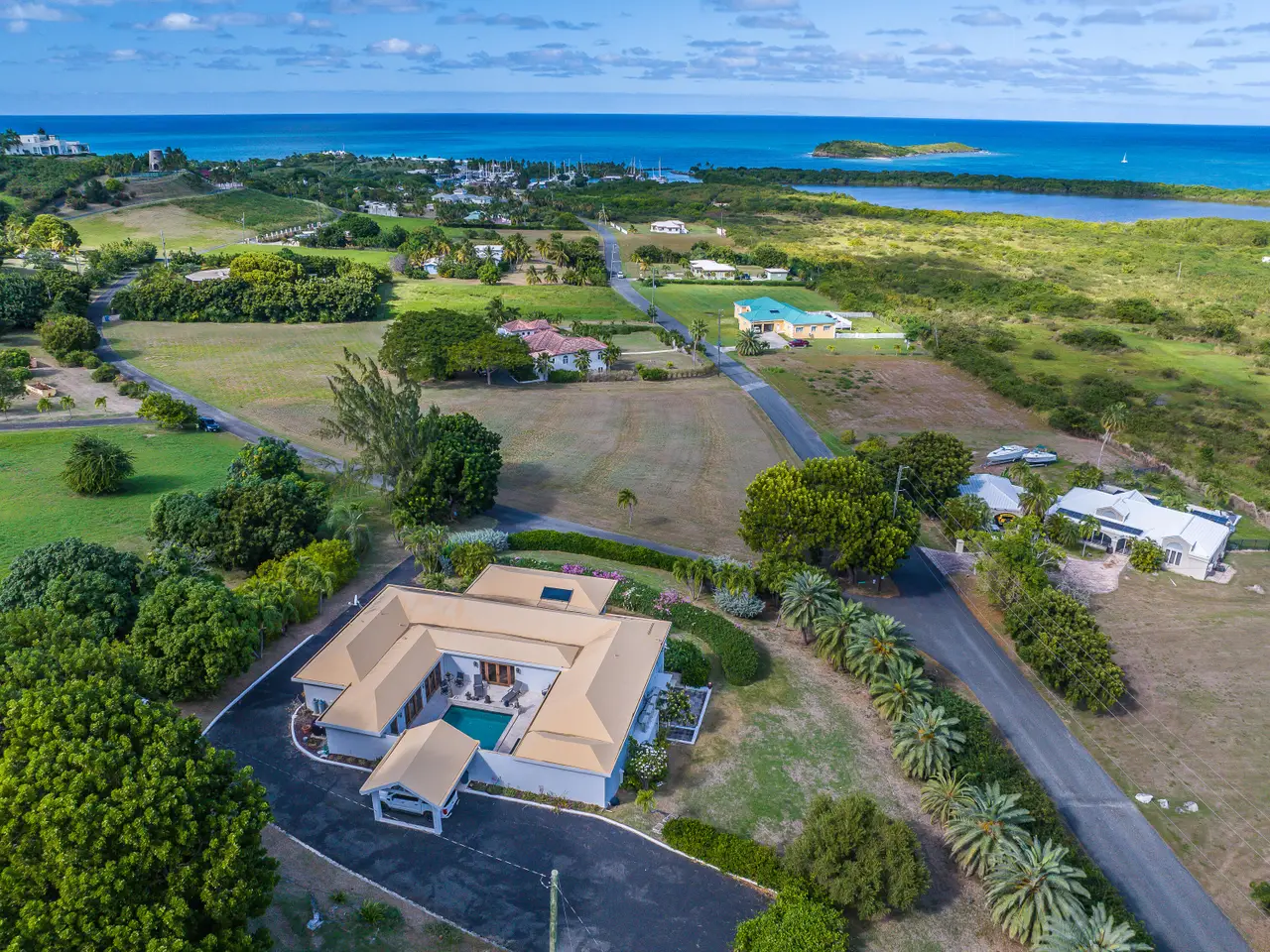 Location, Location, Location! This home is in the sought-after east end neighborhood of South Gate and within walking distance of the Green Cay Marina, Tamarind Resort and beautiful sandy beaches. The Buccaneer Golf and Tennis Resort is two miles west and numerous additional restaurants, golf courses, tennis and pickleball courts are just to your east. Gourmet grocery stores and downtown Christiansted are minutes away. This immaculate, spacious super high end home is on a beautifully landscaped corner lot with a bilevel 6 bedroom and 5.5 bathroom estate. The upper level is an open concept courtyard home with three bedrooms, 3.5 bathrooms surrounding a refreshing pool and outdoor entertaining area with majestic water views. The separate lower apartment is an ample three bedroom, two bath unit with a full outdoor patio with water views. Each level has its own private entrance and parking area.