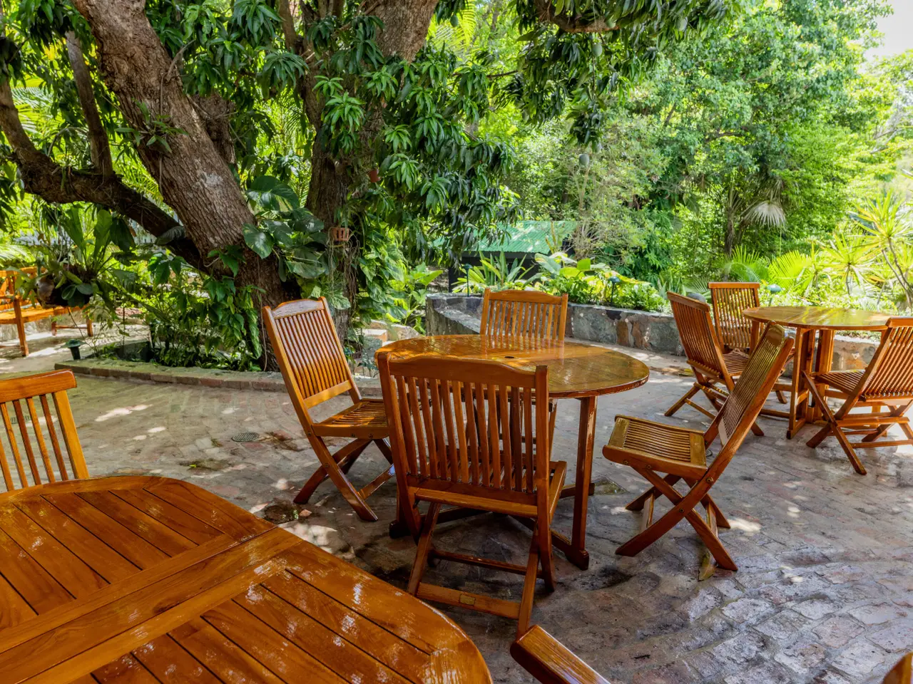 Tranquil stone walkways through fruit tree grounds