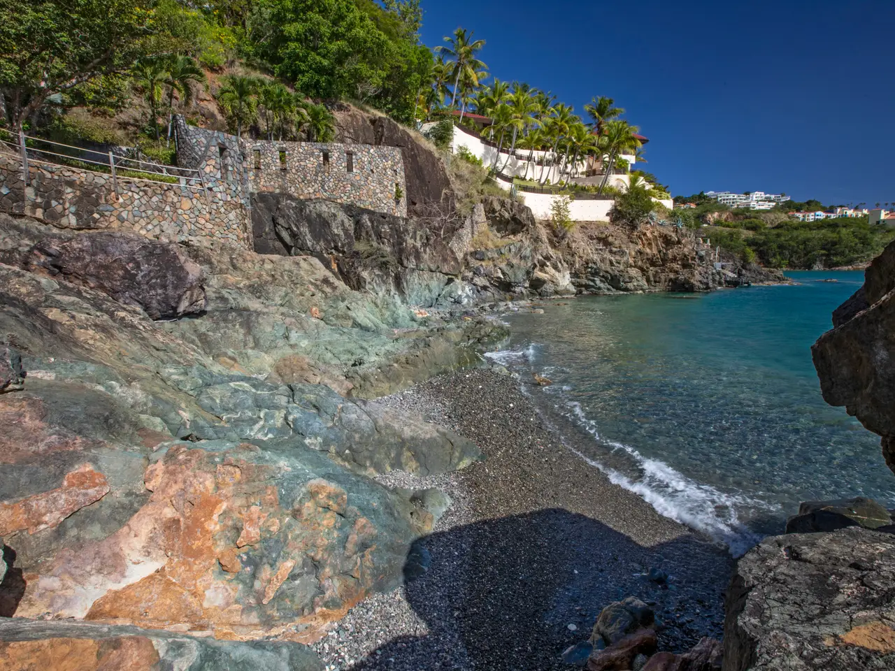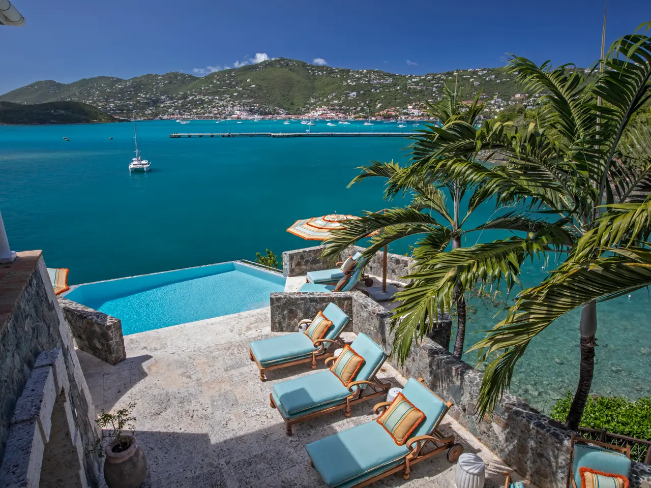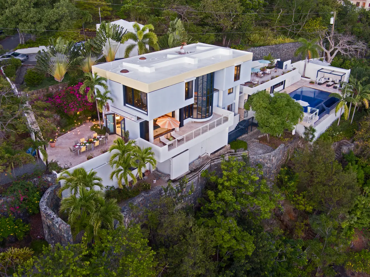 The Waterfront Estate is more than a home. It's a one-of-a-kind experience. The expansive nine-acre estate includes four homes and boasts a total of 18 bedrooms, 14 baths, two infinity pools and 25,490 square feet of luxury and privacy across 11 parcels. Tropical walkways bursting with royal palms and native plants connect all four homes. The real treasure among these are the two waterfront villas, both with direct water access. Stone staircases, as well as two trams with intermediate stops, allow you to descend all the way to the turquoise ocean below. As you enter the main villa, the tasteful and elegant furnishings will usher you to another era. Magnificent architecture, enchanting stonework, unique hardwoods, and a prized collection of antiques evokes feelings of nostalgia, grandeur, and adventure. Each room has a distinct persona and story of its own, from the 800 square foot great hall to the wine grotto, all brought together by the old-world charm of a Caribbean estate aesthetic. The fun truly begins as you step outside and explore the many terraces and verandas overlooking Charlotte Amalie harbor. Try your hand at shooting one of the two working water cannons straight into the Caribbean Sea. Relax on the lounge deck or soak in the infinity pool. Take a stroll along the gorgeous 50-foot white sand beach. Watch the sunset over Hassel Island on your own private 80-foot dock. Enjoy the Caribbean's most spectacular music and light show courtesy of the estate's terraced waterfall, which features 10 jumping jets, eight fire braziers, 17 falls, a fog machine, more than 100 LED lights and a holographic water screen. Whether you're interested in an exceptional island getaway or the ultimate place to entertain, this captivating property will exceed your expectations. Property Details: Main Villa: 5 Bedrooms, 5 Full Baths / 2 Powder Rooms, 6,500 Total Square Feet, Infinity Pool (1,630 Cubic Feet) Guest House Cottage: 4 Bedrooms, 2 Full Baths / 1 Powder Room, 2,400 Total Square Feet Second Villa: 6 Bedrooms, 5 Full Baths / 1 Powder Room, 4,400 Total Square Feet, Infinity Pool (2,750 Cubic Feet) Two Car Garage Third Home: 3 Bedrooms, 2 Full Baths