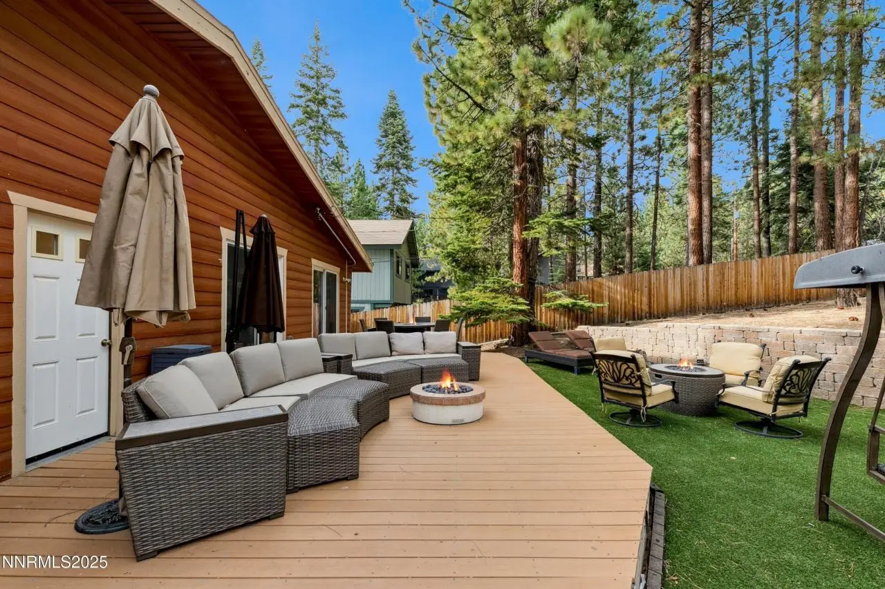 Having an A+ location, this beautifully remodeled home throughout, in move-in condition, highlights this special Middle Kingsbury property. The kitchen features recently updated wood/glass cabinetry, granite tile countertops, stainless steel appliances, gas stove, built-in microwave, pantry, & garden window. The living room features a handsome gas log fireplace, new wine fridge and wet bar. The primary bedroom has a newly installed, beautiful custom tile, double headed shower to die for (!), with double sinks, new lighting, three mirrored closets, & ceiling fan. Other features include newly installed hardwood floors, carpeting, doors & fixtures, blinds and drapes, Nest Thermostat, security system, laundry room, and even central A/C. The spacious, newly installed fenced back yard, features a huge patio/deck area, built-in natural gas fire pit, two other tabletop fire pits, with ample backyard furnishings. Exterior features include a paver driveway, terraced walls, bear box, & gated boat/RV parking! There is a bonus room set up in one of the garage spaces with TV for a separate theater/family room option, or it can be easily converted back to a full, two car garage. Located right across the street from miles of hiking and biking trails, and on a school bus route for early snow removal. Only five minutes to world class skiing at Heavenly Valley, and all the action in the casino corridor, including the Tahoe Blue Event Center. All the brand-new furnishings are negotiable.