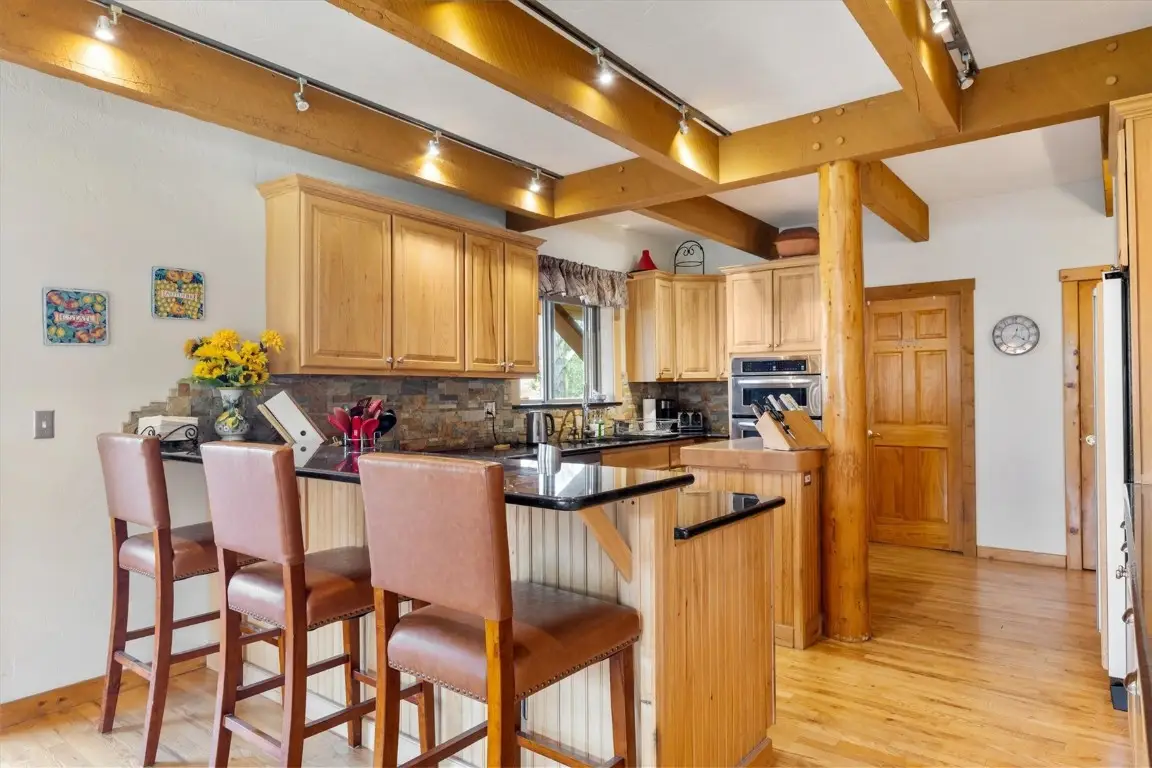 Tucked into one of Steamboat Springs’ most peaceful neighborhoods, this four bedroom plus den, 4.5-bathroom, post-and-beam home offers timeless mountain charm, functionality, and a rare opportunity in the highly sought-after Running Bear subdivision — where homes rarely change hands and lot sizes ensure privacy and space between neighbors. Situated on a .73-acre lot with sweeping views of Emerald Mountain and the South Valley, the home is designed for both everyday living and entertaining - with plenty of room to expand. Vaulted ceilings, hand-peeled log accents, and post-and-beam architecture lend rustic elegance, while natural light floods through large windows, highlighting oak hardwood floors and a stunning stone fireplace. The spacious kitchen offers solid granite counters, custom cabinetry, built-ins, and flows seamlessly into an extended dining area that opens to a newer low-maintenance deck — perfect for soaking in the views. Ideal for guests, long-term tenants, or a live-in caretaker, this property boasts a legal full apartment (ADU) with a private entrance. Perched above the spacious three-car garage, this self-contained suite features an additional separate bedroom, a full bath, a full kitchen, a living area with a fireplace, and a separate entrance. A mudroom/laundry area connects the oversized garage directly to the kitchen — an ideal setup for Steamboat’s active lifestyle and allows quick access to unload groceries. Upstairs, you’ll find a generous primary suite with a 5-piece bath, plus two additional ensuite bedrooms, including one with a bonus flex space, perfect for a playroom, home office, or media room. The lower level features a large, second family room with wet bar, an additional guest bedroom, a full bathroom, space for a home gym or workout space, and walk-out access to a beautifully landscaped yard and stone patio. New carpeting throughout enhances this space.
