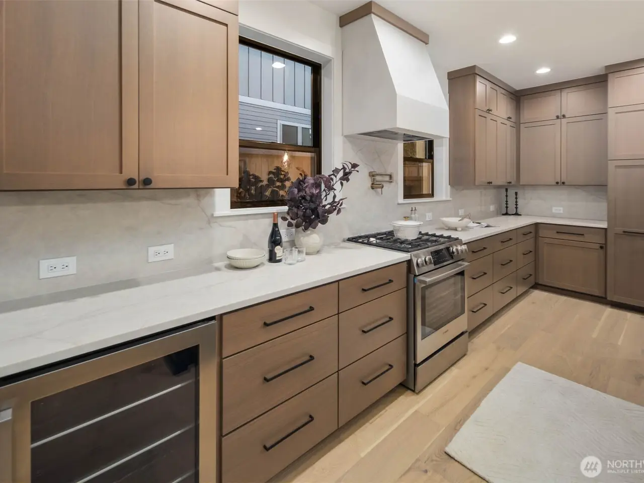 Luxurious custom built home in the heart of downtown Steilacoom. This home is 5 Bdrm 4.25 bath with an office on the main! Open concept floor plan w/ vaulted Entry & luxury engineered flooring throughout the home, beautiful gas fireplace in the living room area, designer kitchen w/ SS appliances, quartz counters & large island, tile throughout the bathrooms, Main-level guest suite with 3/4 bath. Primary bedroom with a peekaboo view of the sound, its own 5pc bath with his and hers walk-in closets, 2 car garage, covered outside patio with fully fenced yard, also professionally designed landscaping with irrigation front and back yard.No HOA, located just minutes away from downtown, parks, beaches, coffee shops, and the Anderson Island ferry.