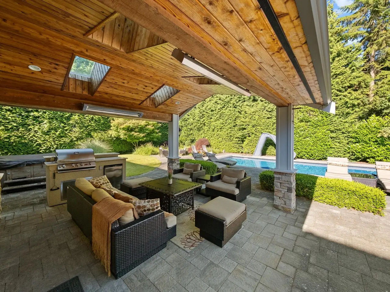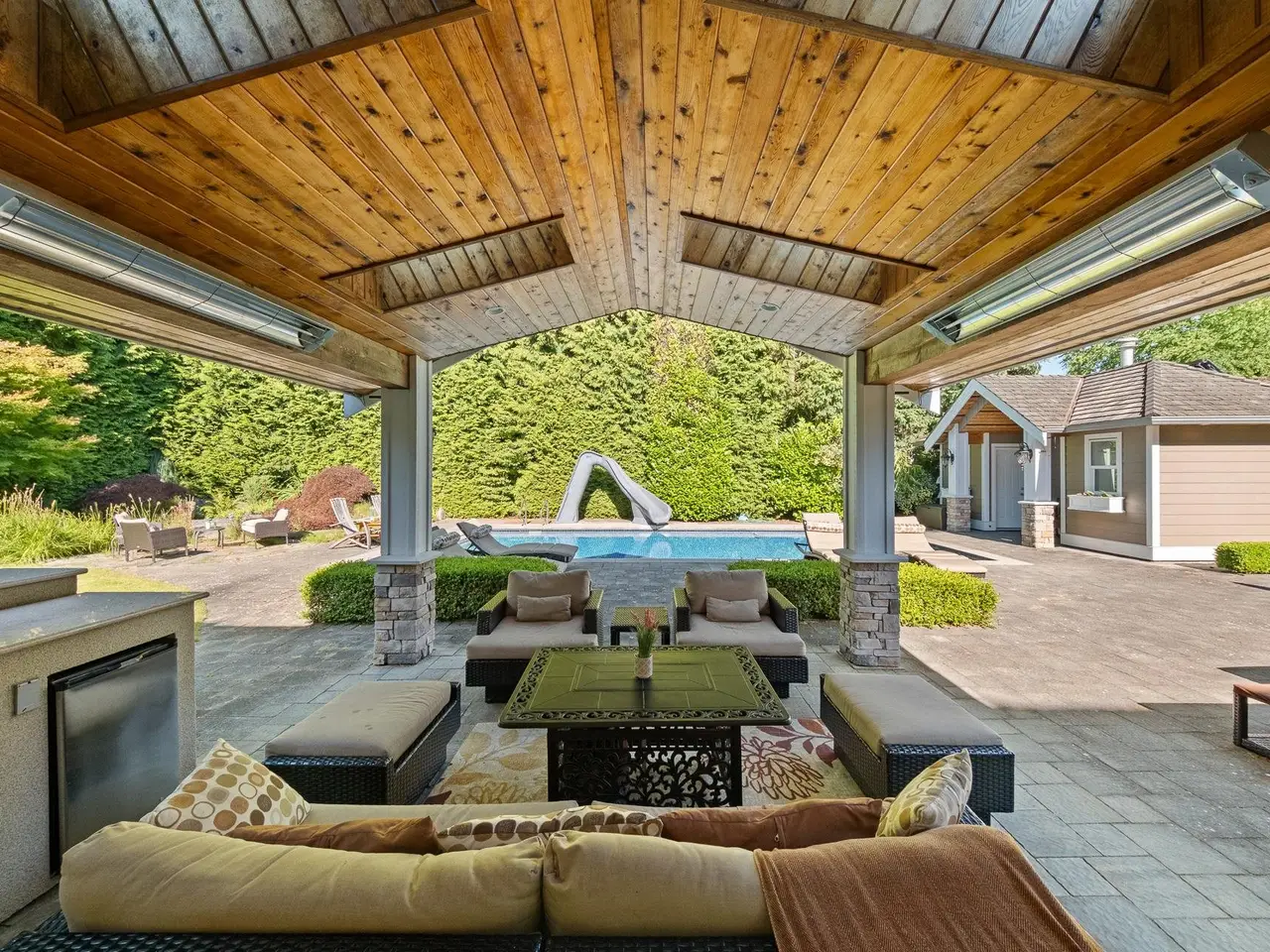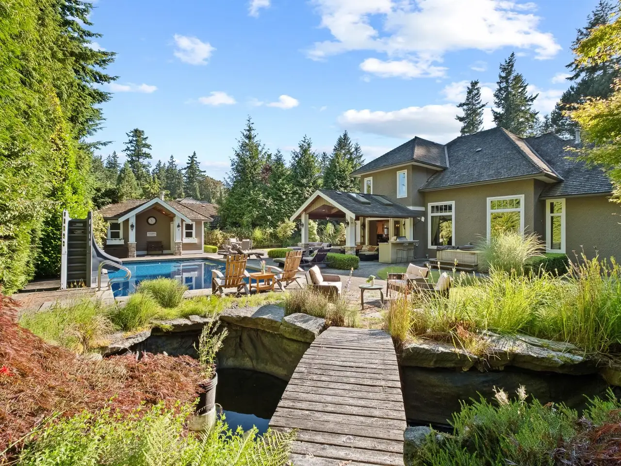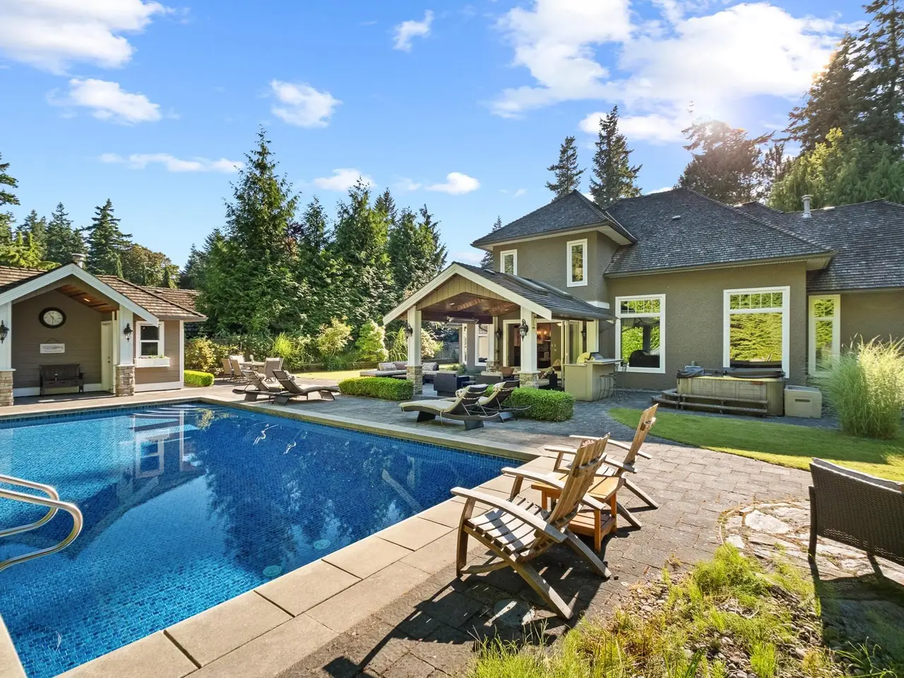 Welcome to this beautiful 3,358 SF custom home on a 14,723 SF lot in South Surrey’s coveted Elgin area. The main floor offers formal living & dining rooms, an eat-in kitchen, sitting area, stylish wine room, home office and lovely primary suite. Dual staircases lead to 3 generous upper bedrooms with ensuites. Enjoy the private, backyard oasis with a skylit covered patio area, built-in BBQ, hot tub, impeccably maintained inground swimming pool and pool house with bath and change room. Close to Crescent Park, scenic trails, and top schools Chantrell Creek & Elgin Park. Location, comfort and lifestyle…this is home!