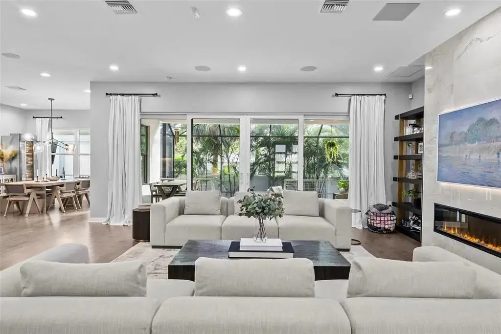 Welcome home to this 2019 Mid-Century Modern masterpiece by premier builder Ferncliff, Inc., perfectly positioned high and dry at 10.64ft in sought-after Bel Mar Shores within the coveted Mabry, Coleman, and Plant A+ school district. Designed for both casual elegance and modern living, this 5-bedroom plus office, 4.5-bath home offers over 4,150 square feet of thoughtfully designed space showcasing exceptional craftsmanship and the highest-quality finishes throughout. The open-concept great room impresses with soaring ceilings, abundant natural light, and expansive hurricane-rated sliding doors that flow seamlessly to the outdoor living areas. The chef’s kitchen is anchored by a dramatic waterfall Quartzite island and features imported Italian white lacquer cabinetry, Quartz countertops and backsplash, top-of-the-line stainless steel appliances, including a 5-burner induction cooktop with hood, double wall ovens, 42” built-in refrigerator, and dishwasher. A walk-in butler’s pantry, under-cabinet lighting, pendant fixtures, a wine bar with stainless sink and refrigerator, and a central vacuum system complete this exceptional culinary space. The first-floor owner’s suite is bright and serene, featuring a custom walk-in closet and a spa-inspired bath with a 6' x 14' walk-in shower with Kohler fixtures, Quartzite double vanity, freestanding soaking tub, and large-format porcelain tile floors. Completing the main level is a home office or playroom, a half bath, a mudroom with built-in storage, and a large laundry room. Upstairs, a striking open-tread staircase with stainless cable railing leads to a gallery landing with 13’ ceilings, three en suite bedrooms with walk-in closets, and a flexible bonus room perfect for a gym, office, or media space. The outdoor living area is a showpiece of its own, featuring a new pool and spa (completed Nov 2024) with color-changing LED lighting, and custom tilework, a 15x19 weatherproof pergola with auto louvers and integrated sun/wind shades, and a full Hestan outdoor kitchen with a 42” grill, 24” power burner, and refrigerator. The entire backyard is finished in lush turf for a clean, low-maintenance lifestyle. Additional highlights include a state-of-the-art whole-home solar power system that keeps electric bills around $15 per month, supported by smart backup batteries for seamless energy reliability (21.56kW system with 56 Meyer Burger 385W panels, 56 IQ8+ microinverters, and Anker Solix backup batteries with smart switch), Marantz surround sound system (living area, kitchen, and primary bath), 50-amp Tesla charger, water softener, custom primary closet built-ins, Dimplex fireplace wall, Swann security system, and new interior and exterior paint (Feb 2025). The oversized two-car garage offers 250 sq ft of elevated storage and a new epoxy floor (Feb 2025), with a ToughShed for additional storage on the southside. All windows and doors, including the garage, are hurricane-rated and high-security impact-grade, and the home includes dual-zoned 16 SEER HVAC, a smart DSC security system with app control, LED lighting throughout, in-wall pest tubes, and a Rainbird irrigation system. Located just minutes from Tampa’s best dining, shopping, and cultural attractions—and only seven miles from Tampa International Airport—this home perfectly blends architectural sophistication, energy efficiency, and the relaxed elegance of South Tampa living.