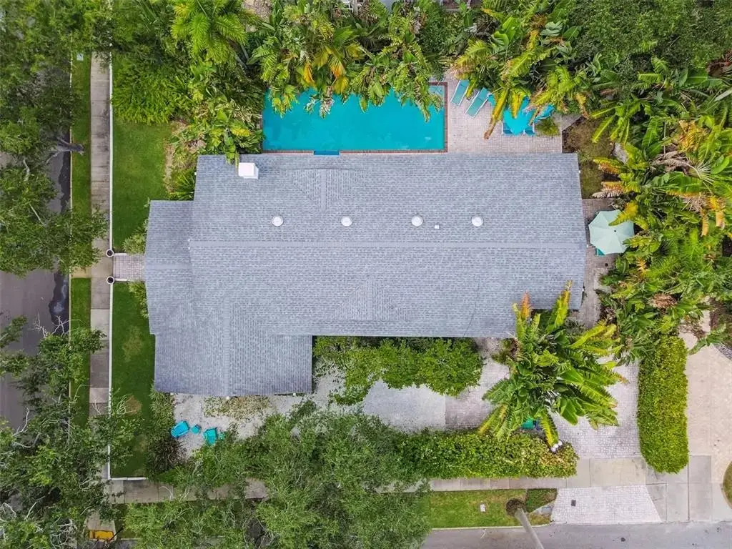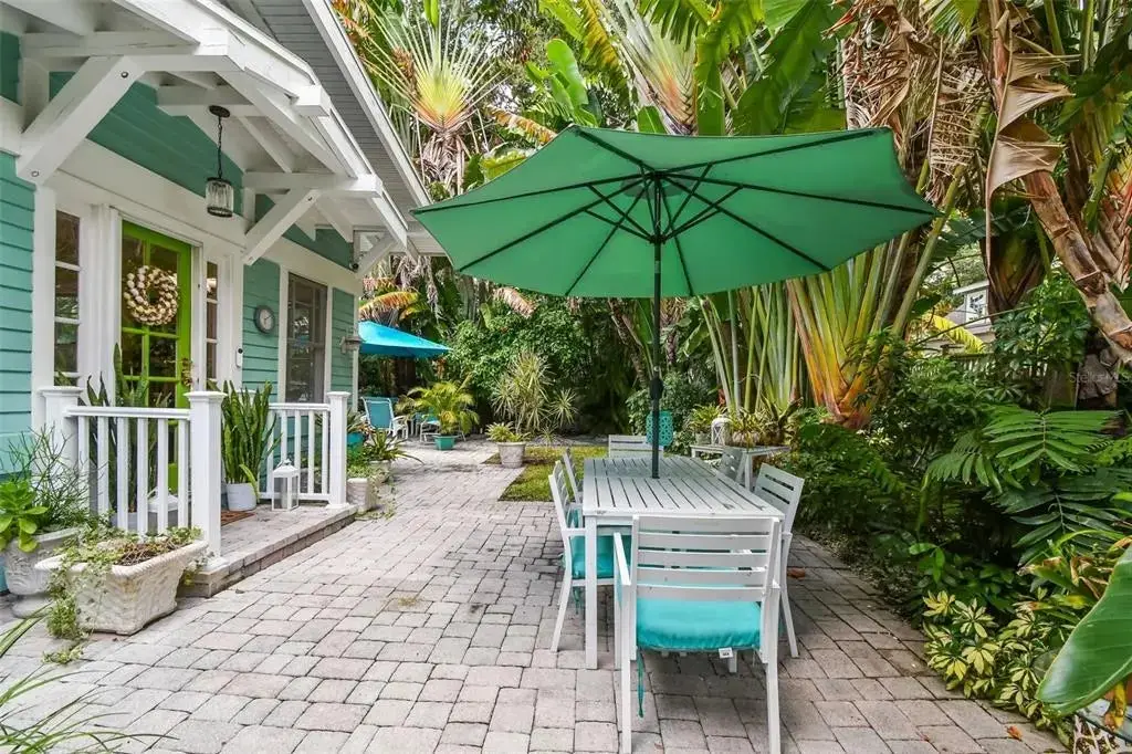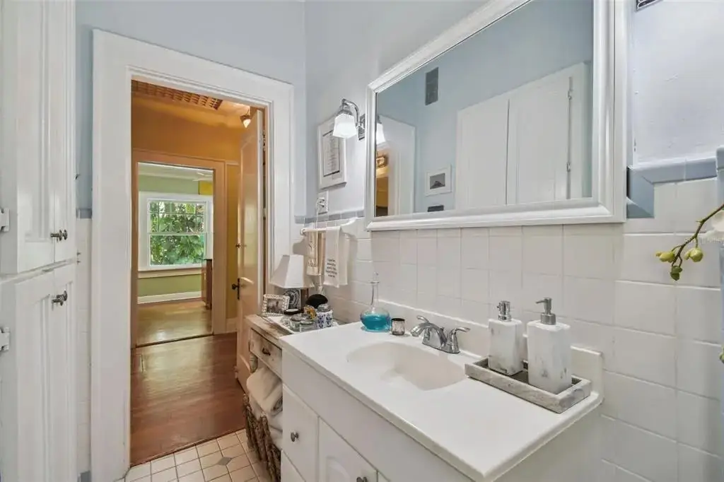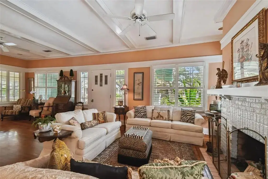 This timeless 1914 Hyde Park residence offers 2,276 square feet of character-rich living space on a rare lot and a half, perched approximately 20 feet above sea level. The property presents a unique opportunity to enjoy a smaller-scale home in Hyde Park or take advantage of the generous lot to add a garage or guest house. Inside, hardwood floors, ornate crown molding, custom shutters, and high coffered ceilings create a sense of grandeur throughout. The formal living room showcases built-in bookshelves and a wood-burning fireplace, while the formal dining room features beveled baseboards, a coffered ceiling, and bay windows overlooking the pool. A sunroom overlooking the side yard brings abundant natural light into the home. The kitchen is a chef’s delight, complete with dual ceiling fans, a center island with bar seating, GE Profile 5-burner natural gas cooktop with vented hood, double built-in ovens, and a cozy corner dining spot. A secondary sitting area with French doors opens to the patio, while a large laundry room adds everyday convenience. The primary suite offers a walk-in closet and a spacious sitting/dressing room that can easily be converted into an ensuite. Bedroom two highlights heart-of-pine wood floors, a custom-built bookshelf with desk, and closet units framing large double-hung windows. Outdoors, the tropical backyard is a private retreat with a resurfaced 40x15 heated pool, outdoor shower, and lush landscaping maintained by a 6-zone reclaimed water sprinkler system. A brick-paved driveway and both side and rear parking pads with space for three vehicles provide ample parking options. Additional features include underground utilities (electric, phone, fiber optic), private paver alley, Roof (2016), AC (2018). This property is a rare find—original features, elegant touches, and room to expand—all in one. Whether you’re drawn to its historic charm or envisioning future possibilities, this home offers a truly unique opportunity
