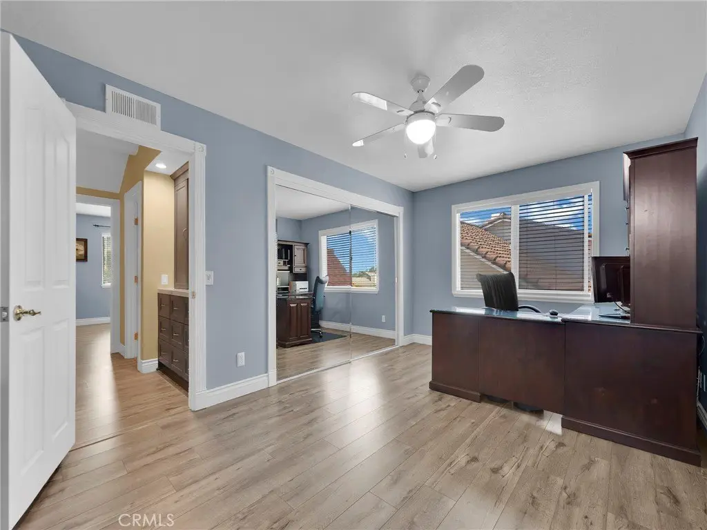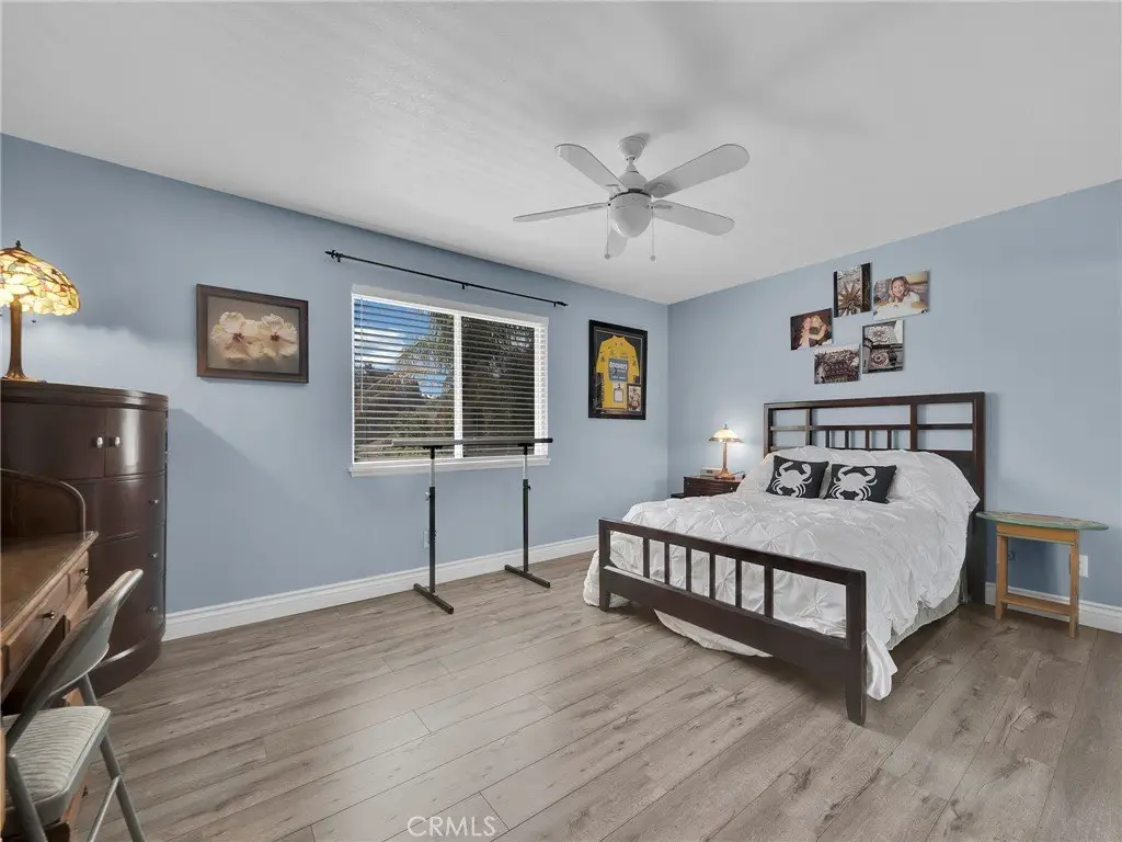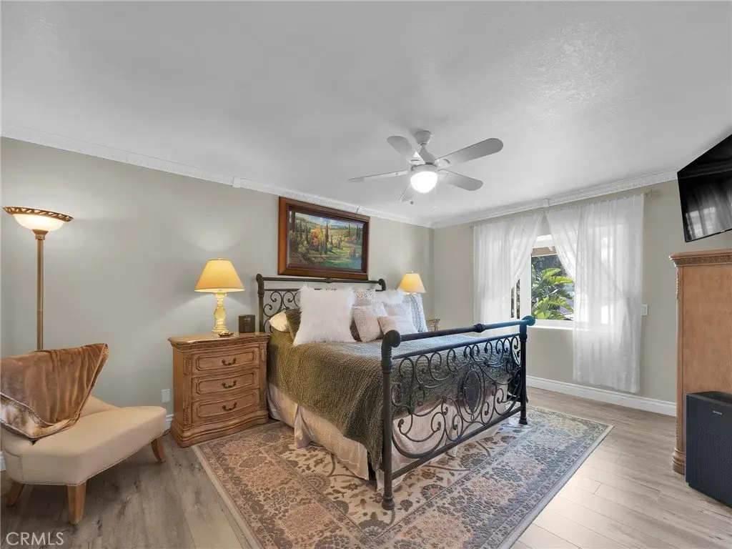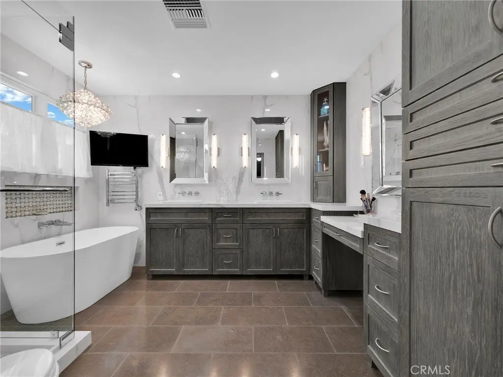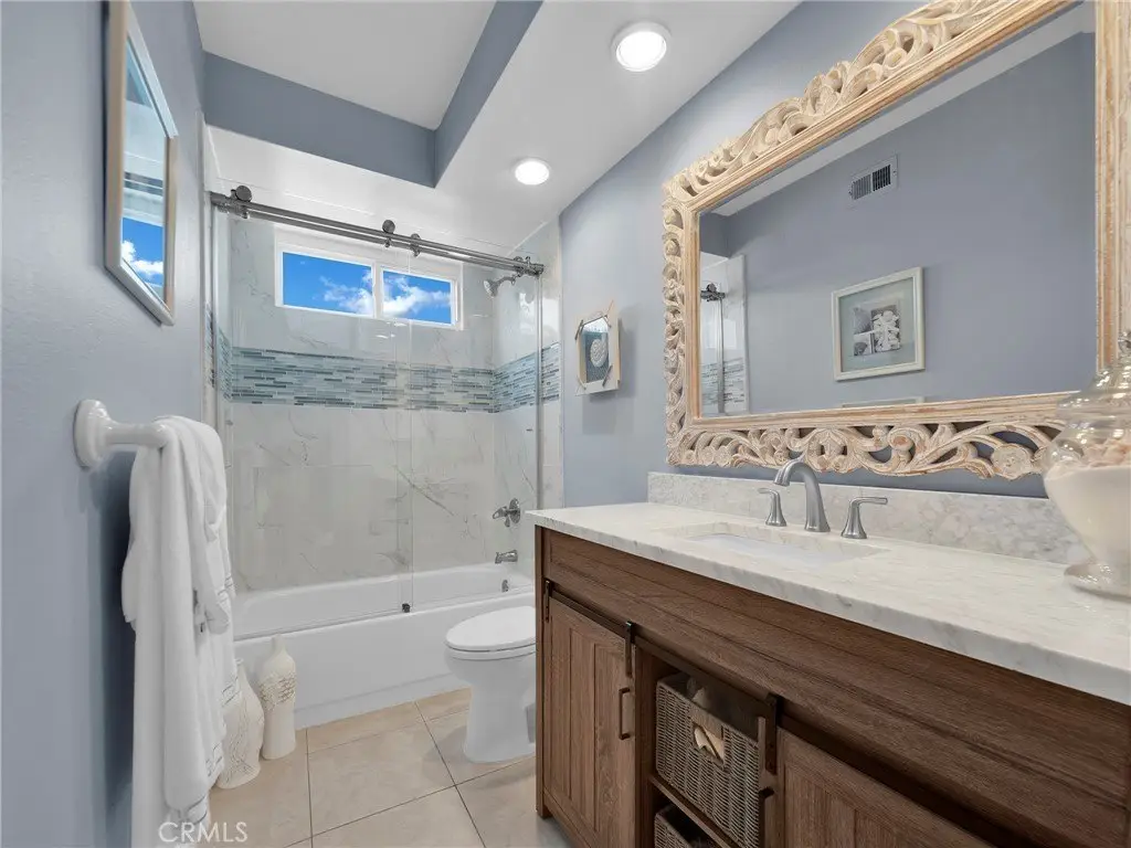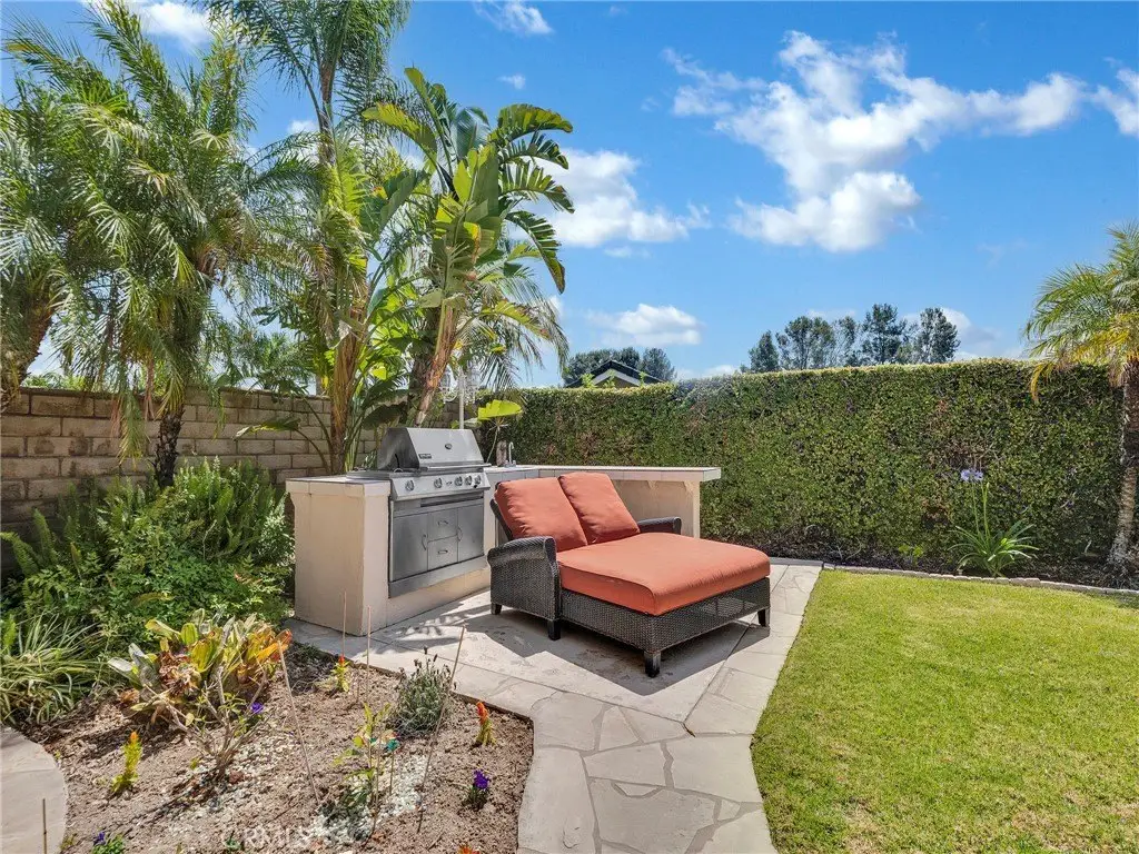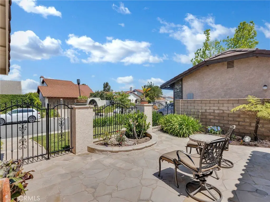 This elegant two-story home blends timeless sophistication with modern upgrades. Energy efficiency meets luxury with a fully paid-for solar system that keeps annual electric costs under $50. Featuring 4 bedrooms, 3 remodeled bathrooms, and a three-car garage, this residence is thoughtfully designed for both everyday comfort and stylish living. Enter through a charming courtyard entry into an inviting living and dining space adorned with travertine flooring. The heart of the home is the chef’s kitchen, showcasing a large center island, custom cabinetry, granite countertops, and a spacious walk-in pantry—ideal for entertaining. The open-concept family room is filled with natural light and includes a built-in flat screen TV. French doors lead to a private backyard oasis, complete with a built-in BBQ, custom patio cover, and room for a pool—perfect for summer fun and outdoor gatherings. Upstairs, retreat to the luxurious primary suite, where a 2022 remodel transformed the bathroom into a true spa experience. Highlights include soapstone floors, porcelain walls and counters, custom cabinetry, double sinks, freestanding soaking tub, oversized walk-in shower, designer fixtures, towel warmer, and an expansive walk-in closet. Two additional upstairs bedrooms share another beautifully remodeled full bath, while a main-level bedroom and bathroom (remodeled in 2022) offer a flexible space perfect for a home office, guest suite, or multigenerational living.