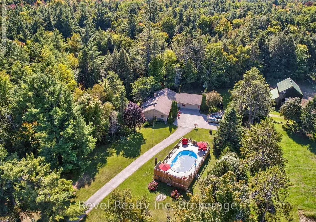 Welcome to your private 48.39-acre haven - a rare chance to leave the city chaos behind and embrace a simpler, more fulfilling way of life. As you enter the winding driveway, three majestic old-growth white pines known as the Three Sisters stand as timeless guardians of this serene property. The custom-built bungalow offers generous living space with cathedral ceilings, a double-sided gas fireplace, and triple-pane windows framing views of the pond, creek, and landscaped grounds. The main level includes a spacious kitchen with walkout to a deck, a primary bedroom with ensuite, main floor laundry, and inviting family spaces. The lower level features a recreation room with wood fireplace, two additional bedrooms, a beautifully updated bathroom, two grooming rooms that can be transformed into whatever you need and a walkout to the backyard and into the garage ideal for multi-generational living or a home business. Outside, discover endless opportunities: a century barn with hay loft, two paddocks with direct trail access, a sugar shack, chicken coop, and a 5-foot fenced area for your furry friends. The expansive 4-bay drive-in shed with oversized doors is perfect for boats, tractors, or collector cars. Trails wind through a mix of old-growth forest and open meadows perfect for horseback riding, hiking, or simply exploring nature at your doorstep. In summer, enjoy the 18x33 above-ground pool with a full deck and tiki bar, creating the ultimate space for entertaining. In winter, gather by the wood-burning fireplace and watch the snow fall across your private oasis. With many updates throughout and a forest management plan option for tax savings, this property is both practical and inspiring. Whether you dream of raising animals, tapping your own maple trees, or running a home-based business, this land makes it possible. A true sanctuary, ready for its next chapter yours. (id:7434)