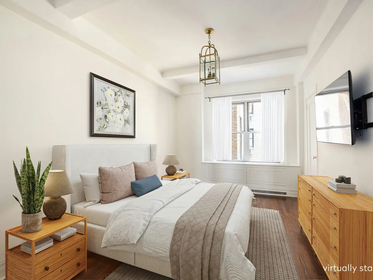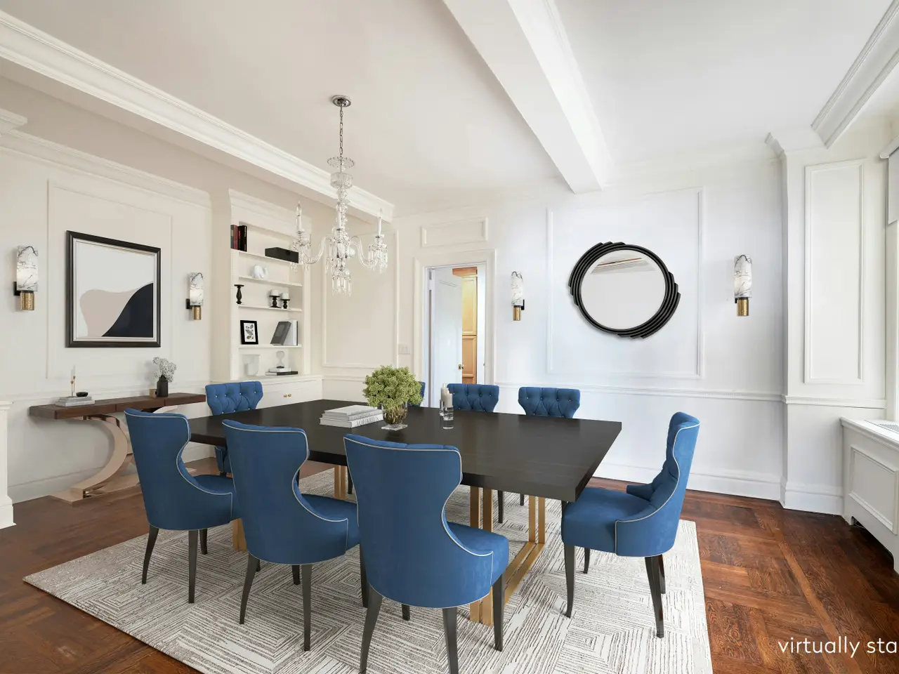 Off a semi-private landing, an elegant welcoming gallery connects the living room, dining room, and bedroom hallway. The gracious living room has two impressive oversized windows overlooking Park Avenue. A beautiful wood-burning fireplace with marble mantel serves as the central focal point of the room. High beamed-ceilings, hardwood floors, and prewar details complete this wonderful space. Across the gallery a generous dining room with handsome built-ins and lovely details is ideal for entertaining. The spacious windowed eat-in kitchen has full LG appliances and an ample pantry with washer/dryer and plentiful storage. Beyond the kitchen is a staff room with an en suite windowed bath. Two large bedrooms are off a private hall. The primary is spacious with double windows offering lovely Park Avenue views. A generous dressing area leads to an oversized en suite bath with a tub, separate walk-in shower and sink. The second bedroom is also sizable with great proportions. It has a windowed en suite bath. The apartment has hardwood floors, prewar details, high beamed-ceilings, through-the-wall air conditioning, tremendous closets and storage, and is in very good condition. 975 Park Avenue, built in 1929 is a medium-sized established cooperative with 66 apartments on 16 floors. The building has a 24 hour attended entrance, gym, bike room, private storage, a resident manager and friendly staff. The building is managed by Douglas Elliman Property Management. There is a 2% flip tax.