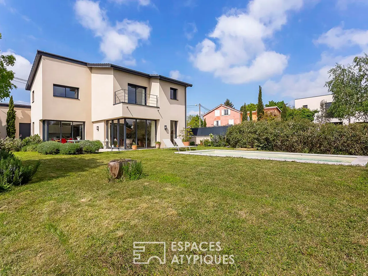 Nestled in a quiet and sought-after residential area, this 145 m² contemporary house, built in 2016, sits on a carefully landscaped 580 m² plot, featuring a 3x7 swimming pool and outdoor spaces designed for relaxation. From the entrance, the spaciousness and brightness capture the eye: the 66 m² living area unfolds in an open space around a fully equipped kitchen, enhanced by a corner bay window that blurs the lines between indoors and outdoors. The south-facing terrace and swimming pool provide an ideal setting for entertaining or relaxing, sheltered from view. The upper floor houses four bedrooms, including a master suite with a private shower room and custom-made dressing room. A separate bathroom completes this level. Thermal comfort is ensured by underfloor heating powered by a heat pump, guaranteeing optimal energy efficiency. The 45 m² (480 sq ft) insulated and already connected garage offers the possibility of creating a separate studio—a rare opportunity in this area where proximity to schools generates strong rental demand. A property with high-quality features, in a dynamic, family-friendly neighborhood, combining modernity, comfort, and growth potential. ENERGY CLASS: B / CLIMATE CLASS: A Estimated average annual energy costs for standard use, based on 2021 energy prices: between €690 and €970 Contact: Amandine: +33 6 50 86 46 08 REF. 10789 Additional information * 5 rooms * 4 bedrooms * 2 bathrooms * Outdoor space: 580 SQM * Property tax: €1,700 Energy Performance Certificate EPC: 73 kWhEP/m2.year