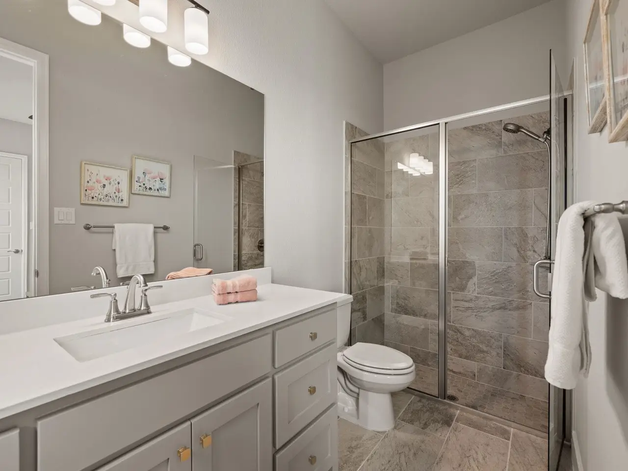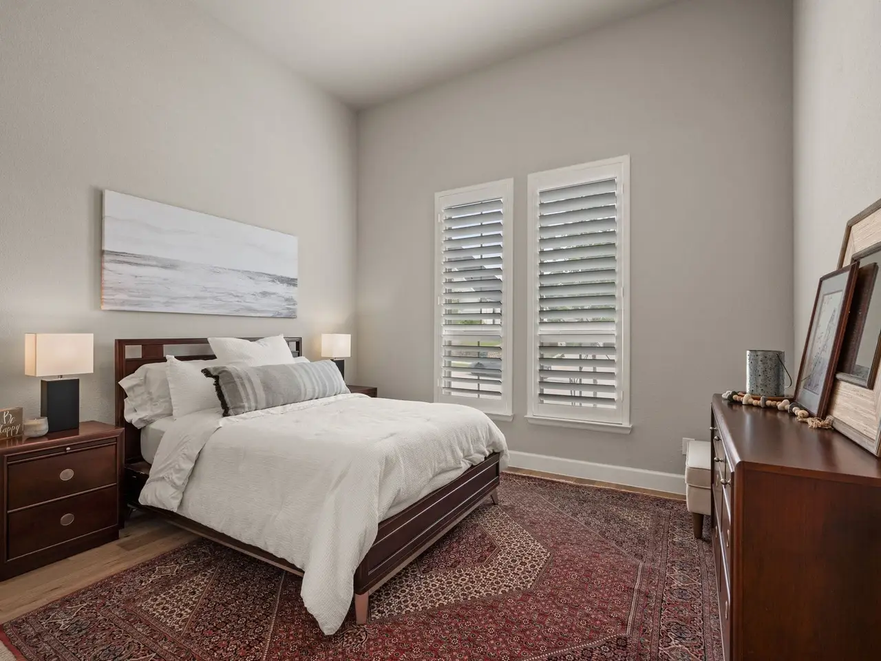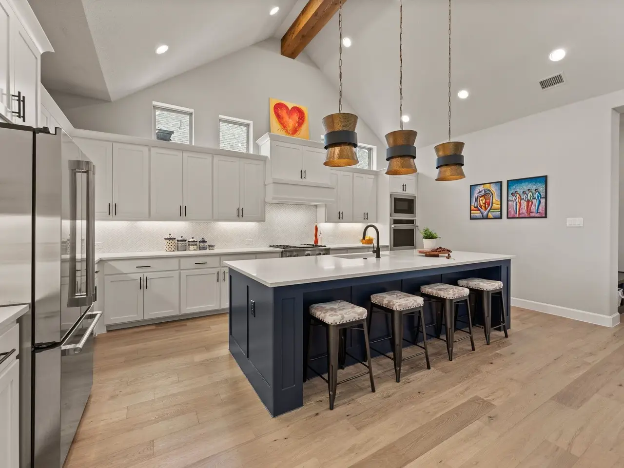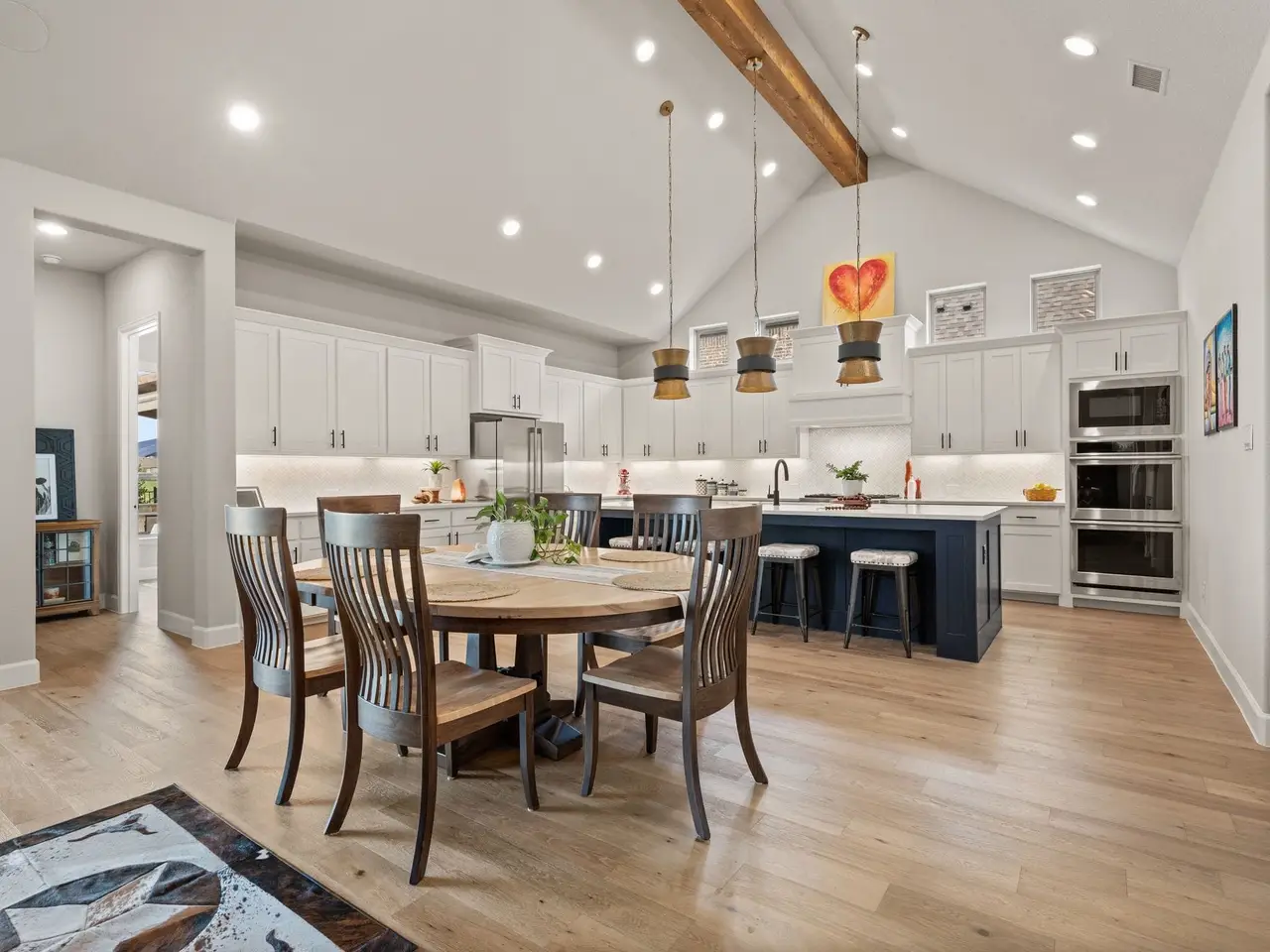 Impeccably maintained single-story with all the right spaces! Four bedrms in a 3-way split layout. The primary BR offers a beautiful view of the pool & greenbelt behind the home! All bedrms feature en-suite baths, plus there's a half bath off the front foyer! The massive, open concept family room-breakfast room-kitchen will impress! Here you will find a beamed ceiling spanning the area, gas fplc & sliding doors to the covered patio with remote drop screen. The spacious kitchen offers tons of quartz counterspace, white perimeter cabinets, center island painted a contrasting blue, gold hardware, designer pendant lighting, gas range, dbl ovens + a butlery area with wine cooler. In addition, there is a 2nd liv-flex space currently outfitted as a gym with rubber flrs, but there is white oak flooring underneath! The home office is just off the main foyer & offers French doors for privacy. This home is better than new with many upgrades: ALL white oak wood floors except tile baths, plantation shutters, upgraded gold cabinet pulls, HALO whole-house water filtration & more! Premium Claffey pool: dramatic infinity edge, play depth, raised spa, travertine pool deck, tanning ledge with umbrella, fire & water bowls! The detached cabana features a gas fireplace, cantilevered remote awning that projects out for extra shade, granite bar, Hestan grill & True beverage fridge. 3-car tandem garage with epoxy floors! Lush front landscape (HOA mows the front yard only). The north-facing backyard overlooks the greenbelt & offers low maintenance landscaping & spectacular sunsets! The community as many amenities, incl the Canyon Falls park & playground!