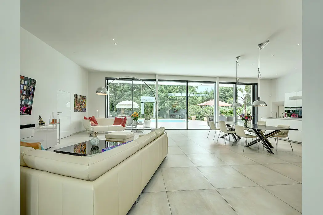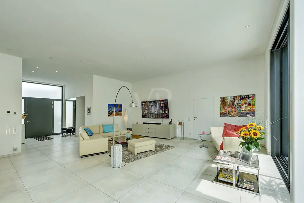 Welcome to a unique opportunity that combines the highest standards of modern living with exceptional architecture. This as-new Bauhaus-style villa was completed in 2021 and is located in a quiet cul-de-sac right on the edge of the forest. With a living space of approx. 212 m² on a generous plot of approx. 1,586 m², this property combines solid construction - including partial concrete and KS masonry with a thickness of 36.5 - 54.5 cm in a thermal insulation system - with innovative technology and exclusive furnishings. The house thus achieves the Kfw 40 standard as an A-plus house with excellent energy values!!! The prestigious driveway and the impressive entrance lead into the heart of the property: cooking, dining and living are harmoniously combined in a spacious loft-like room concept. The Thelen design kitchen, equipped with high-quality branded electrical appliances, offers a cooking island with induction wok tepanyiaki hob, oven, steam cooker, wine fridge, refrigerator, dishwasher, two sinks and a powerful extractor fan. The floor coverings made of high-quality porcelain stoneware in 80x80 format were laid uniformly inside and out and underline the homogeneous appearance. Large, 3.20-metre-high aluminum windows with the highest insulation level and safety glass, electric external blinds or aluminum roller shutters (insulated and controllable via Bluetooth), as well as skylights flood the entire house with light. Over-height, flush-fitting interior doors (invasive flat closing) and impressive ceiling heights create a special sense of space. The master bedroom boasts custom-made built-in closets and direct access to the garden. The adjoining master bathroom is equipped with Keuco furniture and sanitary ware and features exquisite marble-look surfaces, an experience shower, WC and bidet as well as a free-standing bathtub. A total of 5.5 rooms are spread over the living space. Two further rooms are connected by a sliding door and can also be accessed separately from the hallway and living area. A guest bathroom with a walk-in shower is conveniently located next to an additional bedroom. A custom-made built-in wardrobe in the hallway provides storage space. The property includes an oversized terrace across the entire width of the house. The floating concrete elements along the living room are a special feature. Three electrically operated awnings can be controlled individually and, if desired, fill the open interior spaces to provide you with sun and rain protection on the terrace. Here you will find space to create your lounge seating set and your outdoor dining area. Another highlight is the 8.00 x 4.00 m pool with pool heating, automatic water quality control, pool robot and cover), outdoor shower and another terrace at the edge of the forest. The garden is equipped with a fully automatic irrigation and lighting system as well as a lawn robot and offers a variety of uses. A separate forest terrace invites you to linger. A 3-car garage with electric sectional doors and built-in cupboards, four outdoor parking spaces and a gate access to the garden are available for your vehicle fleet. Particularly suitable for driving into the garden with a trailer or for parking additional cars. The utility room and laundry room are accessible via the garage and the living area. The highest security standards are guaranteed by a video surveillance system. An energy-efficient Buderus geothermal heat pump with underfloor cooling meets the KfW 40 standard and guarantees sustainable heating and cooling technology by means of underfloor heating throughout the house. This property represents luxury of the highest living standards at all levels - come and see for yourself during a personal viewing.