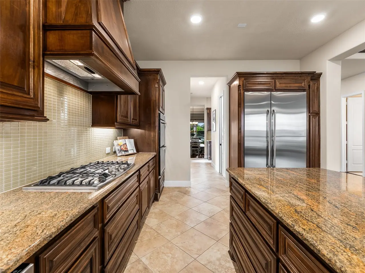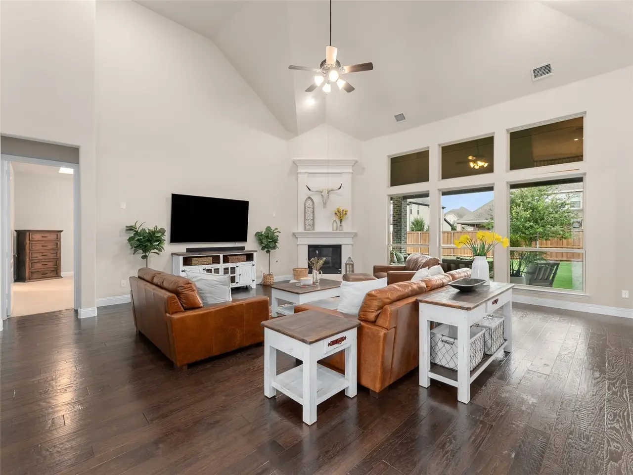 Welcome to this stunning Gallery Custom Home in the desirable Lakes of La Cima community, located within top-rated Prosper ISD. Situated on a spacious 0.333-acre lot, this 5-bedroom, 4.5-bath home offers 5,399 sq ft of luxurious living and a 3-car garage with a porte cochere and circular drive that make a grand first impression.Step through the elegant double iron doors to find rich wood floors, a formal dining room perfect for gatherings, and a dedicated office with soaring tray ceilings. Designed for entertaining, the home features a chefs dream kitchen with an oversized island (extra storage front and back), built-in refrigerator, gas cooktop, and double convection ovens. Youll also love the bonus prep kitchen space with gas stubideal for future customization.The expansive living room impresses with vaulted ceilings and a cozy gas log fireplace. The private first-floor primary suite offers a serene retreat with a spa-like bath, featuring double vanities, a garden tub, oversized shower, and a massive walk-in closet. Also on the main floor is a generous guest suite with walk-in shower.Unique to this home is a media room located between the first and second floorsperfectly tucked away for movie nights, sports, or gaming without disrupting the main living spaces.Upstairs, youll find a large game room, three oversized bedrooms, and two full baths, including another ensuite and a bonus room ideal for play, study, or storage. Enjoy evenings on the expansive covered patioperfect for outdoor dining, lounging, or future entertainingoverlooking a spacious backyard with plenty of room to play or add a pool. Due to the home's proximity to the nearby fire station, the homeowners never lost power during the 2021 Texas Freezeoffering an added layer of peace of mind.Community amenities include pools, parks, fishing ponds, and trails. A truly exceptional home offering space, style, and comfort in a sought-after neighborhood.