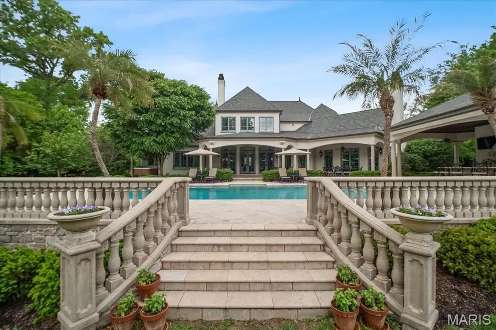 Experience timeless elegance in this custom-built estate with over 10,000 sq ft of refined living on a private 1.79-acre lot in Ladue. This home blends classic design with resort-style amenities. Rich hardwoods, soaring ceilings, and intricate millwork define the interiors. The main level boasts a luxurious primary suite with spa-like bath and private outdoor access. Four fireplaces, including one in the vaulted hearth room with exposed beams, add warmth and charm. The chef’s kitchen flows into open living areas designed for upscale entertaining. Outdoors, enjoy your own private resort with a large pool, lush landscaping, covered patios, and a full pool house with kitchen and bar—perfect for elegant soirees or relaxed gatherings. Upstairs offers a loft-style family room, spacious office, and guest suites. Six bedrooms, custom details & a layout built for luxury living, this is a rare chance to own a generational property in one of the area's most desirable locations.