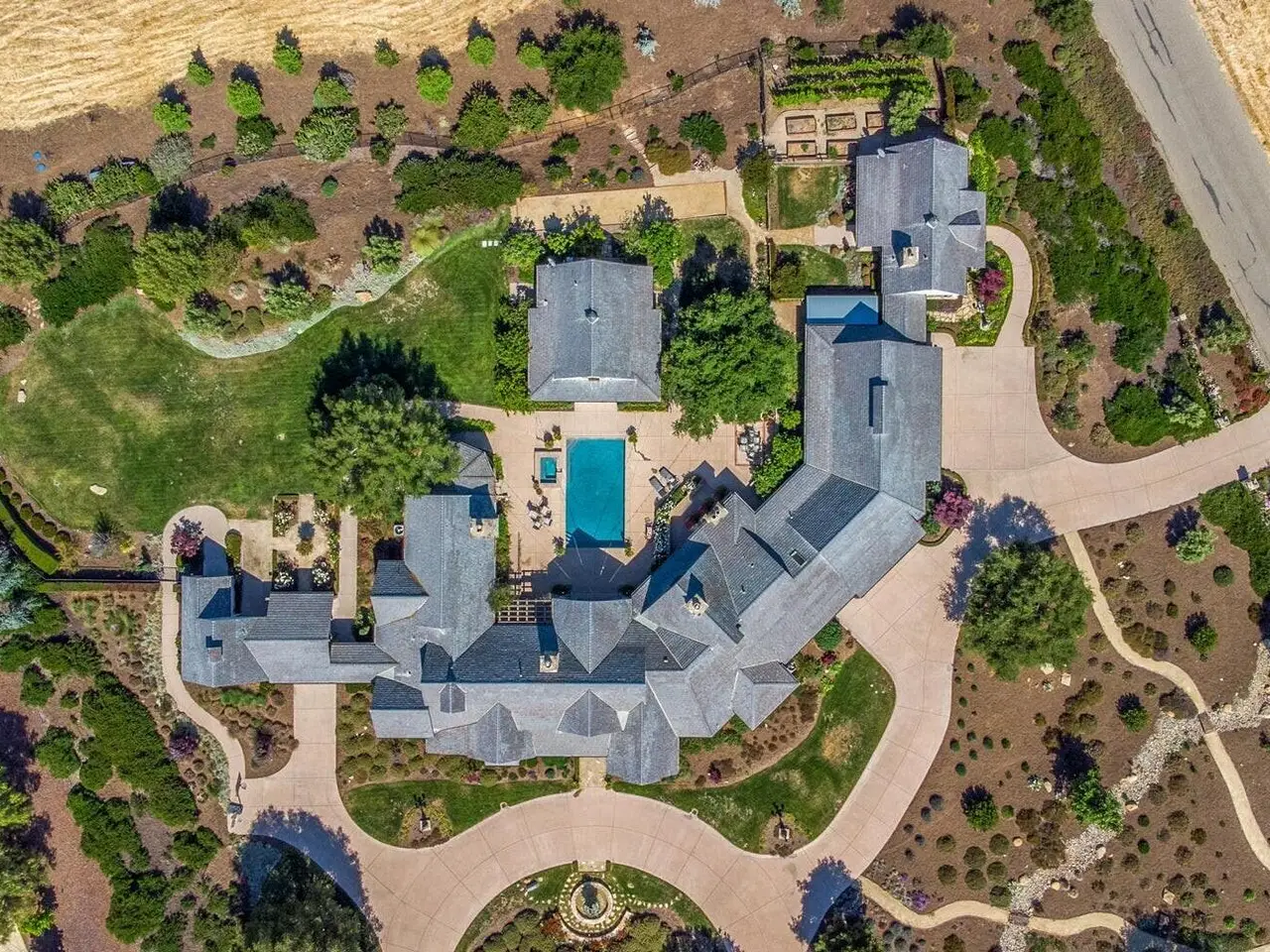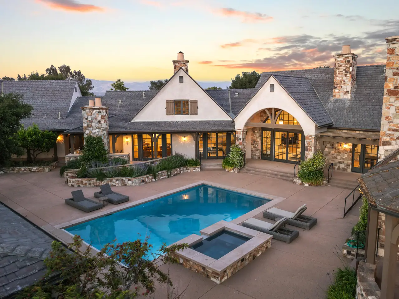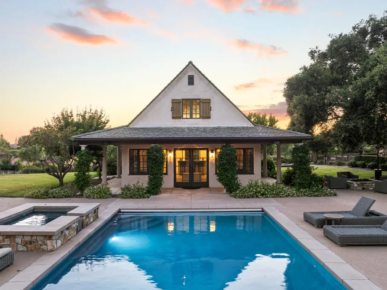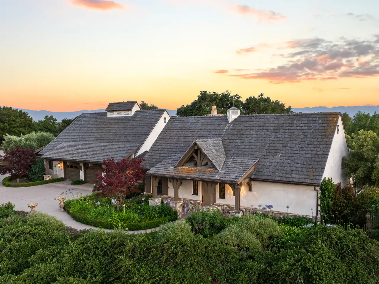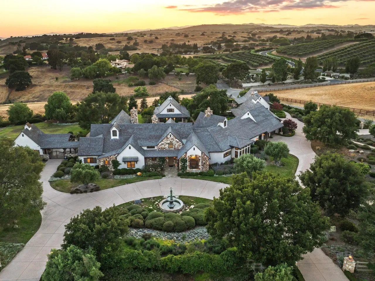 Discover the ultimate in refined Santa Ynez Valley living at 1325 Ladan Drive, an estate set on 4.33+/- gently rolling acres in prestigious Regency Hills Estates and the coveted Ballard School District. This exquisite property offers a blend of timeless elegance and modern luxury complete with an exquisitely reimagined Belgian Farmhouse, guest house, design/workshop studio, ample garage space, pool, spa, pool house, boutique vineyard, bocce ball court, and pasture space. Completely transformed in 2022-2023, the 5,300+/- sf main residence was remodeled to perfection with French oak floors, Calacatta Viola countertops, custom cabinetry, and curated lighting by Kelly Wearstler, Punch London, Noguchi, and RH. The chef's kitchen is a dream, featuring a Wolf range, dual Sub-Zero refrigerators, and an open layout designed for effortless entertaining. Warm fireplaces anchor both the living and family rooms, and a private office with library-style bookcases provides a quiet retreat. The primary suite is a haven with its romantic fireplace, private patio, and spa-inspired bath with steam shower, soaking tub, and bespoke dressing room closet. Two additional spacious guest bedrooms and a billiards room add to the home's inviting layout, while a home theatre elevates everyday living. Outside, the estate unfolds into a series of thoughtfully designed amenities: a pool with new plaster, tile, coping, and automated cover; a pool house with a bar, full bath, and open space for a gym, game tables, or relaxing lounge area; and a charming guest house featuring a kitchen, sitting room, bedroom, and bath. Additionally, the workshop/studio is equipped with three 40-amp circuits, ideal for wine refrigeration or artistic pursuits, and 2 roll-up doors for flexible use. The five-car collector's garage offers custom cabinetry, dedicated laundry, and attic storage with a lift for ease of access. Meandering pathways lead through romantic gardens, specimen olive trees, fruit orchards, grapevines, organic cedar planter beds, and tranquil patios with sweeping valley views. A bocce ball court and open pasture await your horses or even a future pickleball court! Enhanced with smart home integration for lighting, sound, and security, this remarkable estate is both an entertainer's paradise and a peaceful retreat. Welcome to your forever home - a place of pure bliss and timeless sophistication in the heart of the Santa Ynez Valley.