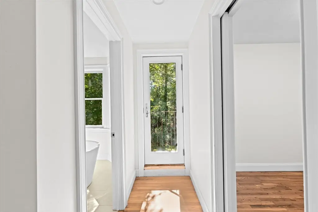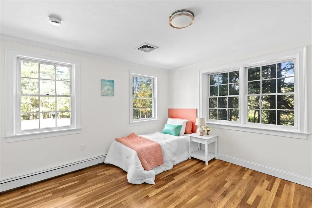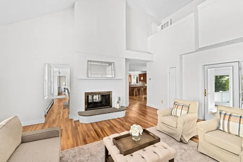 Spacious and Tranquil! This lovely Colonial is perfectly nestled on a private retreat lot offering a serene setting and a sprawling front yard. The heart of the home is the expansive kitchen featuring two islands, new appliances, and a sunlit breakfast area. The first floor also includes a formal living room, laundry room, and a spectacular family room with soaring 17-foot ceilings and a see-through fireplace connecting to the dining room. An inviting sunroom opens to a newly built composite deck overlooking the peaceful backyard. Upstairs, the primary suite is a true retreat with a Juliet balcony, walk-in closet, and a luxurious en-suite bath with a soaking tub. Two additional beds ,a full bath and office complete the second floor. The walk-out lower level offers a versatile playroom, ample storage, and a three-car garage. Conveniently located near Wompatuck State Park, South Elementary School and the train to Boston.