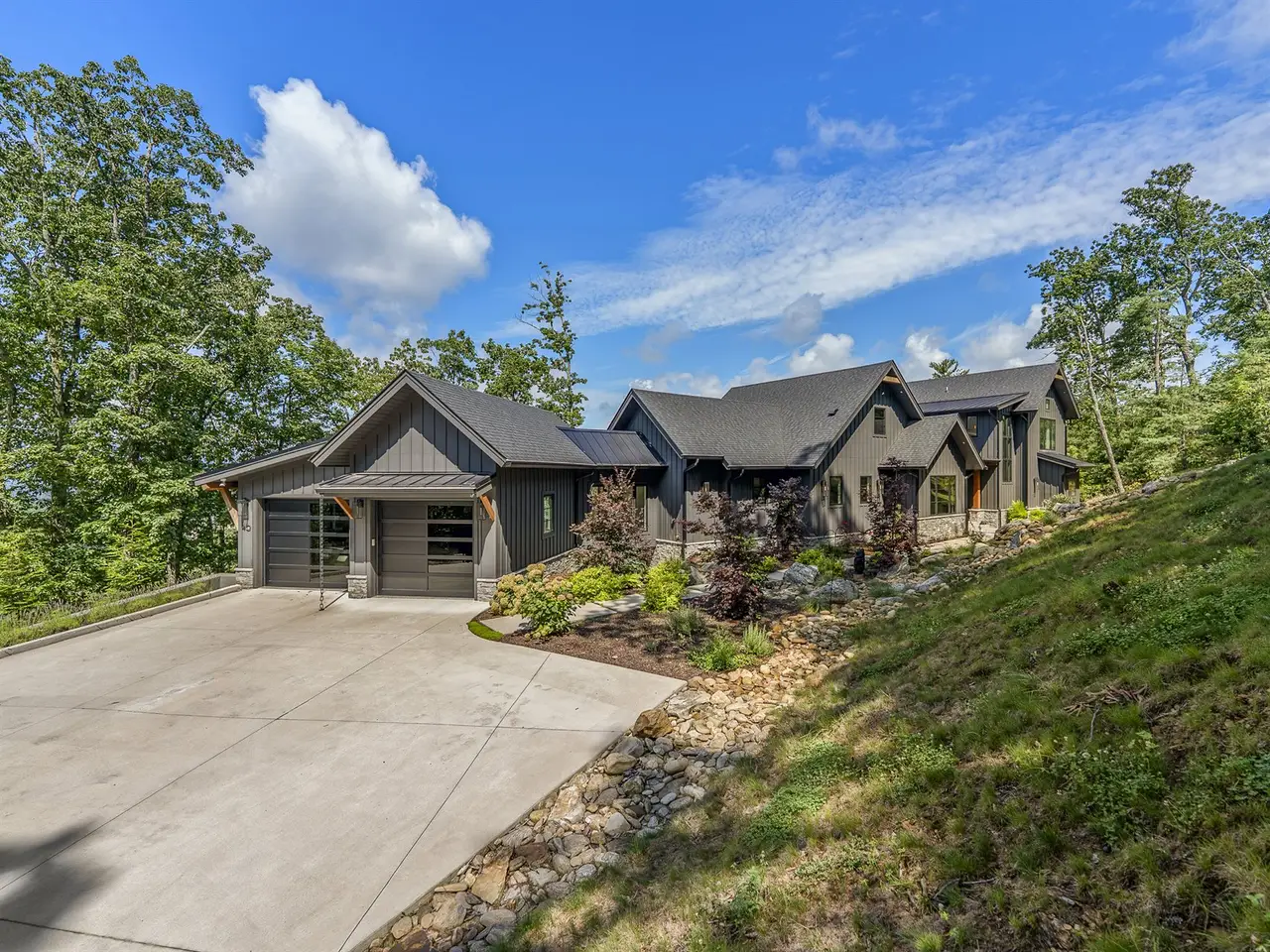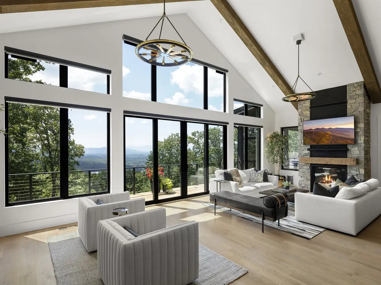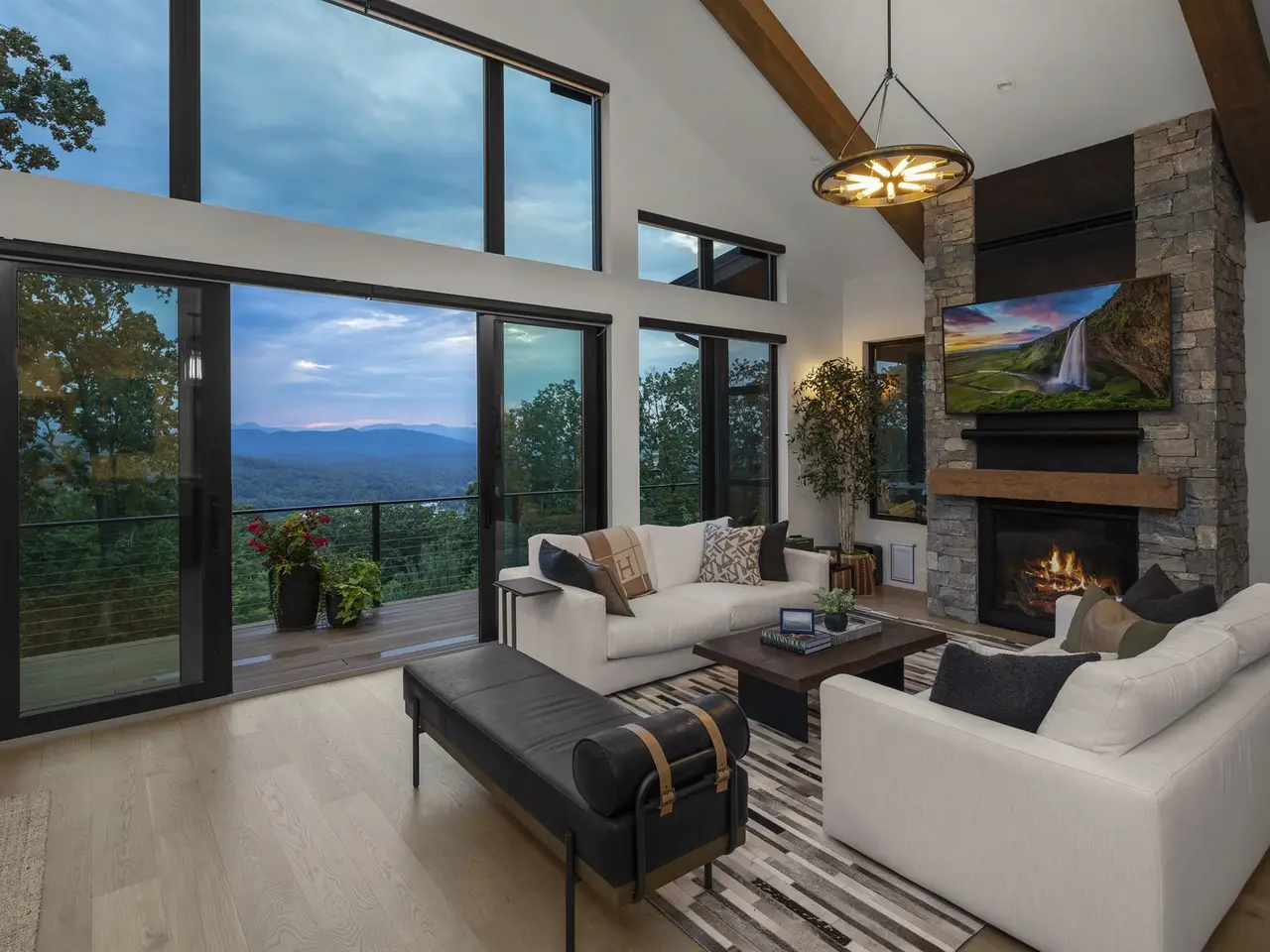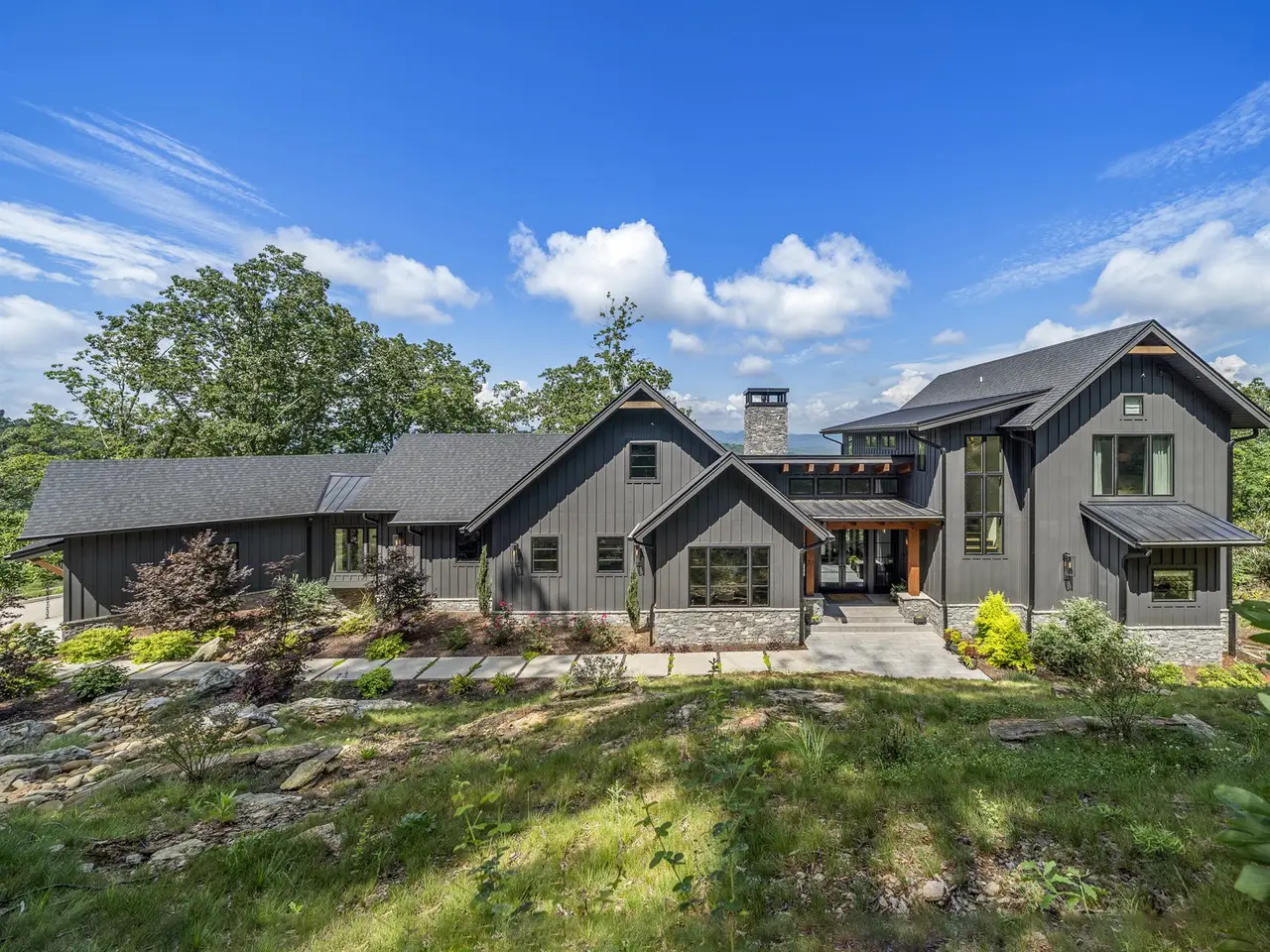 Set on over two private and gated acres, this mountain modern residence defines refined luxury. Built by an award-winning Parade of Homes builder and perfectly sited to capture long-range views of South Asheville and the Blue Ridge Mountains, the home offers complete privacy while just two miles from groceries, fitness, and conveniences. Featuring main-level living and green-built efficiency, it's an ideal primary residence or effortless second home. Floor-to-ceiling windows fill the interiors with natural light and frame breathtaking mountain views. Open living areas flow seamlessly to outdoor spaces for entertaining or a quiet retreat. With three bedrooms and three-and-a-half baths, this home blends craftsmanship, comfort, and style while creating a private, sustainable, and elegant mountain sanctuary.