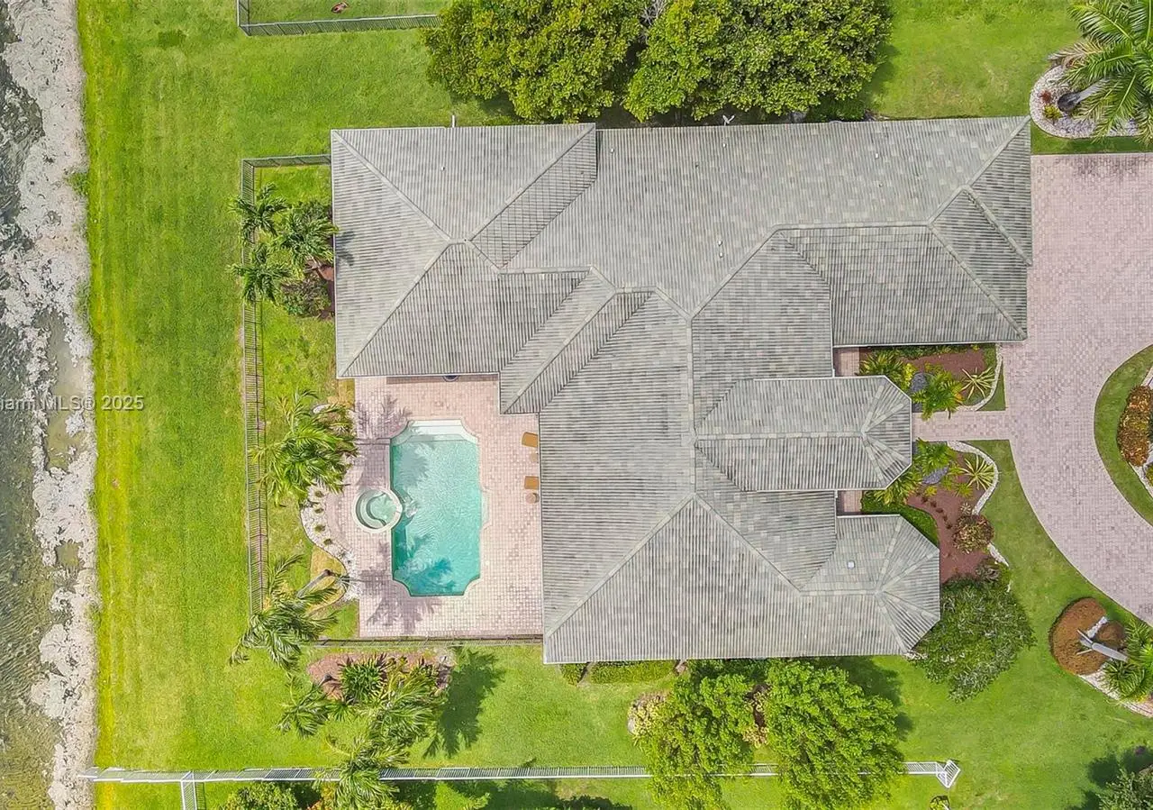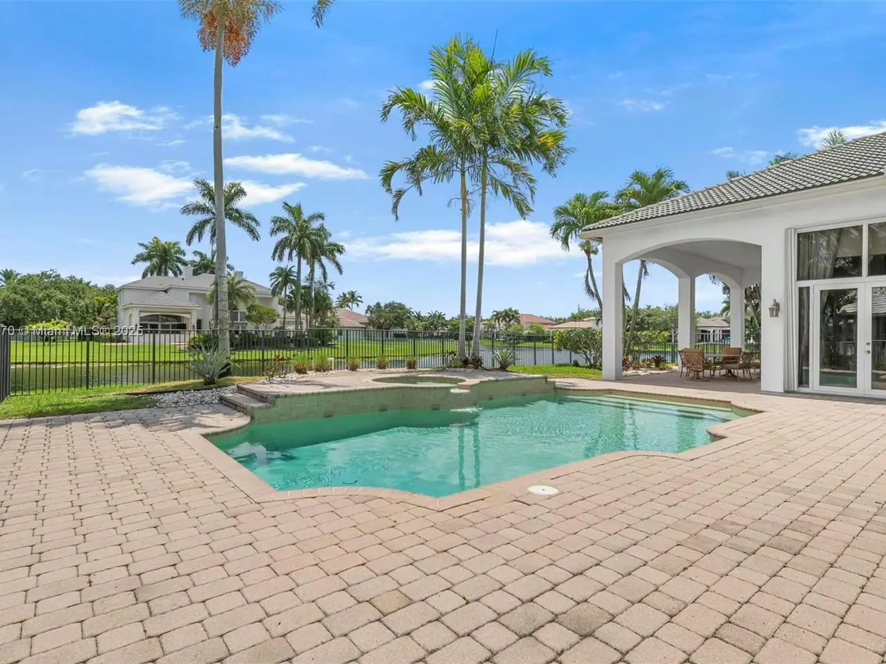 Beautifully paved backyard oasis with pool and serene lake views