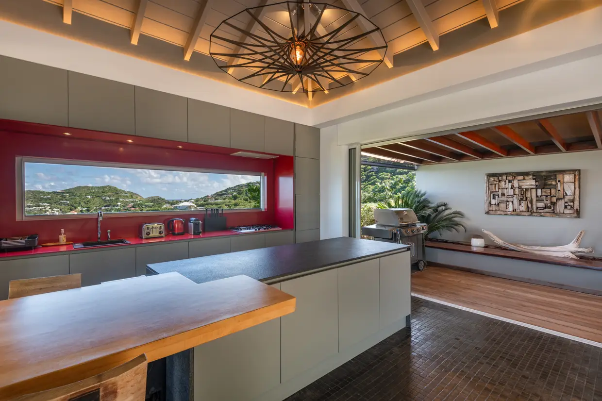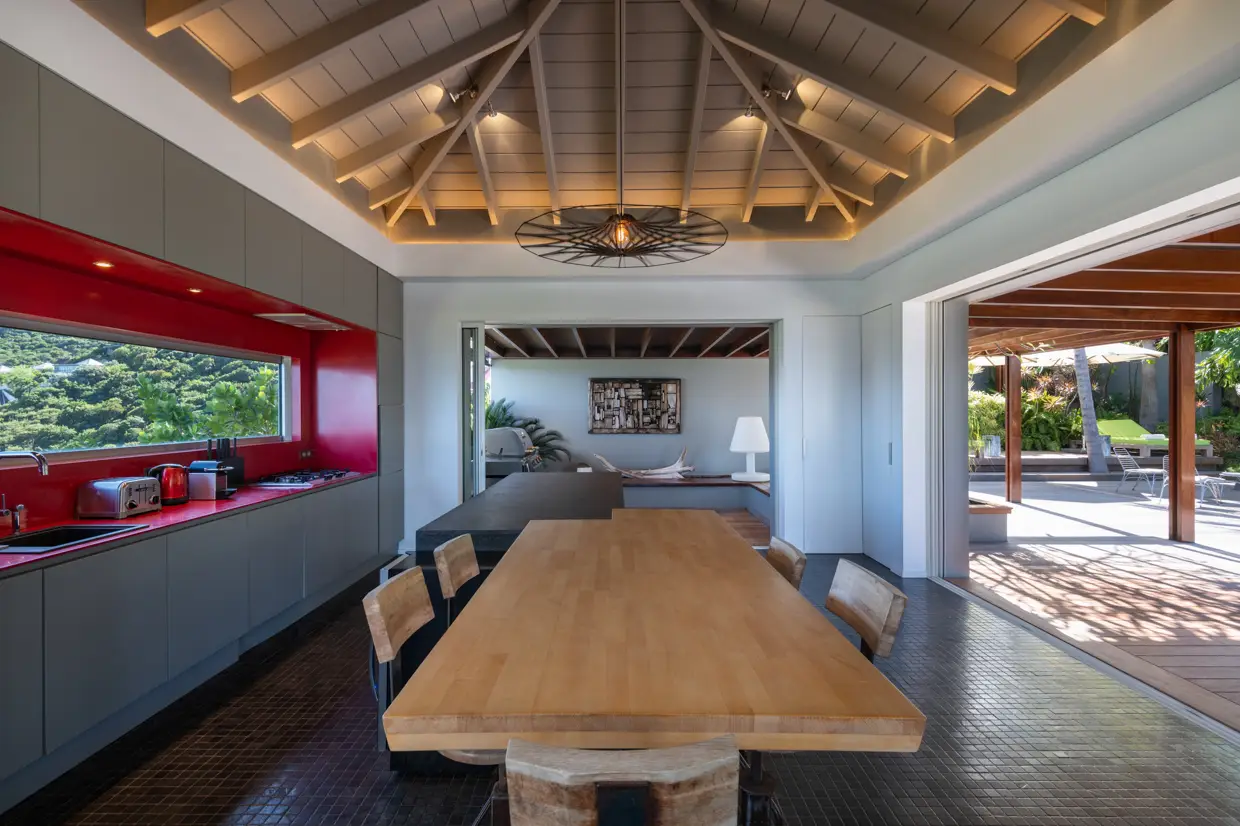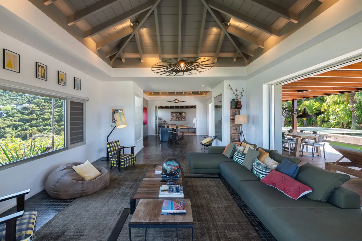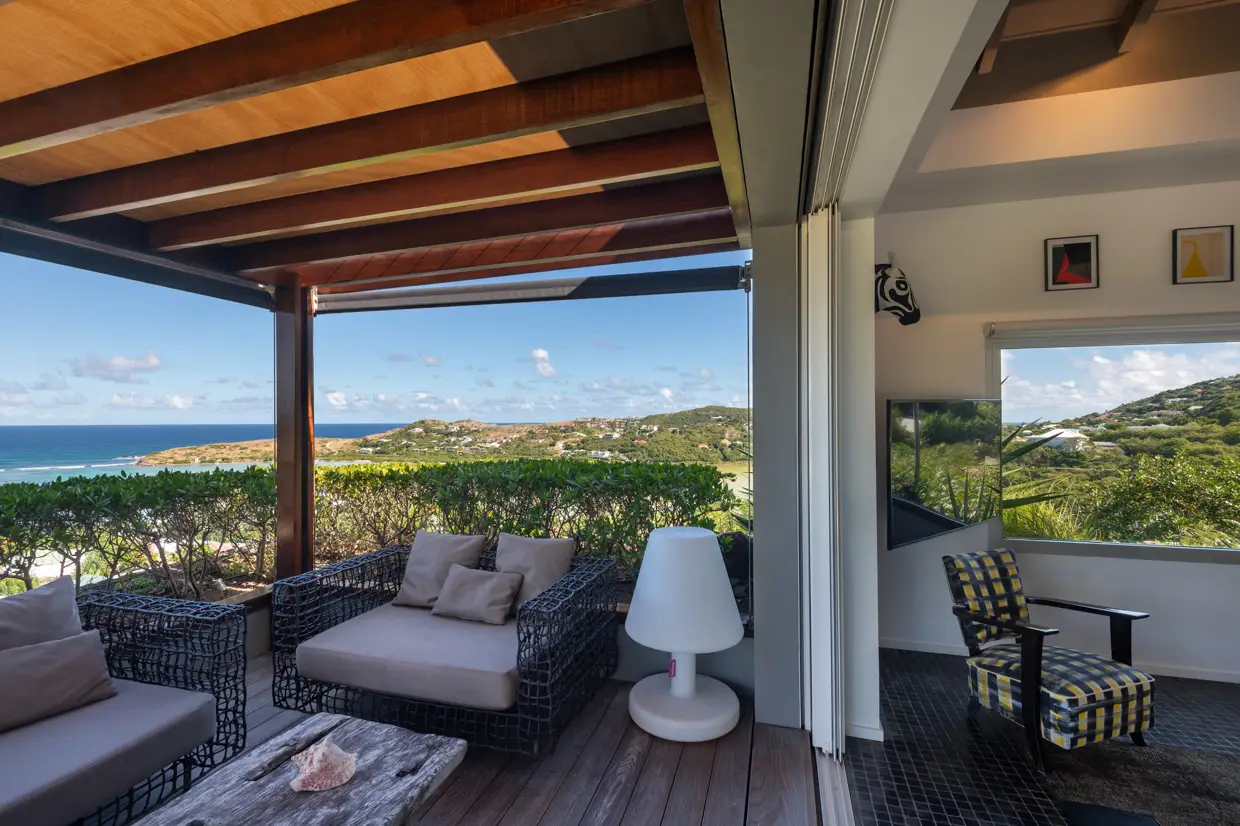 Combining modern architecture and St Barth inspiration, villa Imagine, designed by architect Johannes Zingerle, fits perfectly into its environment through the use of wood and natural tones. The property, fully open to the outside and soothed by the trade winds, is surrounded by beautiful tropical plants providing a soft tranquility to the place. The villa stretches along the beautiful pool and its deck, ideal for a relaxing afternoon or evening with friends. The living room extends onto the kitchen where the modern decor and colorful ethnic touches evoke the desire to travel. At the back, there are two bungalows housing three bedrooms and their contemporary ensuite bathrooms. There are numerous areas to relax inside and outside which are perfect for escaping to and for allowing you to enjoy the view of the Atlantic ocean and the surrounding bays. A large car park at the entrance of the property completes this beautiful setting. Villa Imagine also has a valid building permit, allowing for the creation of three additional bedrooms with a shared kitchen.