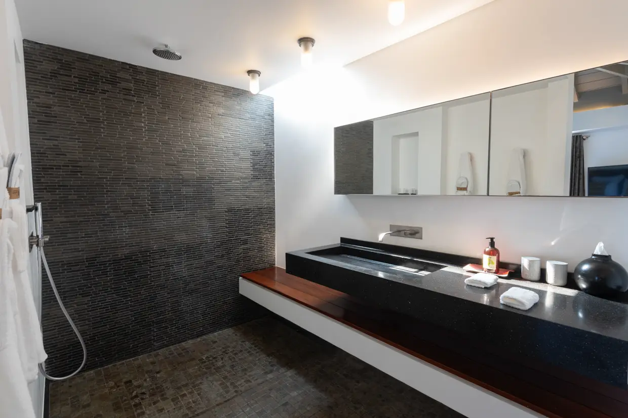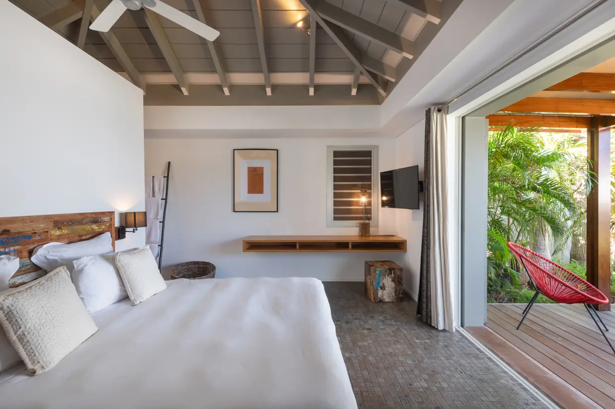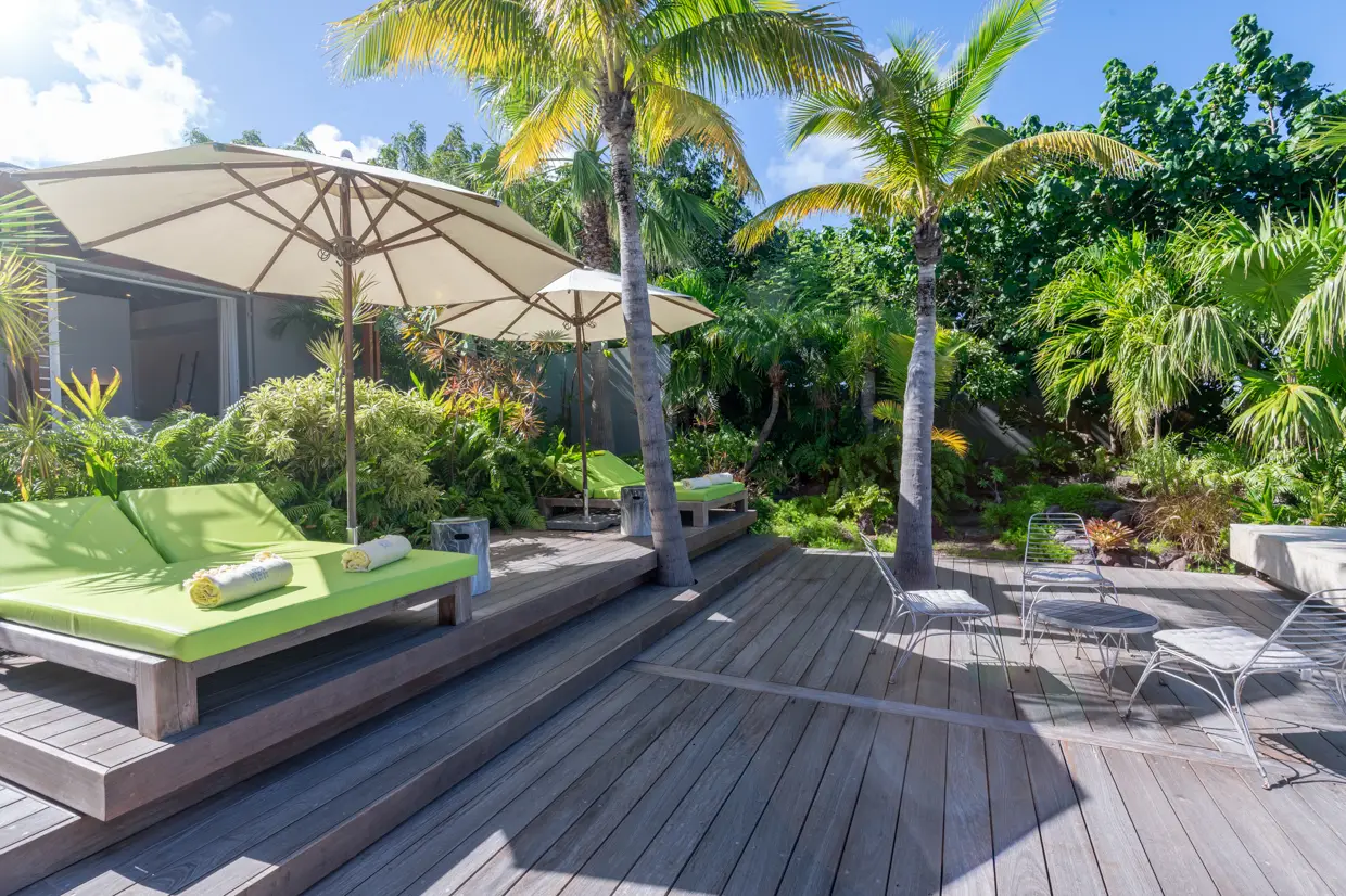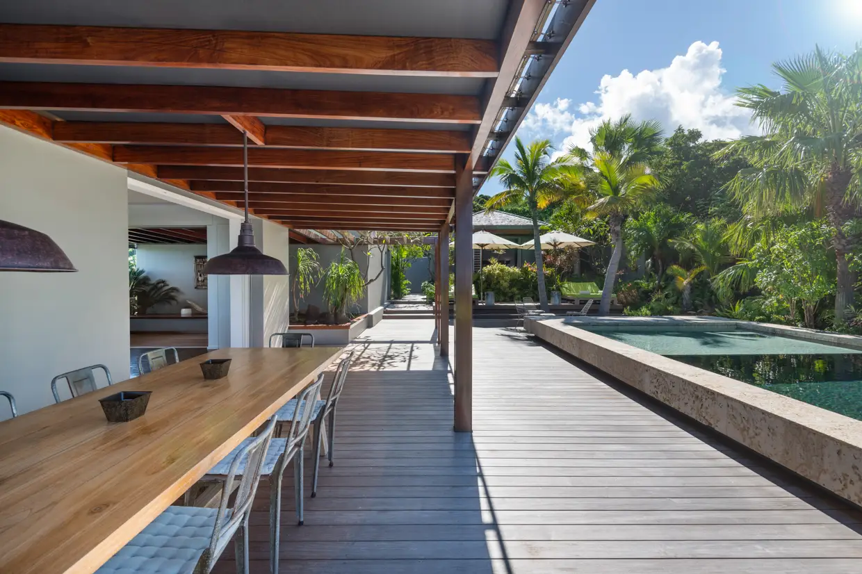 Combining modern architecture and St Barth inspiration, villa Imagine, designed by architect Johannes Zingerle, fits perfectly into its environment through the use of wood and natural tones. The property, fully open to the outside and soothed by the trade winds, is surrounded by beautiful tropical plants providing a soft tranquility to the place. The villa stretches along the beautiful pool and its deck, ideal for a relaxing afternoon or evening with friends. The living room extends onto the kitchen where the modern decor and colorful ethnic touches evoke the desire to travel. At the back, there are two bungalows housing three bedrooms and their contemporary ensuite bathrooms. There are numerous areas to relax inside and outside which are perfect for escaping to and for allowing you to enjoy the view of the Atlantic ocean and the surrounding bays. A large car park at the entrance of the property completes this beautiful setting. Villa Imagine also has a valid building permit, allowing for the creation of three additional bedrooms with a shared kitchen.