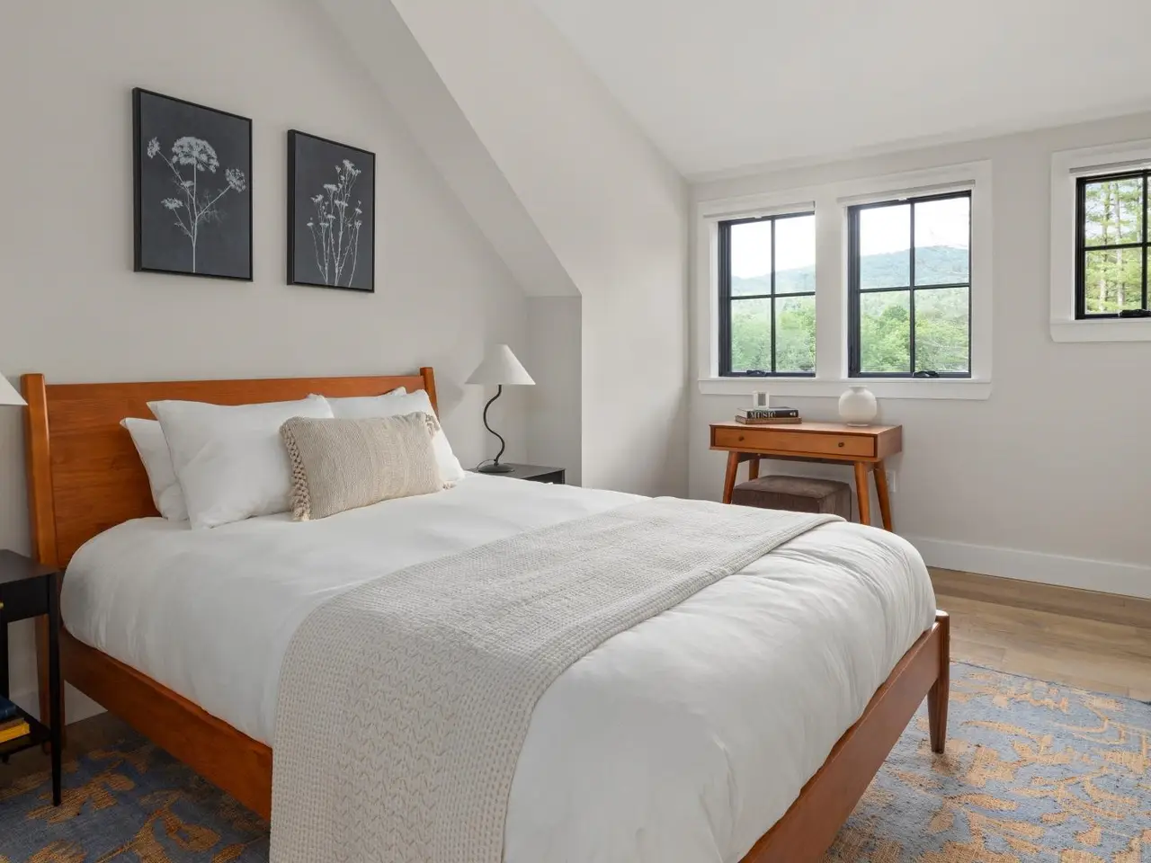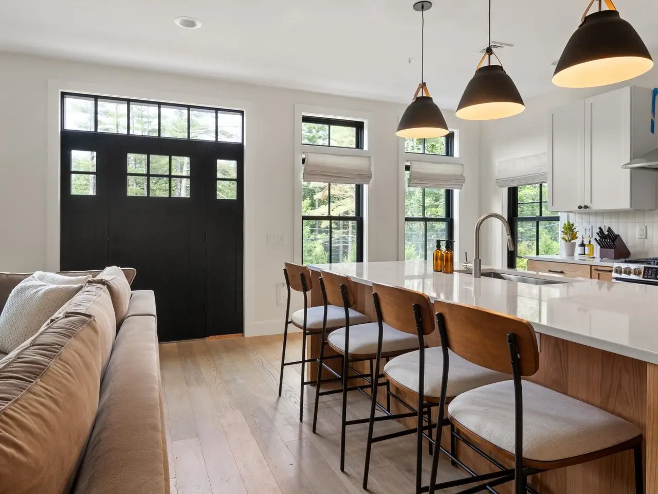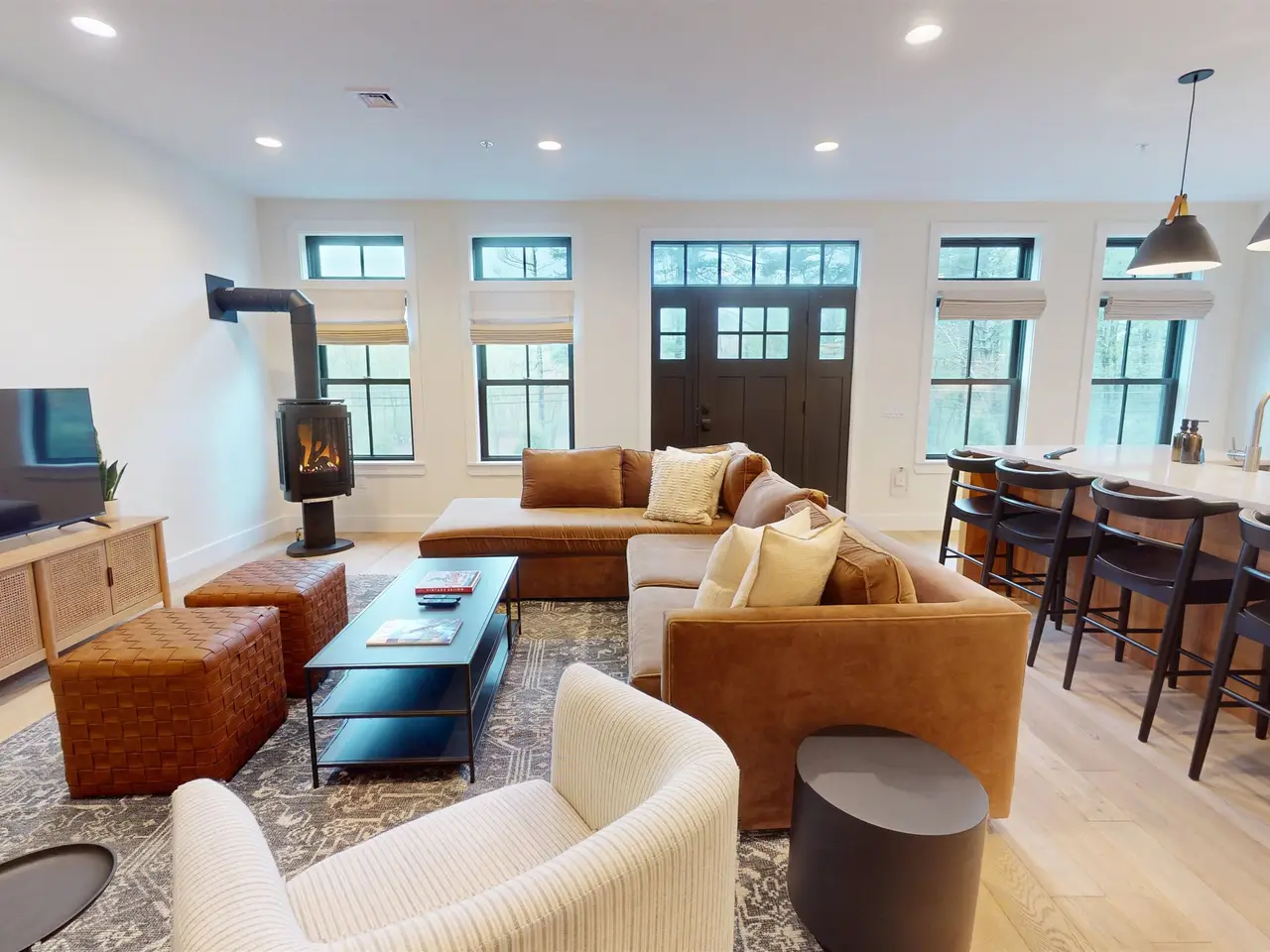 4 Bedrooms 3 ½ baths, 3,390 sq. ft., including a 1-car garage and additional ski sharpening/storage room. Fully furnished for own use or short term rentals. Middle unit looks west over the West Branch and Rec Path to Trapp Hill ridgeline and up the Mountain Road to the slopes at Stowe Mountain Resort. Features include high ceilings throughout, central AC, heat pump with propane back up. The open kitchen-dining creates a great entertaining space with seating for 12. Walk-in pantry. Living room has Jotul gas fireplace. The primary suite features 10’ cathedral ceilings a soaking tub and shower. Lower level features high ceilings, 3/4 bath, 4th bedroom and large family room. Vermont Vernacular design of The Landing, by renown architect Sam Scofield, is in keeping with the original Stowe-A- Way antique farm house dating back to the 1800’s. Stowe Mountain Resort 4.4 miles, Stowe Village 3.2 miles, BOS 3:15, BTV 45 minutes. On Mountain Shuttle bus route for easy access to Stowe Mountain Resort and Stowe Village. The Recreation Path is across the street. The Landing sits on 2.5 acres with over an acre of Common Area for homeowners, their families and guests to use for recreation, picnics, dog walking, snow shoeing and for children to play and build snow-forts. Rental history since December 2024. Appraisal projects a 10% CAP Rate for short term rentals at The Landing. The furnishings pictured may vary slightly. A complete inventory will be provided.