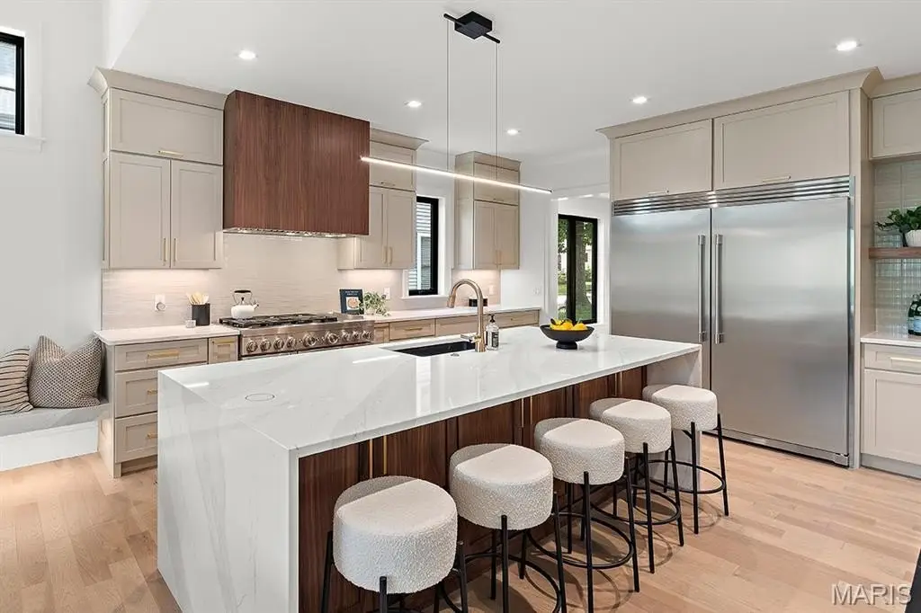 A MUST SEE! 532 South Fillmore is not your typical new build. Offering all of the space & modern conveniences you expect, it goes a step further, pushing a fresh, clean style. This 5-bedroom, 4.5-bath new build by Molner Homes offers EXCEPTIONAL craftsmanship. From sleek, clean lines to warm, refined wood finishes, thoughtful design is evident in every detail. The incredible chef’s kitchen features a large center island, quartz countertops, custom cabinetry, 6-burner gas range, & a spacious walk-in pantry. The kitchen flows seamlessly into the great room, where 12-foot ceilings, gas fireplace, & access to a large covered outdoor living area make it perfect for entertaining. The main-floor primary suite offers a private retreat w/ dual walk-in closets & a spa-like en suite bath complete w a soaking tub, walk-in shower, & dual vanities. Upstairs, bedrooms 2, 3, and 4 each have walk-in closets. One includes a private en suite, while the other two share a spacious bath. The finished lower level adds nearly 1,500 sq ft of finished living space, including a 5th bedroom, full bath, & convenient kitchenette—ideal for convenience or entertaining. Additional highlights include main-floor laundry/mudroom w/ custom built-ins, rich hardwood floors, Hardie board siding, zoned HVAC, attached 2-car garage, & huge, flat backyard perfect for a pool. Just blocks from the heart of Kirkwood including farmers market, shops, & restaurants, this home is made to impress.