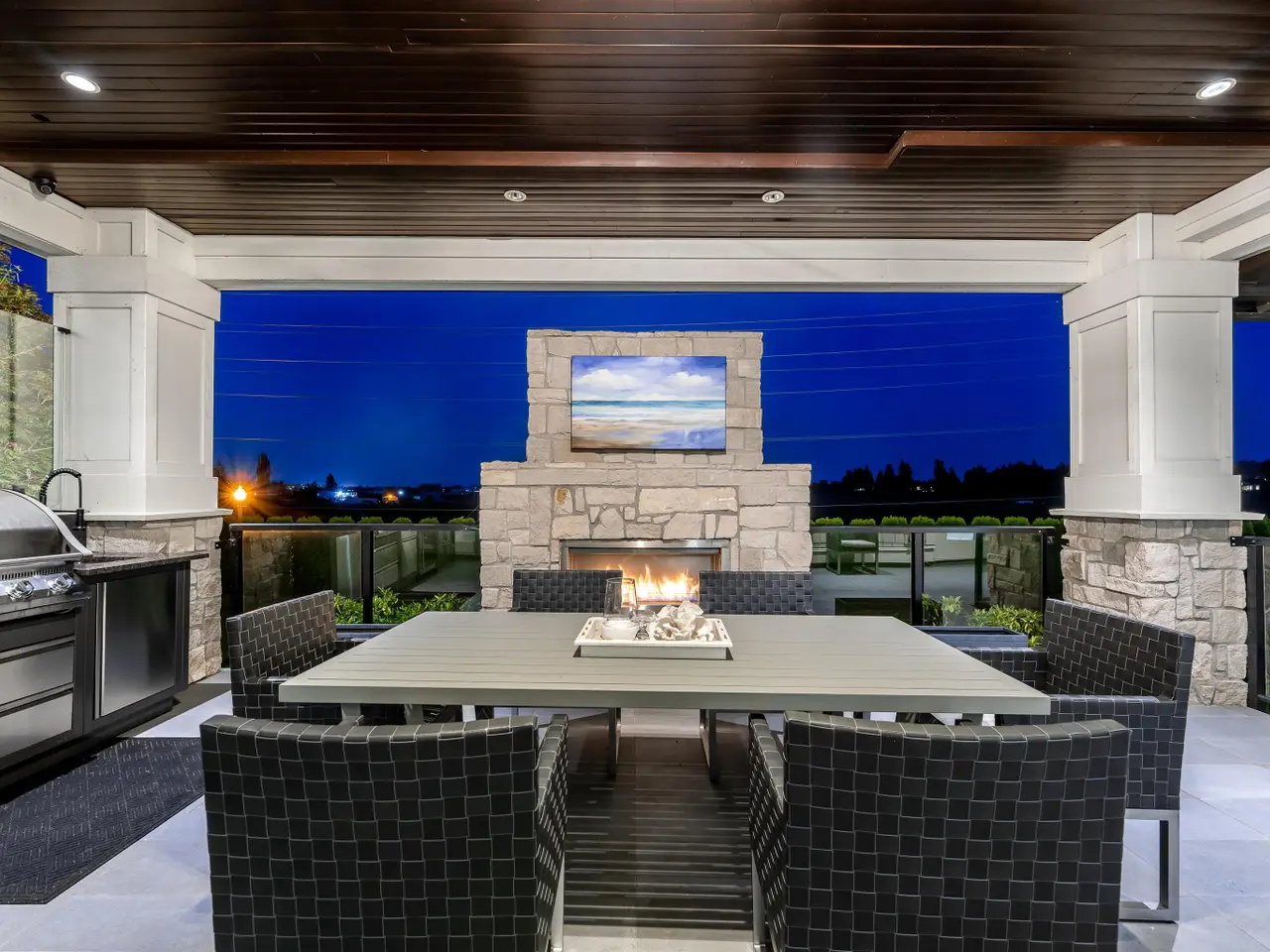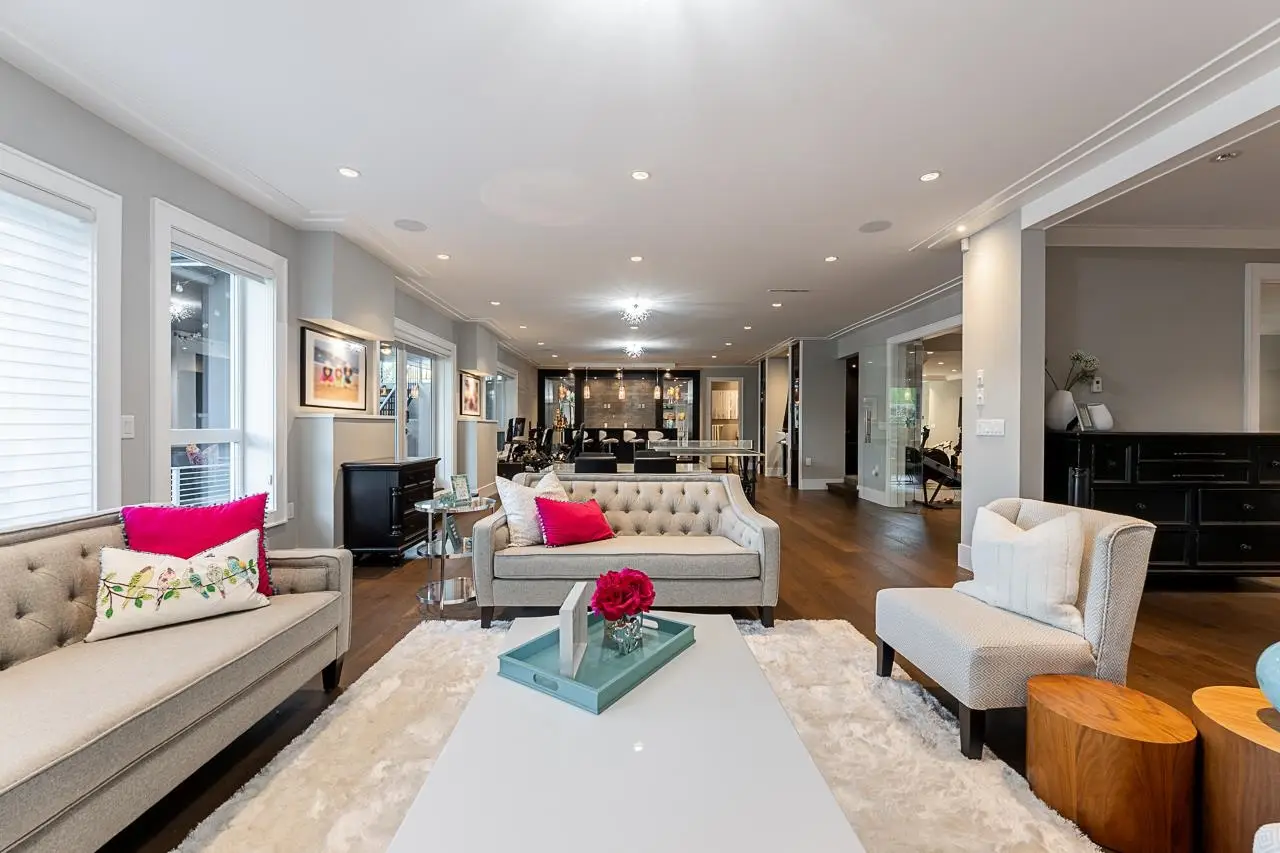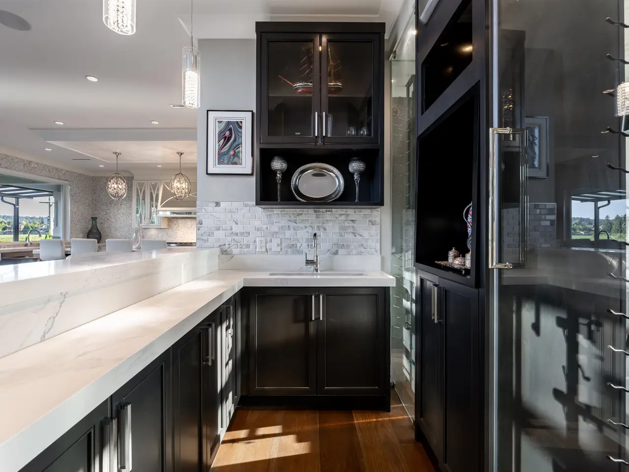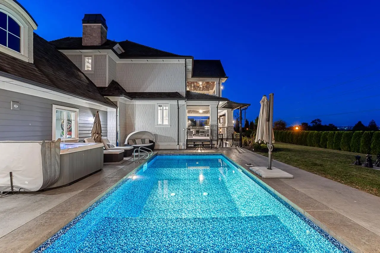 Luxurious Morgan Creek mansion situated on a beautiful and private street with every modern amenity desirable. Almost 9100 ft.² of living space on three spacious levels, this transitionally designed home is perfect for your family’s needs. Grand Foyer with cross-hall formal living in dining rooms, flows into the great room. Designer inspired kitchen with a wok kitchen and walk in pantry, and convenient wet bar for entertaining. One primary suite tucked away on the main floor, and a secondary primary suite above with 3 additional guest bedrooms. Lower level is finished with a guest wing, gym with sauna & steam, theatre, bar, and games room. Bonus detached studio, 4 car garage, in-ground pool, with a hot tub and so much more. Situated on a full half acre with mountain and farm views.