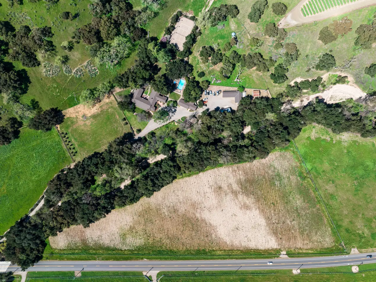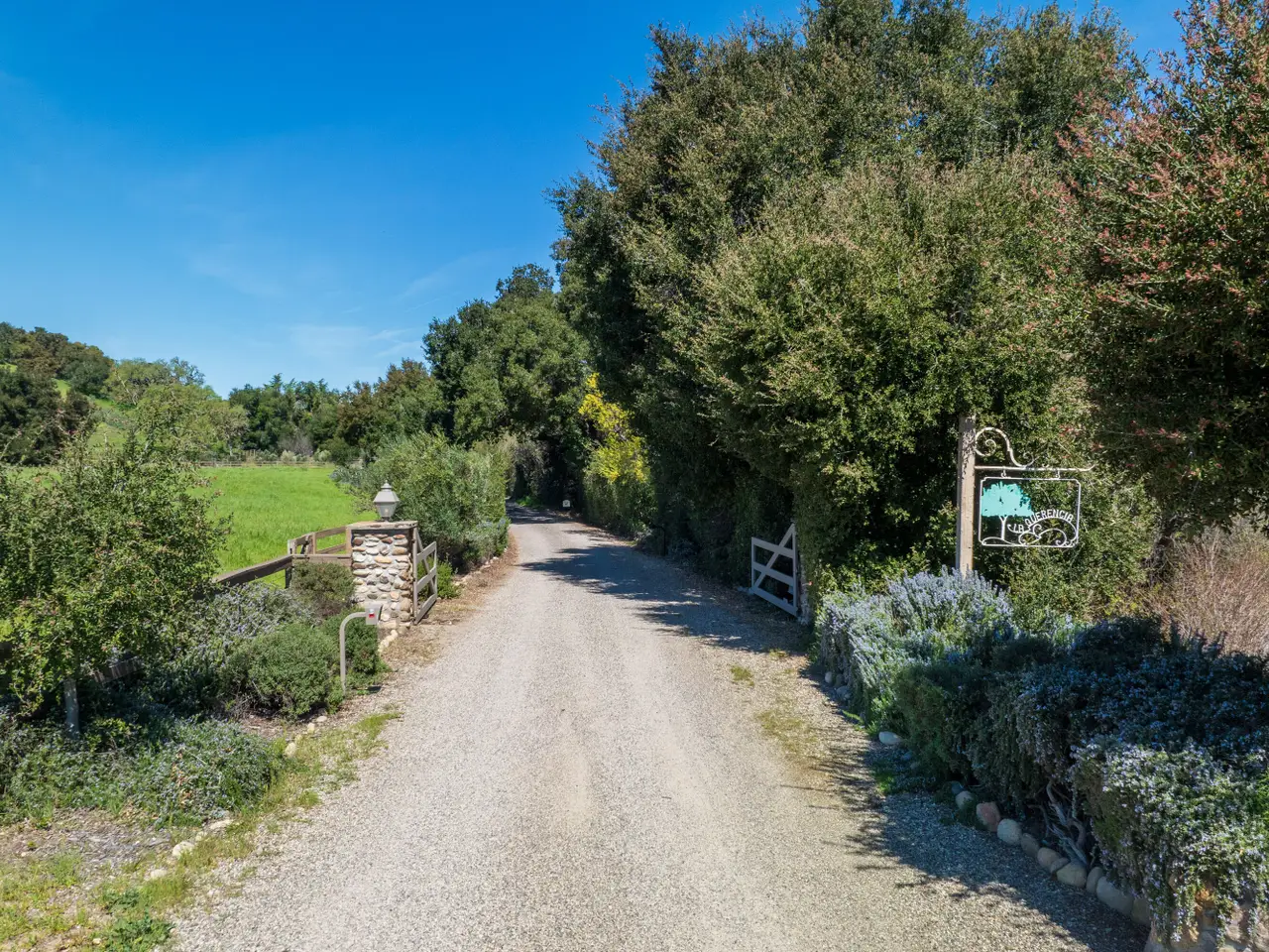 Nestled along the Alamo Pintado wine trail, this enchanting 37-plus-acre estate is located in the heart of Santa Ynez Valley, within the sought-after Ballard School District. This private retreat offers a sense of home and quality, evoking early Santa Ynez and California ranch living. The property's in-town location provides convenience, while its secluded setting among majestic old-growth oak trees ensures privacy. A gated entrance leads to a tree-lined driveway, flanked by antique stone pillars, winding over a bridge and through park-like grounds, creating a sanctuary-like atmosphere. The 1930s farmhouse is nestled amid mature trees and a seasonal creek. This classic California ranch house exudes warmth and charm, featuring a sun-filled living room with a large wood-burning fireplace... and a marvelous, screened sunroom. Over time, the home expanded to include 6 bedrooms, centered around a kitchen with a dual-sided fireplace and French doors opening to the patio and BBQ areas. A butler's pantry leads to a formal dining room and an additional screened porch, perfect for larger gatherings. The home retains much of its original charm, including hardwood floors, brick fireplaces, tongue-and-groove ceilings, and French doors, while blending old-world charm with modern comforts. The house is complete with a two-car garage, two additional covered car spaces, and an office. The estate also features a detached one-bedroom guest house, stables, barns, and two front pastures. Seventeen acres of land on the upper plateau offer opportunities for vines, pastures, or natural preservation. The outdoor amenities include a sparkling swimming pool, spa, tri-tip BBQ area, and tennis/pickleball court, all set against a backdrop of stunning natural beauty. Positioned at the forefront of the renowned wine trail, it's just a stone's throw from the beautiful areas of Ballard, Solvang, Santa Ynez, and Los Olivos. Conveniently close to schools, specialty grocery stores, award-winning bakeries, local coffee shops, boutiques, and prized restaurants, this property offers both tranquility and accessibility.