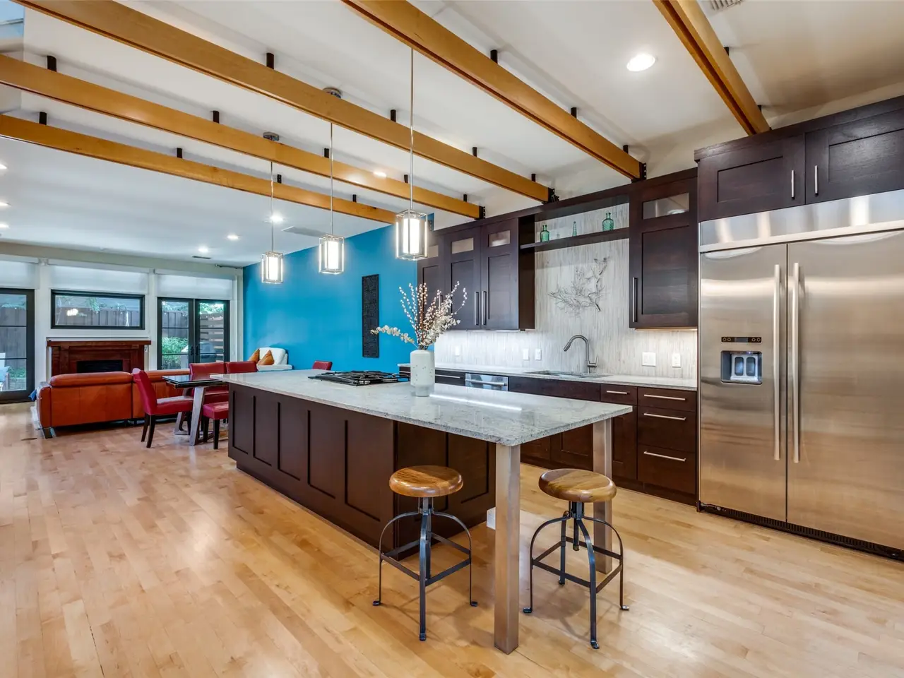 Incredible location meets modern luxury in Northern Hills! Just steps from Turtle Creek, Old Highland Park, Uptown, and The Katy Trail, this sleek custom half-duplex combines style, comfort, and convenience. A gated courtyard entry welcomes you into bright and open first-floor living and dining spaces with soaring 12-foot ceilings. The chef's kitchen boasts top-of-the-line appliances, a built-in 48-inch refrigerator, and a butler's pantry with a wine fridge - perfect for entertaining. Enjoy cozy evenings by the fireplace or relax on the spacious outdoor patio. Upstairs, the impressive primary suite features vaulted ceilings, a spa-worthy marble bath and a generous living area. A private guest suite with an en-suite bath completes the second floor. The third floor has a bedroom-office with a wet bar, full bath, and an expansive rooftop deck with a hot tub which showcases the best of Dallas living. Own a custom modern home in a premier location.