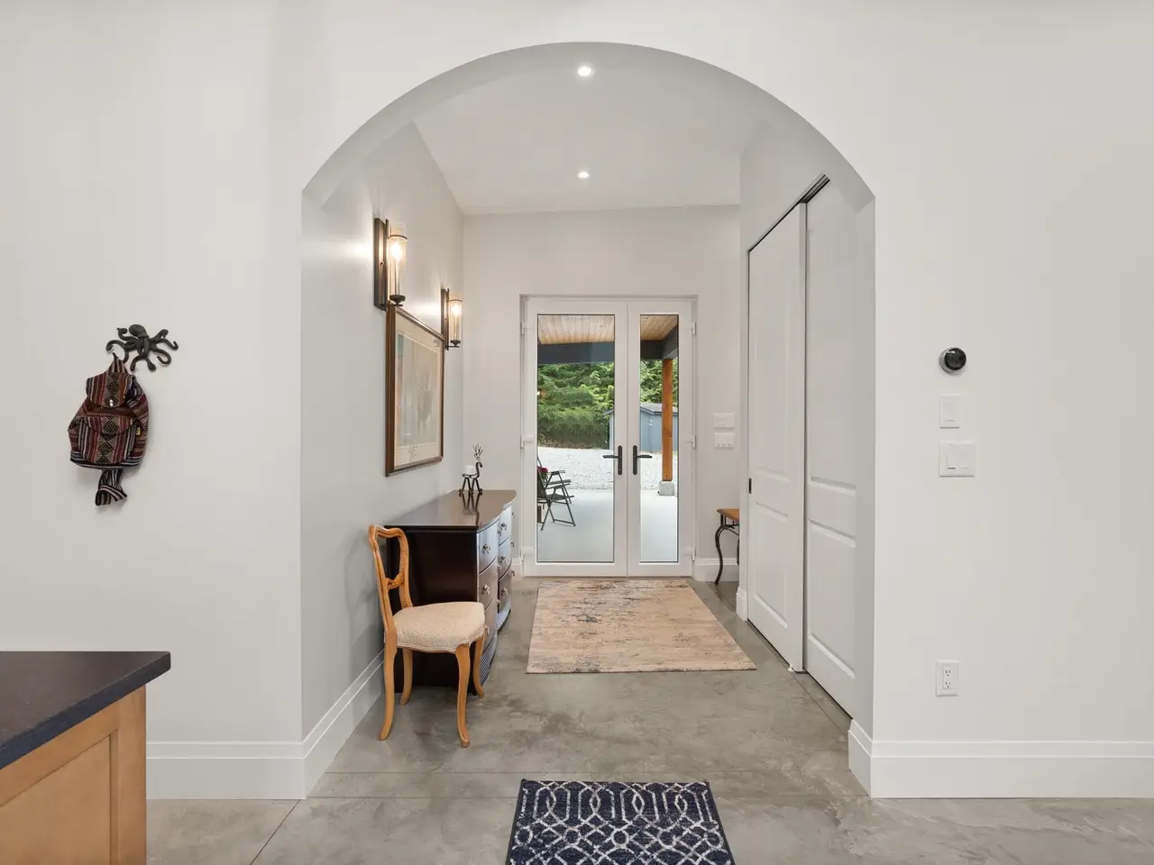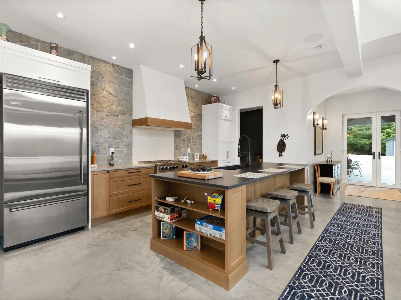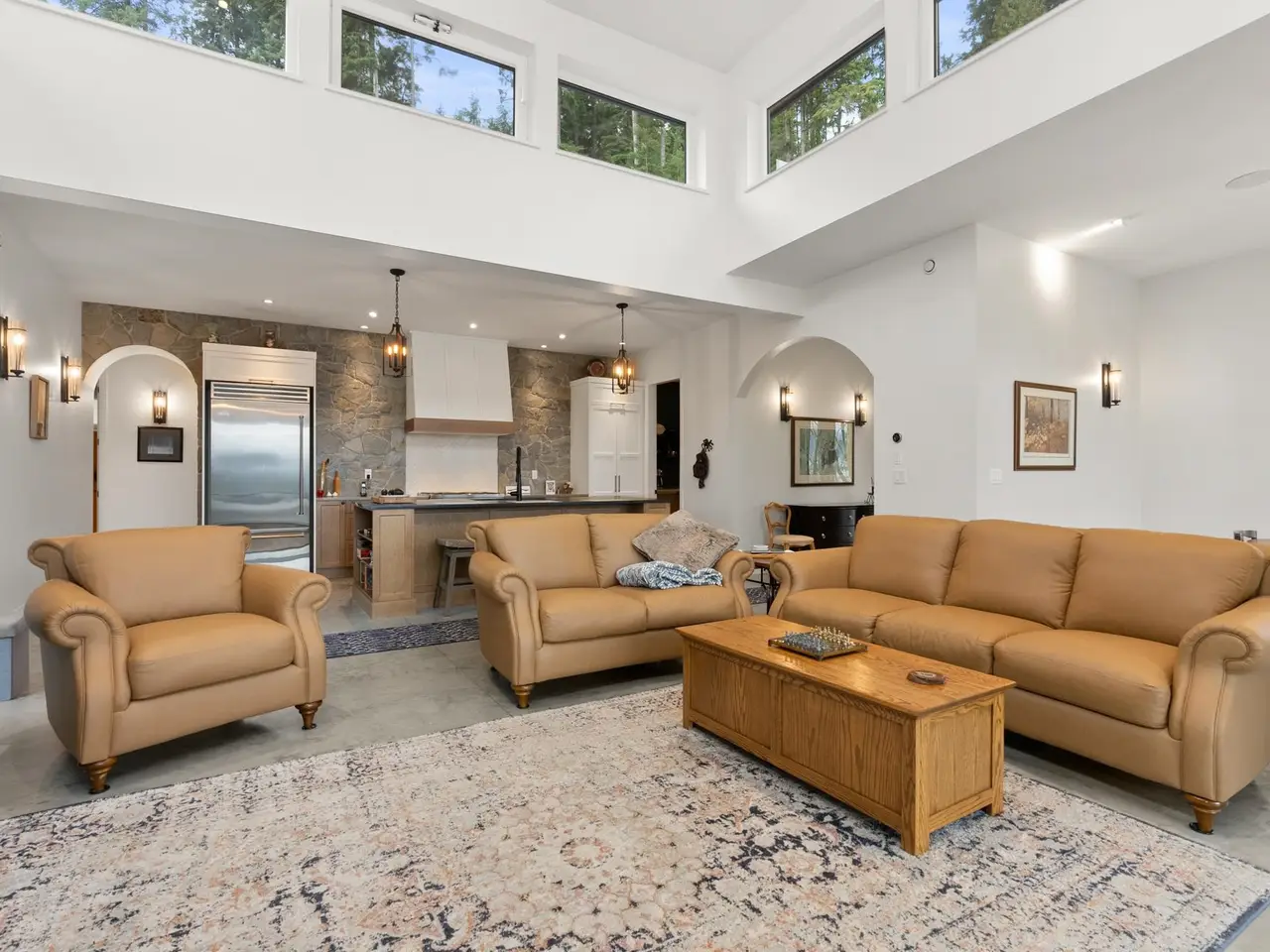 Spectacular views from quality custom-built rancher at end of private road into 4.94 acres. Polished cement floors, 9’ to 12’ ceilings, European tilt and turn windows, custom stonework and arched doorways. Bright gorgeous kitchen, huge island, quartz counters, maple cabinets, Blanco sinks and Kohler faucets. High end stainless steel appliances, gas stove. Large pantry, spacious primary bedroom with walk in closet, five-piece ensuite with double sinks, soaker tub and large double walk-in shower. Media Room and office, each convertible to extra bedrooms. 1500 sq ft patio with splendorous views of the Thornbrough Channel, whale and eagle watching. Two-minute foot access to 215’ of waterfront beach access for swimming and launching kayaks, paddleboards. Zoned for second dwelling and garage wired for EV.