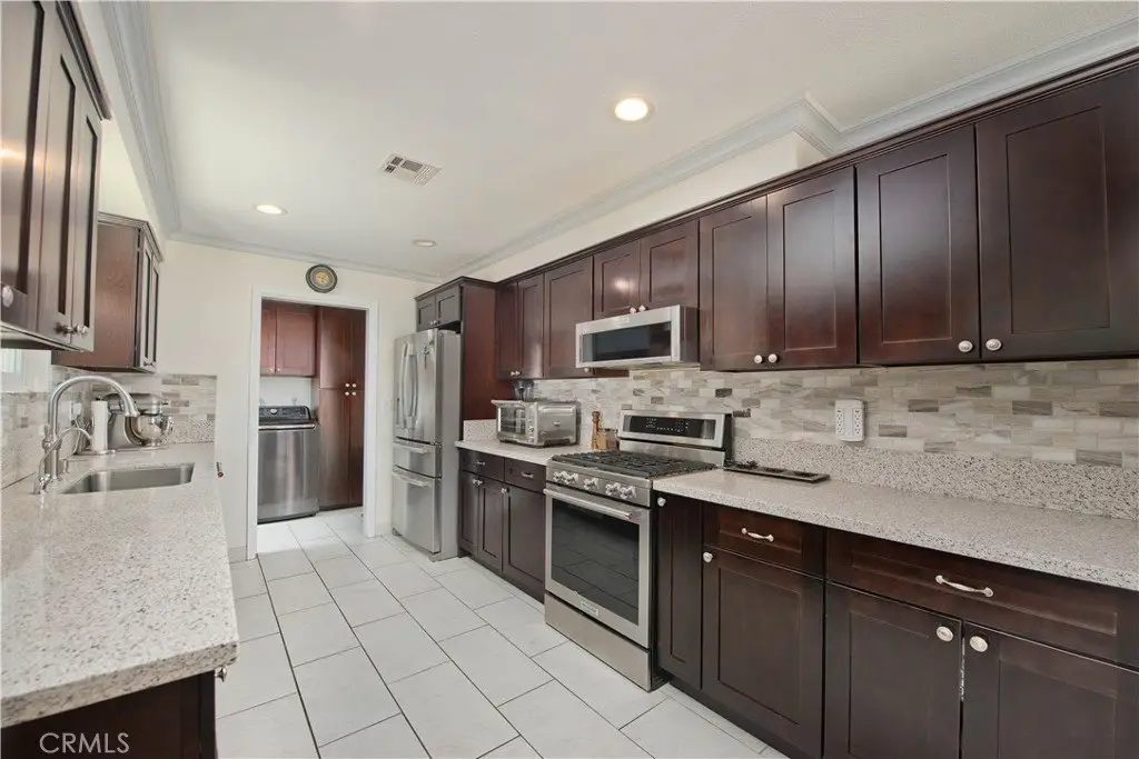 Welcome to this charming home nestled in the highly desirable North of Rinaldi neighborhood of Granada Hills. Tucked away on a peaceful cul-de-sac, this residence greets you with a classic white picket fence and an inviting front porch that sets the tone for the warmth inside. Step into a light-filled, open-concept floor plan designed for both comfort and functionality. The remodeled kitchen showcases granite countertops, stainless steel appliances, and soft-close cabinetry, with a convenient laundry room just off the kitchen. Both bathrooms have been tastefully updated, complementing the home’s modern style. Three generously sized bedrooms provide the comfort and flexibility you’re looking for. The low-maintenance backyard features a covered patio and spacious side yards, creating the perfect setting for outdoor entertaining or relaxation. Additional highlights include newer dual-pane windows and sliding glass door, updated flooring, crown molding, recessed lighting, smooth ceilings, durable vinyl fencing, and more. This home blends timeless charm with thoughtful upgrades—ready for you to move right in and enjoy.