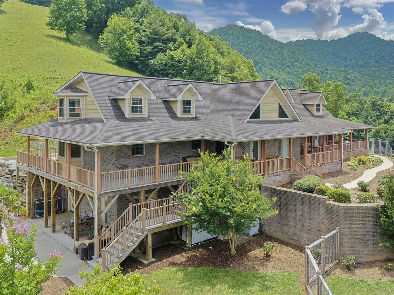 Atop 56+ picturesque acres in Fines Creek, this expansive estate offers unparalleled amenities. Boasting long-range views, an in-ground saltwater pool w/a cascading waterfall, an outdoor firepit, fenced pastures, a 3-bay detached garage w/a tractor shed, & private trails leading to a nearby creek, the property truly has it all. The traditional brick home was vastly expanded in 2007, featuring a grand foyer, a 2-story great room w/vaulted ceilings & a beautiful fireplace, a primary suite w/a gas fireplace, a bay window, a granite double vanity, a jetted tub, & a large walk-in shower, as well as 2 large BR suites on the upper level & an updated laundry room. The original section boasts 1 BR/1 bath on the main level, + a bonus room & bath upstairs, a dining room w/vaulted ceilings, a loft, and a kitchen equipped w/granite countertops, like-new appliances, a wine cooler, and a walk-in pantry. The fully-finished basement w/a full bath and a rec room flows effortlessly out to the pool deck.