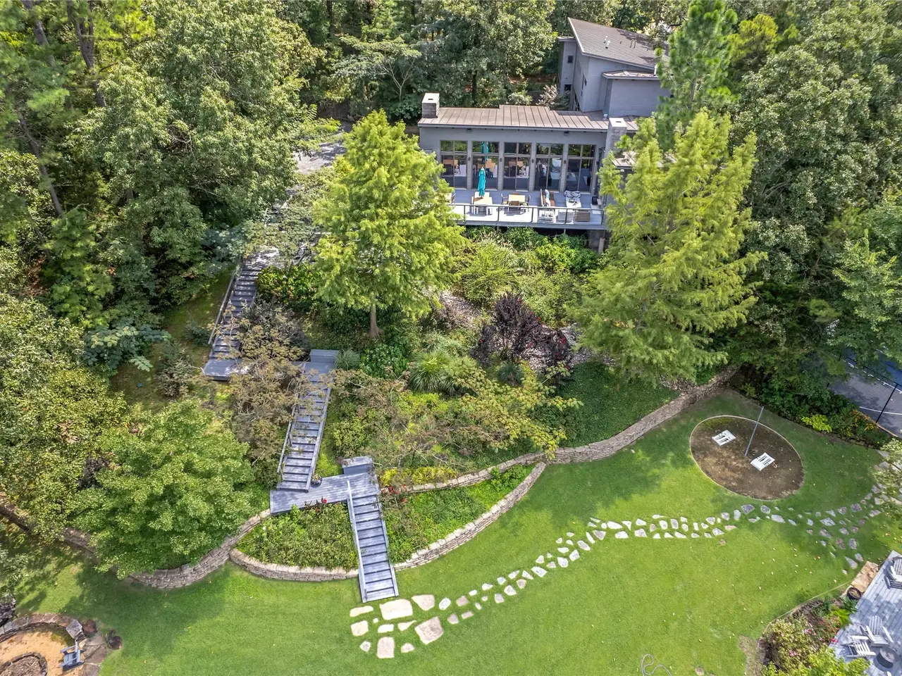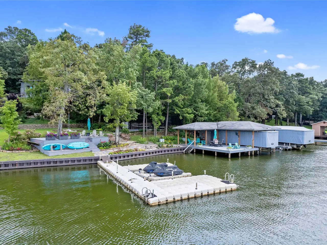 LARGE ESTATE on beautiful Lake Cypress Springs nestled among the trees with over 20 acres and a beautiful guest house. The gated entrance leads you to one of the largest lots on the lake with a contemporary custom home designed by the well-known architectural firm of Barry Bull Ballas. The expertly designed main home features 4 bedrooms and 5.5 baths, with an exterior combination of stone, zinc, and hardy plank, producing a timeless home unlike any other lake house in the area. Nestled among the towering trees and perfectly oriented on the land to maximize the views of the lake with over 450 ft of lake frontage, this home exudes sophistication from the minute you walk along the expertly landscaped entrance to the time you walk out to the deck ideal for entertaining, including a fireplace, pizza oven, and grill. The property boasts an array of recreational options. Sport court ideal for pickleball, basketball, foursquare, shuffleboard and badminton, tetherball, spa, etc. Multiple boat docks, including an automatic lift and cover for a ski boat and pontoon boat, an additional slip for a sailboat and a floating dock for swimming and additional watercraft. There is a beautifully designed fire pit that overlooks the lake and beach area. The expertly landscaped and sprinklered grounds surround the home and lakefront with multiple areas to entertain. The List Price includes the following: 2011 Sun Tracker Pontoon Boat w. a 150 Mercury 4-stock engine, Kawasaki UTV 4.4 Mule, two 2021 Sea-Doo Jet Skis, three kayaks, and a paddleboard. A beautifully designed guest house is situated on 2.15 acres with an expansive deck and expert landscaping, and an entertaining space of its own. This three-bedroom, two-bath home is the ideal guest house or second residence for family or guests. This sophisticated, contemporary lake house compound is ready to enjoy and includes countless recreational options in this uniquely private setting on beautiful Lake Cypress Springs.